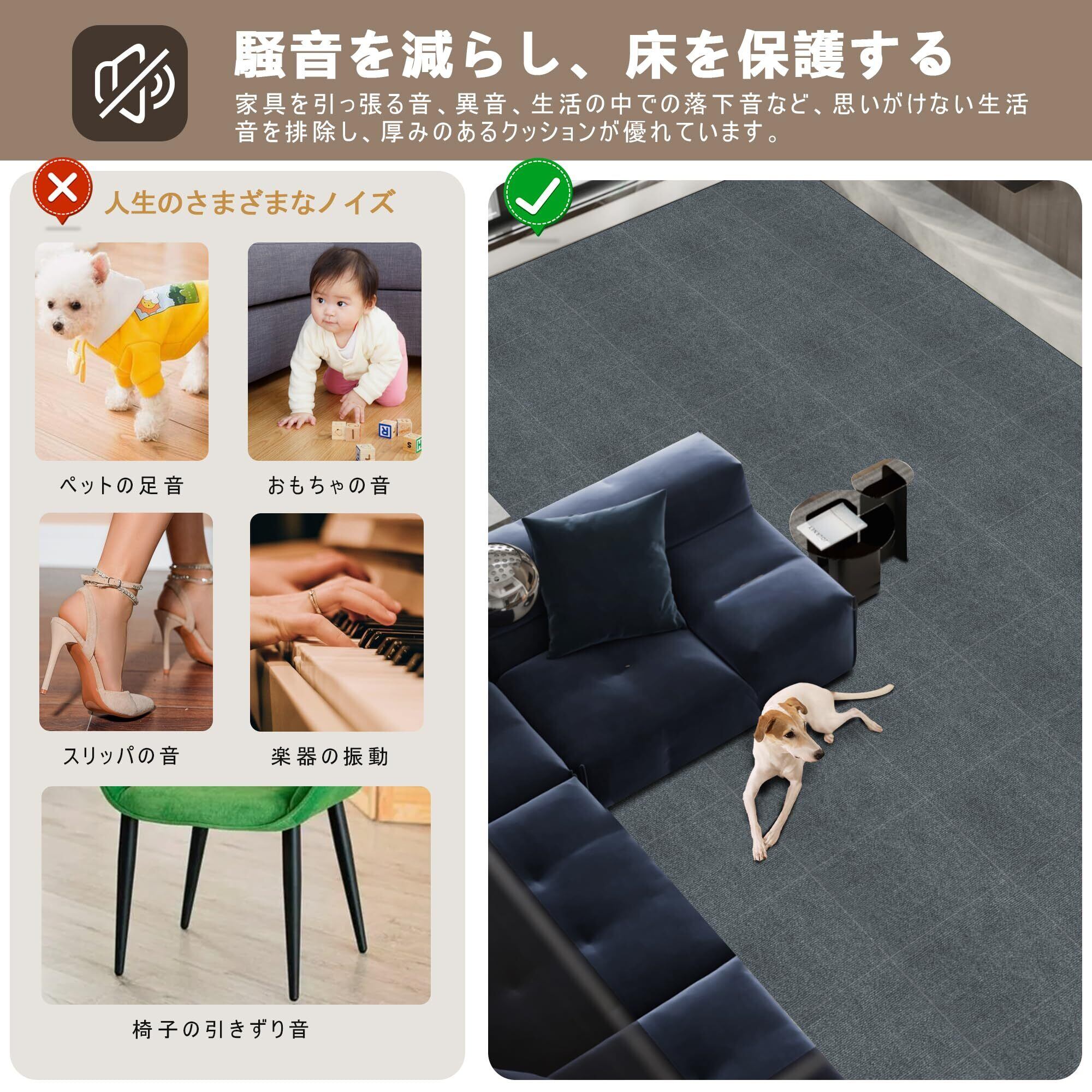 【床暖房対応・幅広い用途】床暖房の上に置けば、寒い冬でも暖かく過ごせます。 また、お部屋の大きさや形に合わせてぴったり設置できます。 また、ハサミで簡単にカスタマイズでき、部屋の隅や壁際にもぴったり設置できます。 リビングのカーペットとして、キッチンの滑り止めマットとして、玄関の汚れ防止マットとして、廊下の防音マットとしてなど、様々な場所でお使いいただけます。 賃貸のお部屋や賃貸物件でも安心してお使いいただけます。 お部屋の雰囲気を変えたい方にも使いやすく、冬は暖かく、夏は取り外して模様替えもできます。
