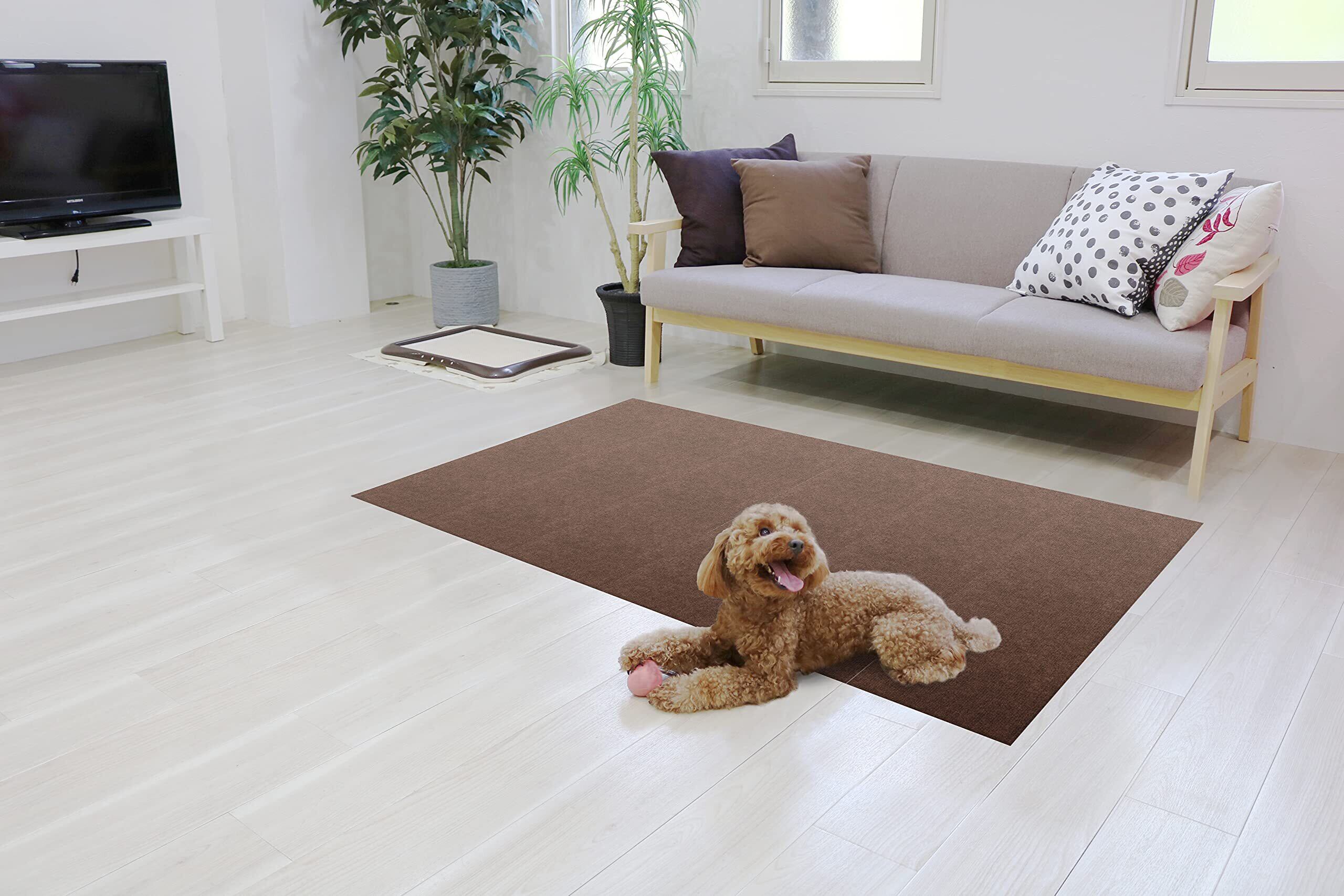 サイズ:45cm×45cm×4枚 | 色:ブラウン 【商品の特長】●裏面吸着加工でズレません。ペットが走り回っても安心! ●つなぎ合わせるだけで、ラグマットやキッチンマットとしてご使用いただけます。●汚れた場合は、そこだけはがして丸洗いOK! ●ペットの足腰への負担軽減にオススメです。●フローリングを爪キズや汚れから守ります。●繰り返し洗濯できて、吸着機能も衰えません。●ハサミやカッターで簡単にカットできるので、柱回りやでっぱりの加工も簡単! ●厚さ:4mmと薄型仕様なので、つまずきにくく、扉の開閉の邪魔になりません。●掃除機をかけても吸い上がらず安心です。【使用上のご注意】●ご使用前に裏面のフィルムをはがしてお使いください。●敷く前に必ず床面のワックス・水などをよく拭き取ってください。●床面が塩化ビニルの場合、変色または密着する恐れがあります。●フローリングの種類(合板など)によっては、床面を傷める恐れがありますのでご注意ください。●長時間敷きつめたままにしておきますと、床面に密着することがあります。時々本製品を取り外して、風通しを行ってください。●万一裏面が床に付着した時や、ご使用により床面が滑りやすくなった場合、光沢ムラ跡が残った場合は、 雑巾をぬるま湯に浸し拭き取ってください。取れないない場合は、合成洗剤で強くこすってください。生産ロットにより多少色目が異なることがあります。