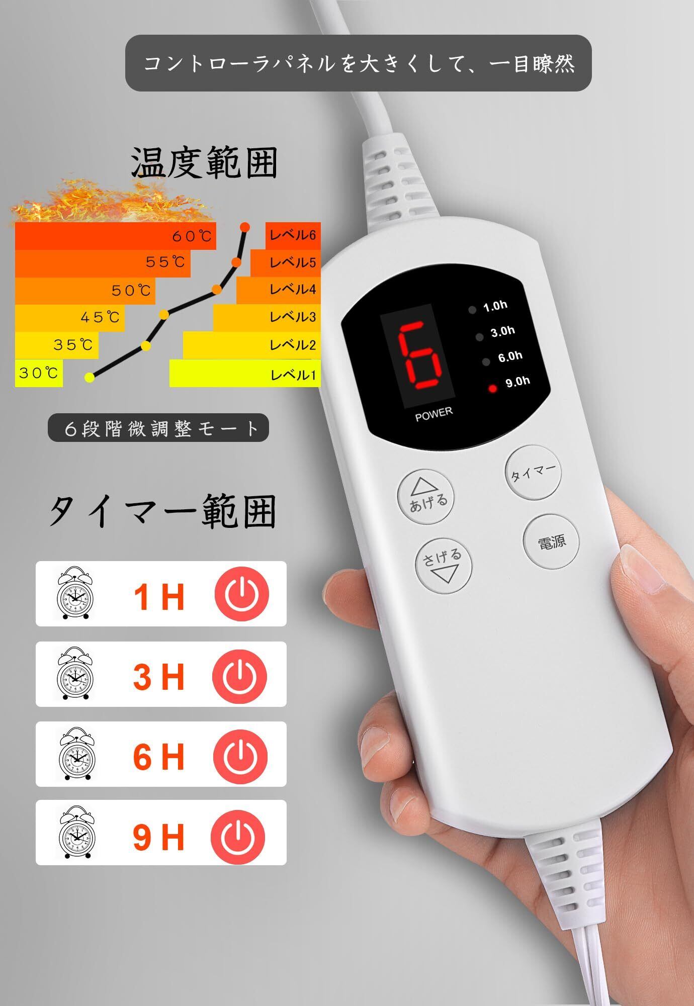 [6段階温度調整できる敷き電気マット] 温度段階を40℃~60℃の6段階に調節できます。温度が60°以上になった場合、長時間で使用すると、皮膚乾燥や低温やけどなどの恐れがあるので気を付けてください。