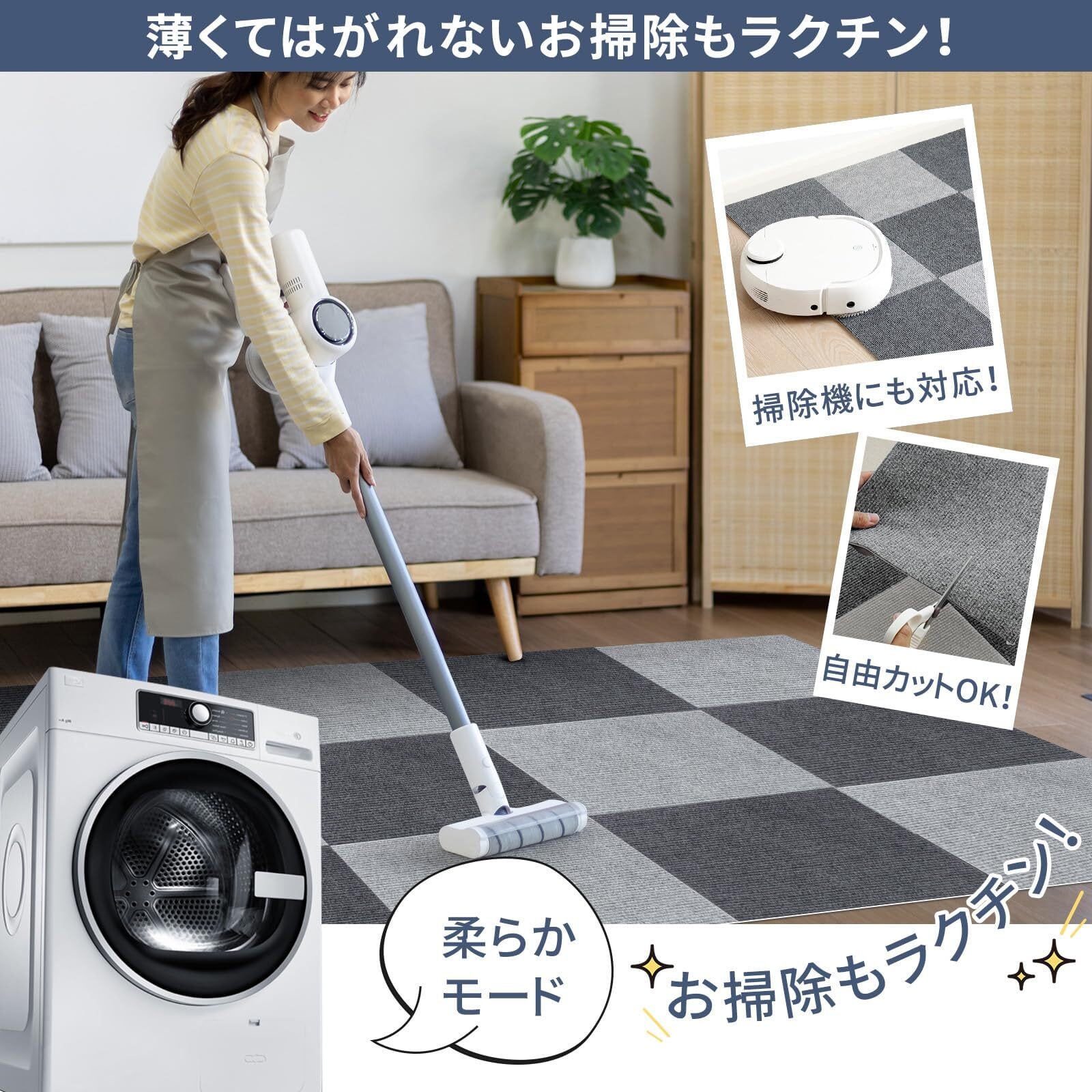 【掃除もラクラク】 床保護マットの裏面の吸着効果で、めくれ上がることがなく、掃除機やロボット掃除機にも対応しているのでお手入れ簡単。それとも、汚れた部分だけ外れして洗えます。手洗い・スポンジなどを使うとさらに効果的です。(洗濯機使用を勧めません)。