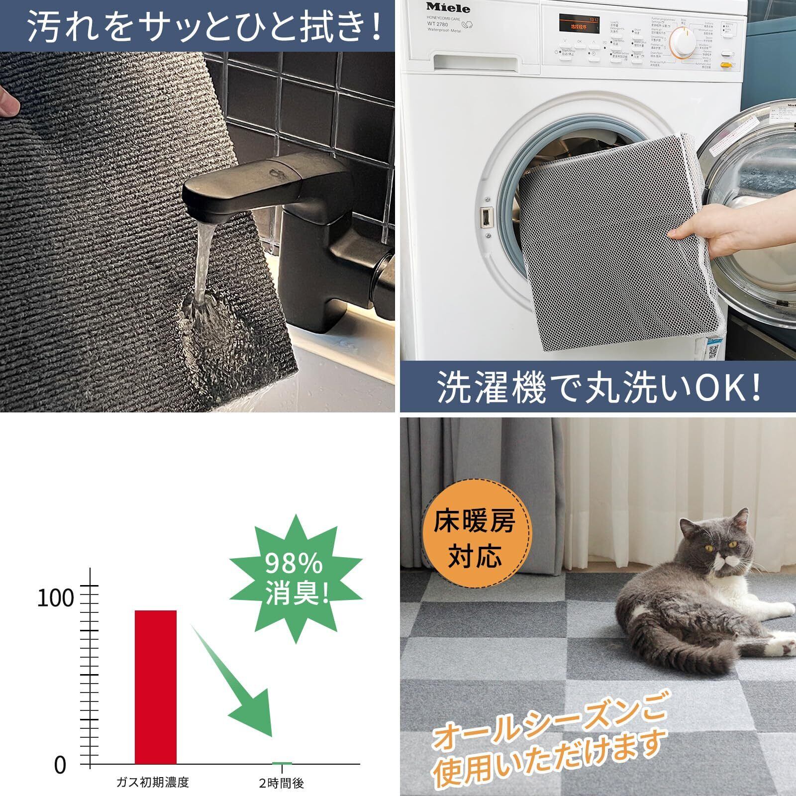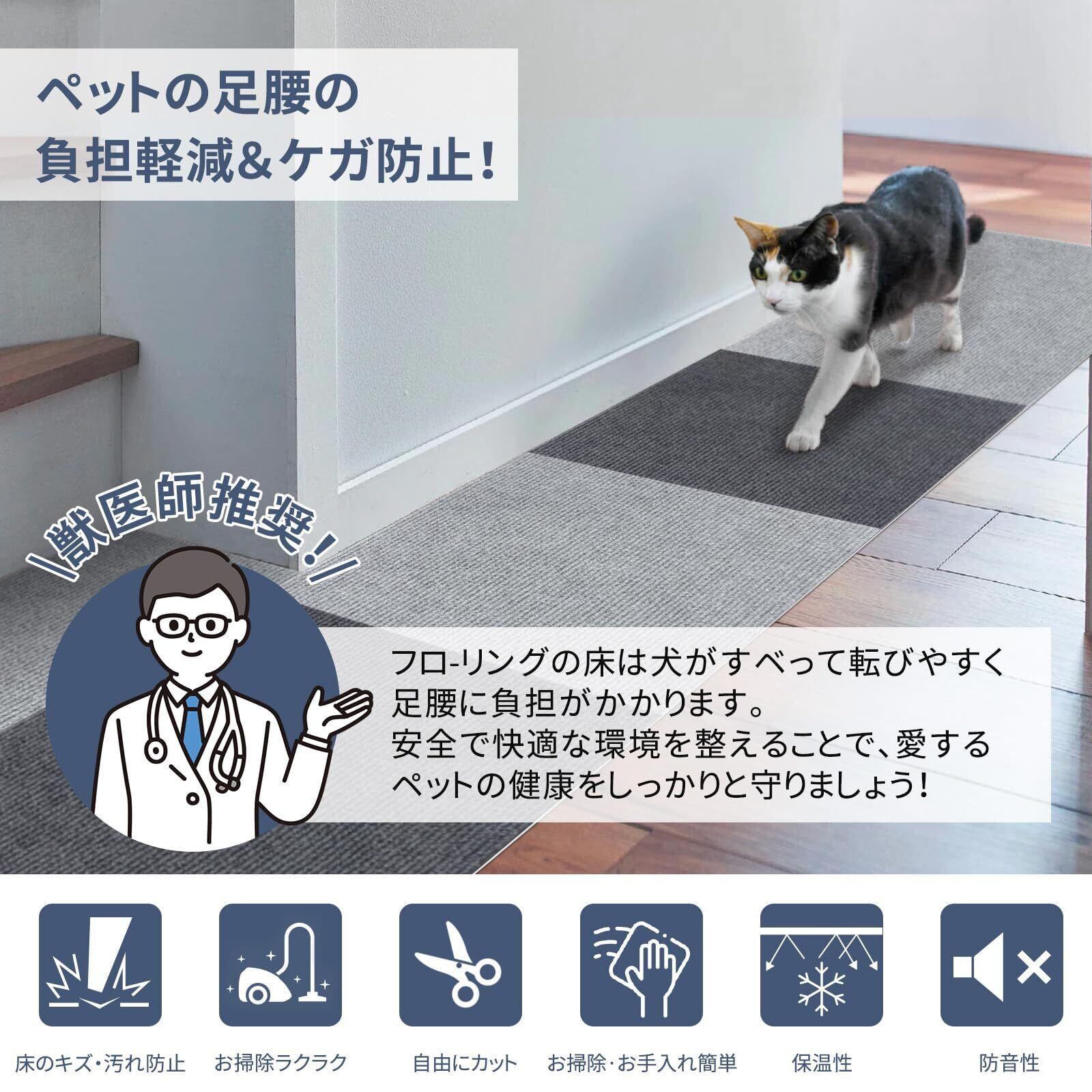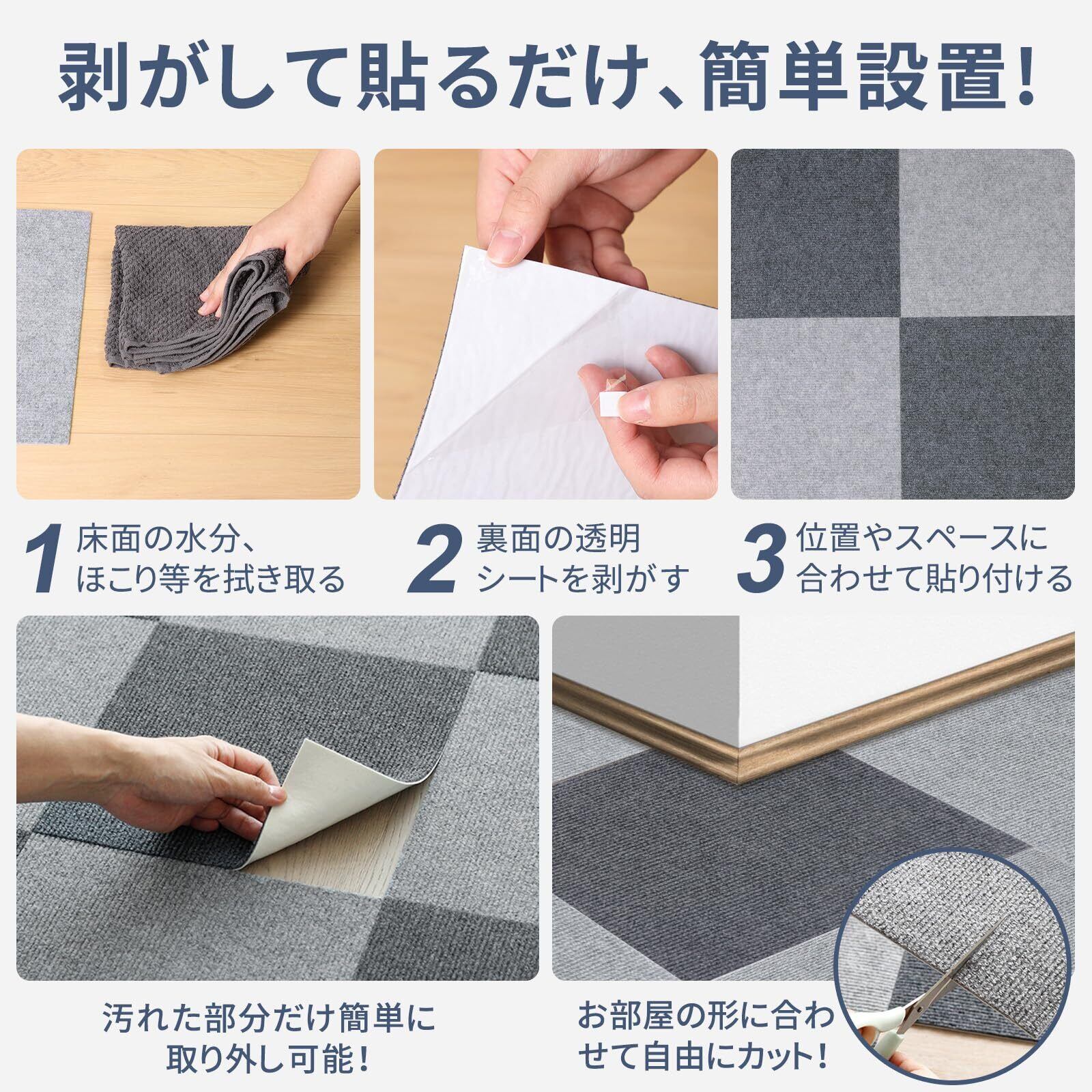 【独自の強力吸着技術】 床と接触面はアップグレードされたTPR素材、従来品より吸着性UP、耐久性もあり、上で走り回っても、掃除機をかけても、ずれにくくストレスがありません。当社のタイルカーペットは、一般的な製品と比べてさらに強力な吸着力を誇ります。滑り止め効果が一段と向上し、激しい動きにも対応可能。これにより、ペットやお子様が走り回ってもズレる心配がなく、安全性が抜群です。