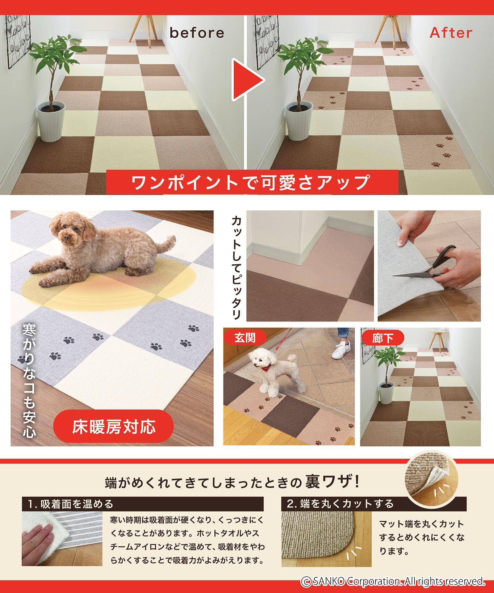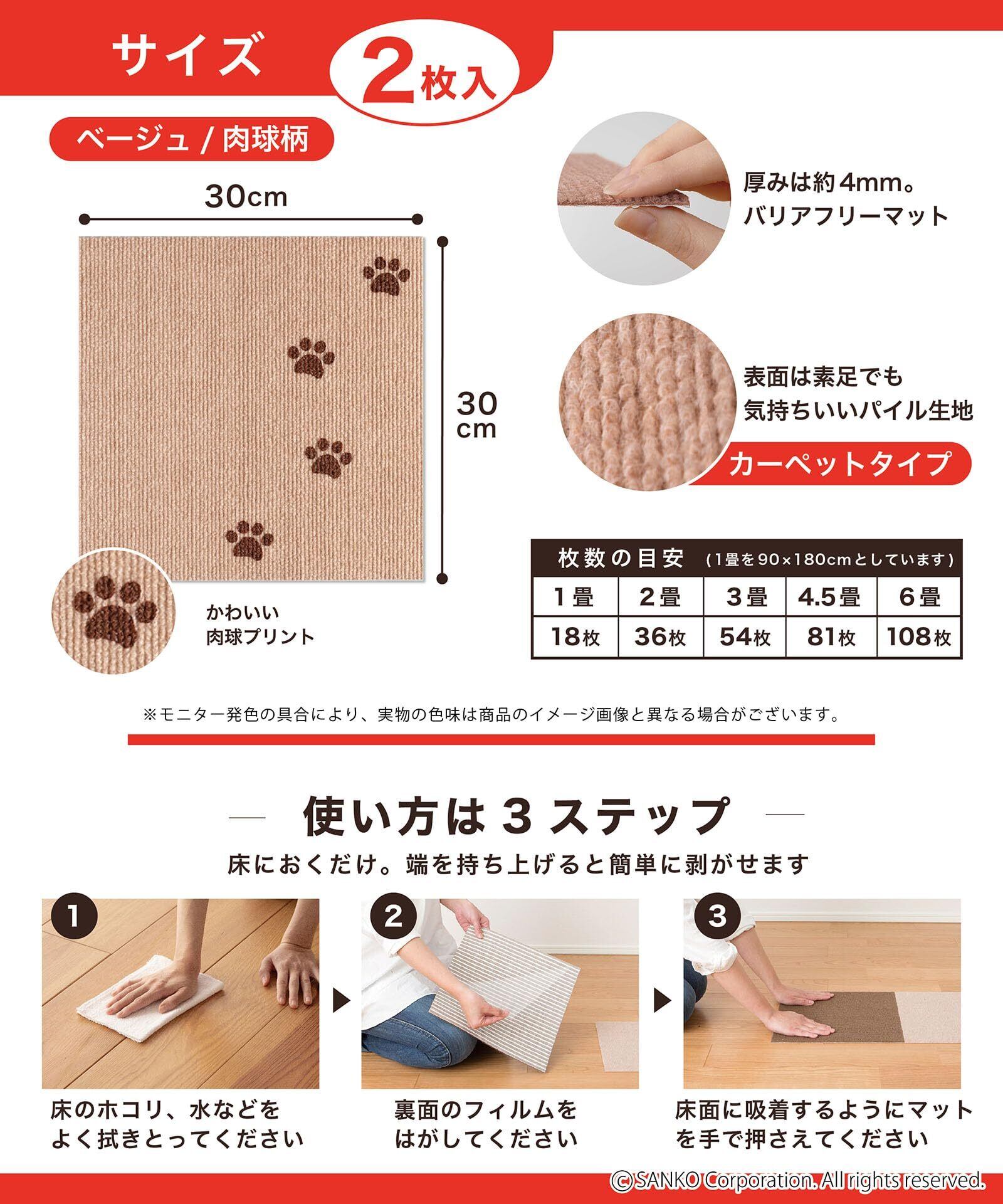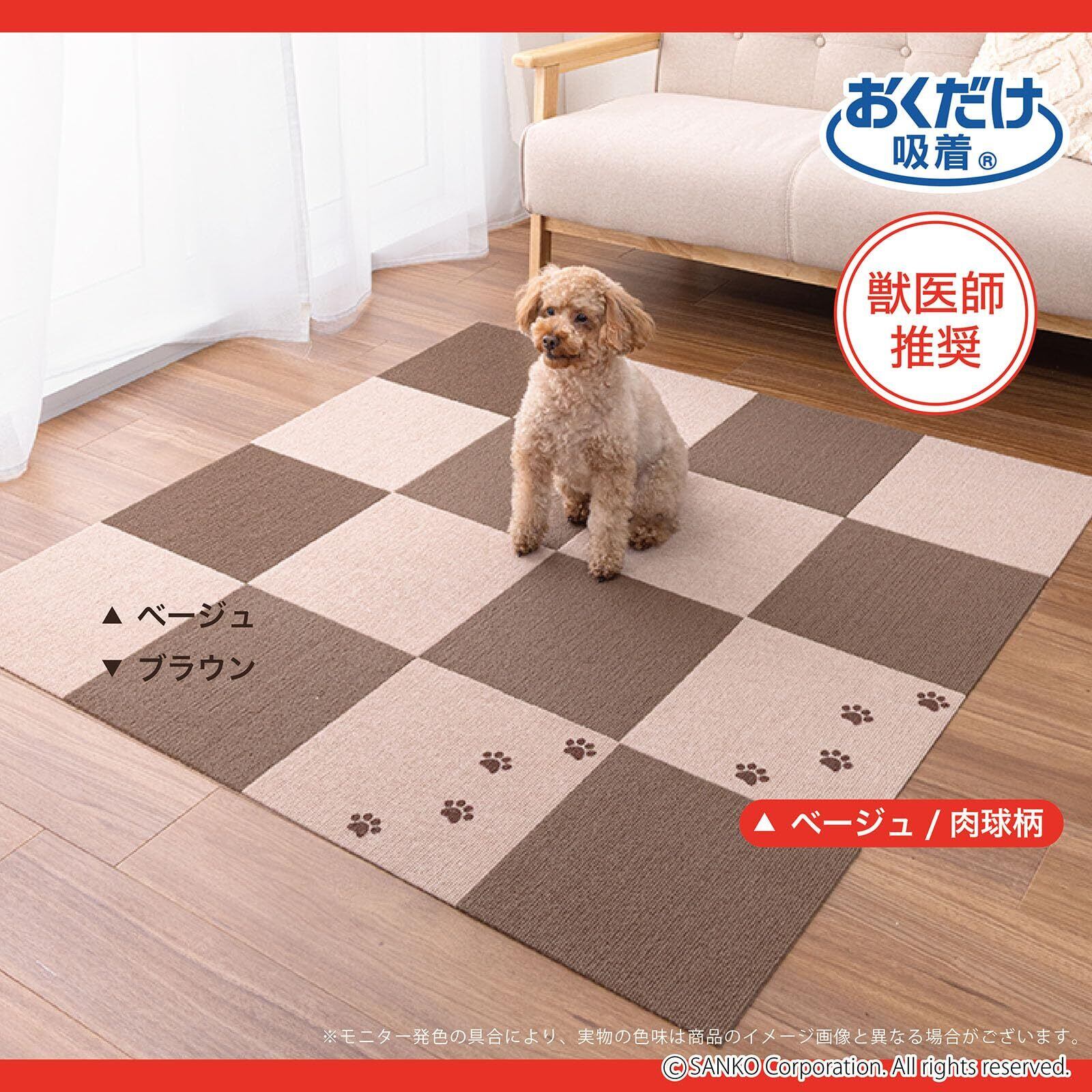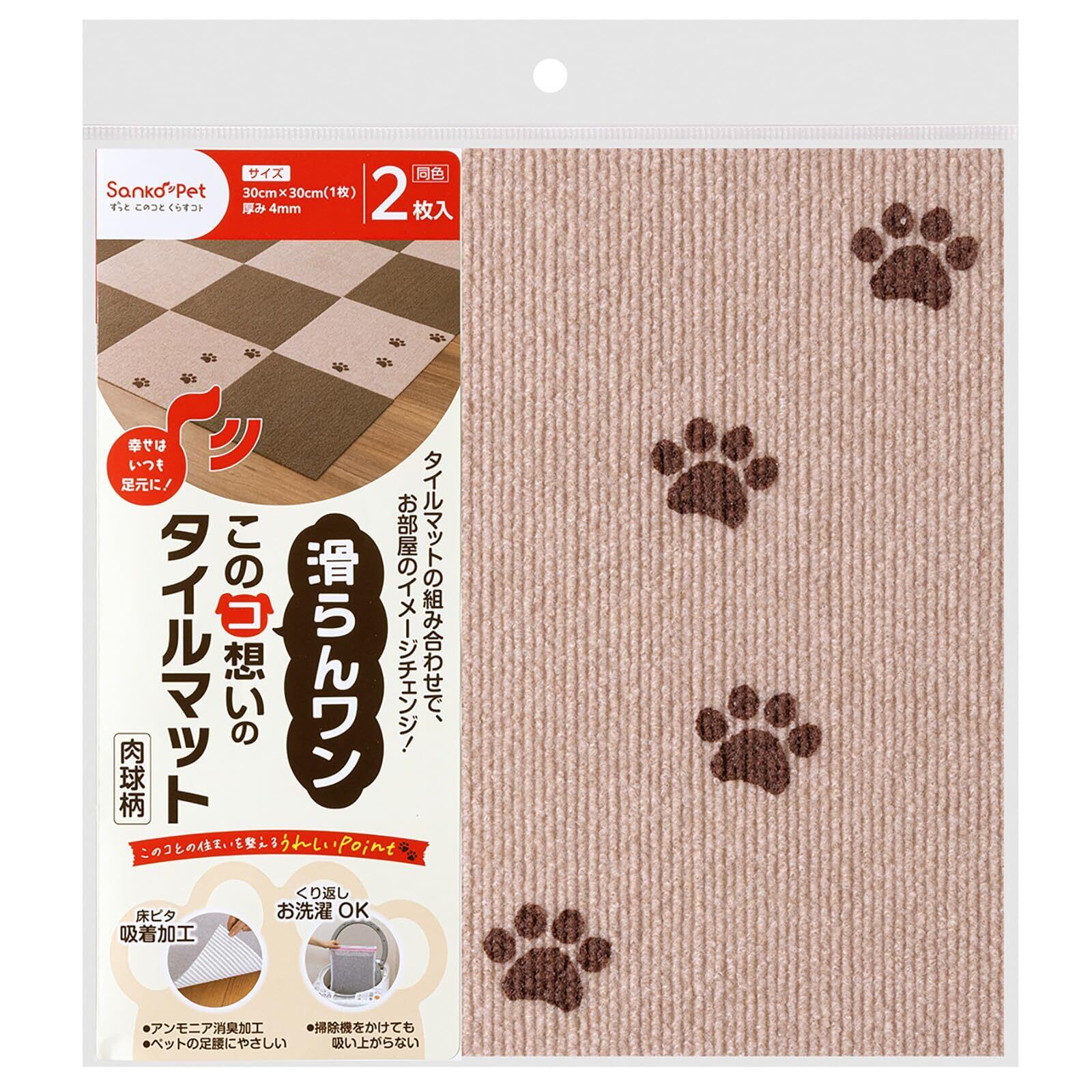 SankoPet ペットマット このコ想いのタイルマット 肉球柄 2枚入 ベージュ 30×30cm ズレない 洗える 日本製 おくだけ吸着 カーペットタイプ KZ-05