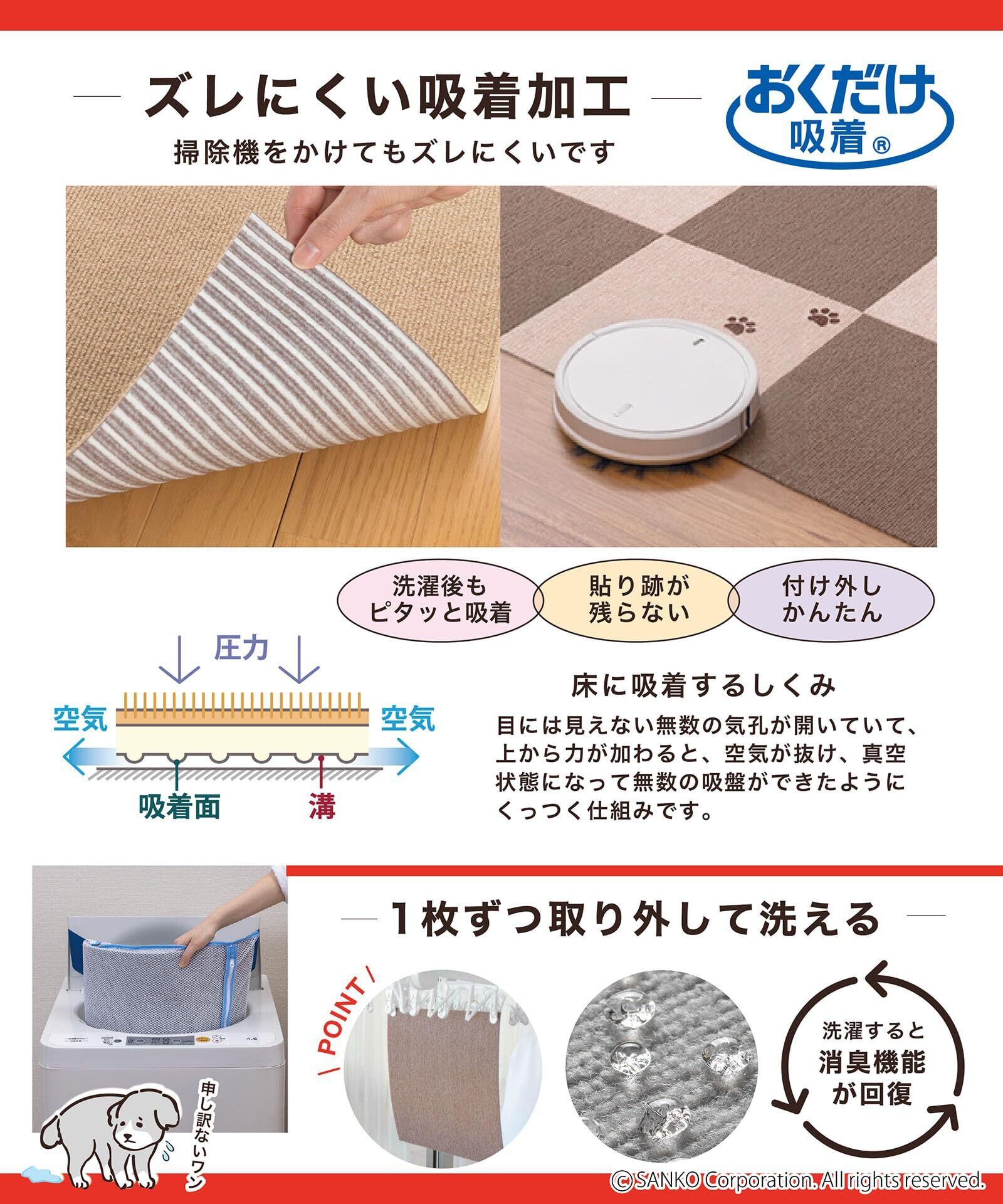 【特徴】ズレにくい仕様で、ペットが遊んだり走り回ったりしても快適・足腰への負担も軽減します。撥水加工を施しているため、汚れや水分を弾き、飲みこぼしや粗相による汚れもサッと拭き取ることができる(防水仕様ではない)。床暖房対応・アンモニア消臭加工・カット可能・繰り返しお洗濯可能(洗濯ネット併用)
