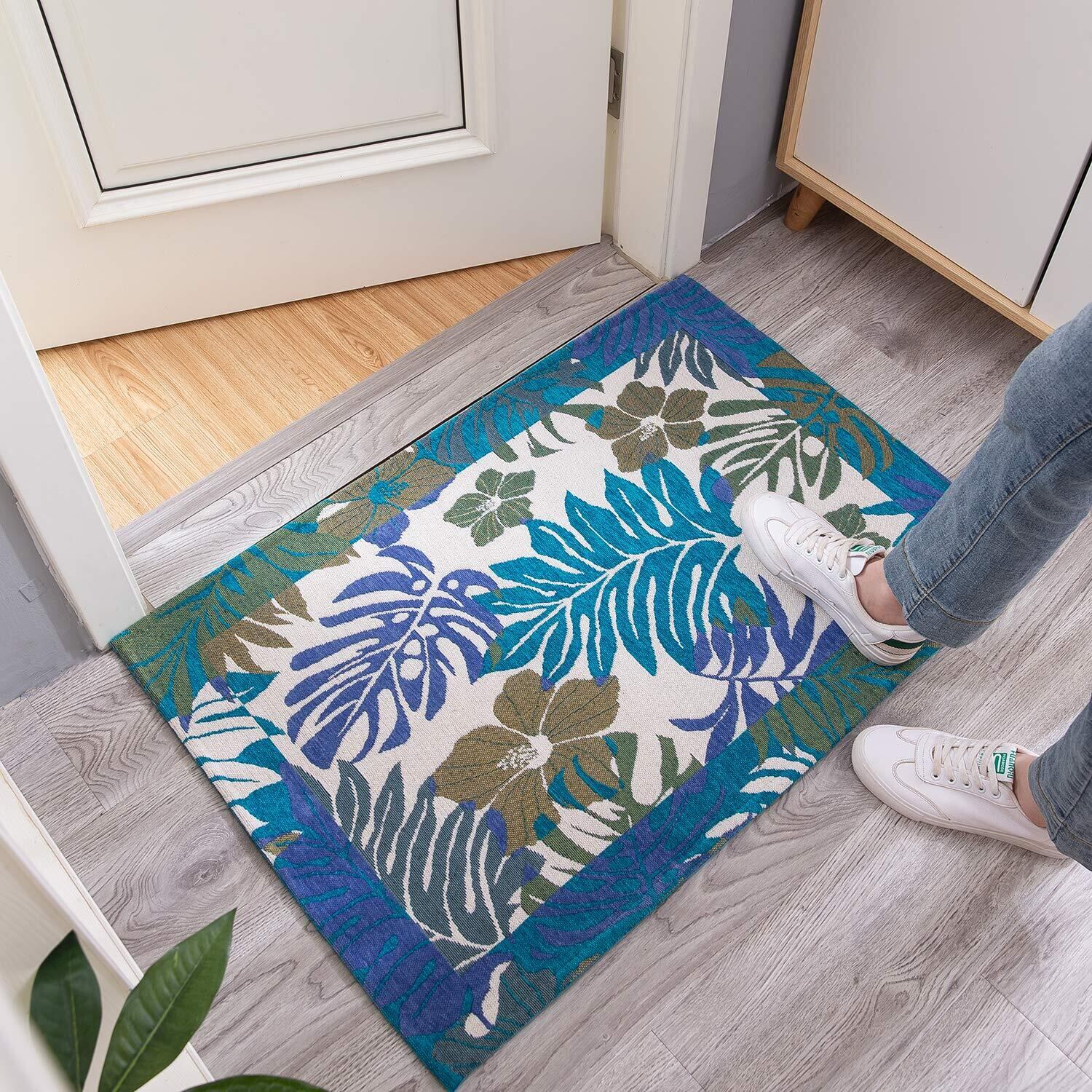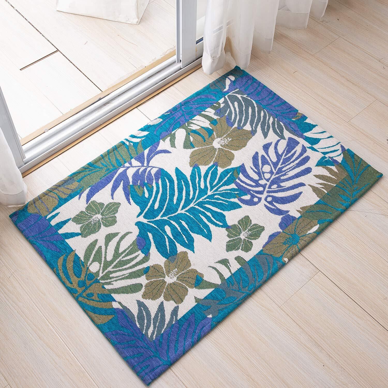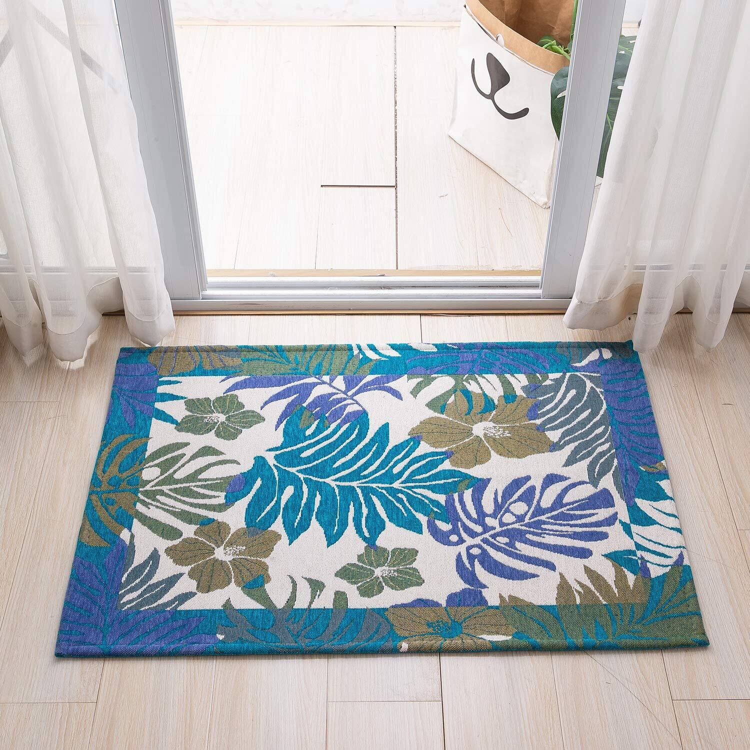 INSIMAN 玄関マット カーペット 屋内 ドアマット 泥落としマット 華やか おしゃれ - リーフ モンステラ柄 ブルー 洗える 吸水 速乾 夏用 - 50 x 80 cm ゴブラン織り 耐磨耗性 抗菌防臭 滑り止め 屋外 床暖房対応 オールシーズン適用 | kki
