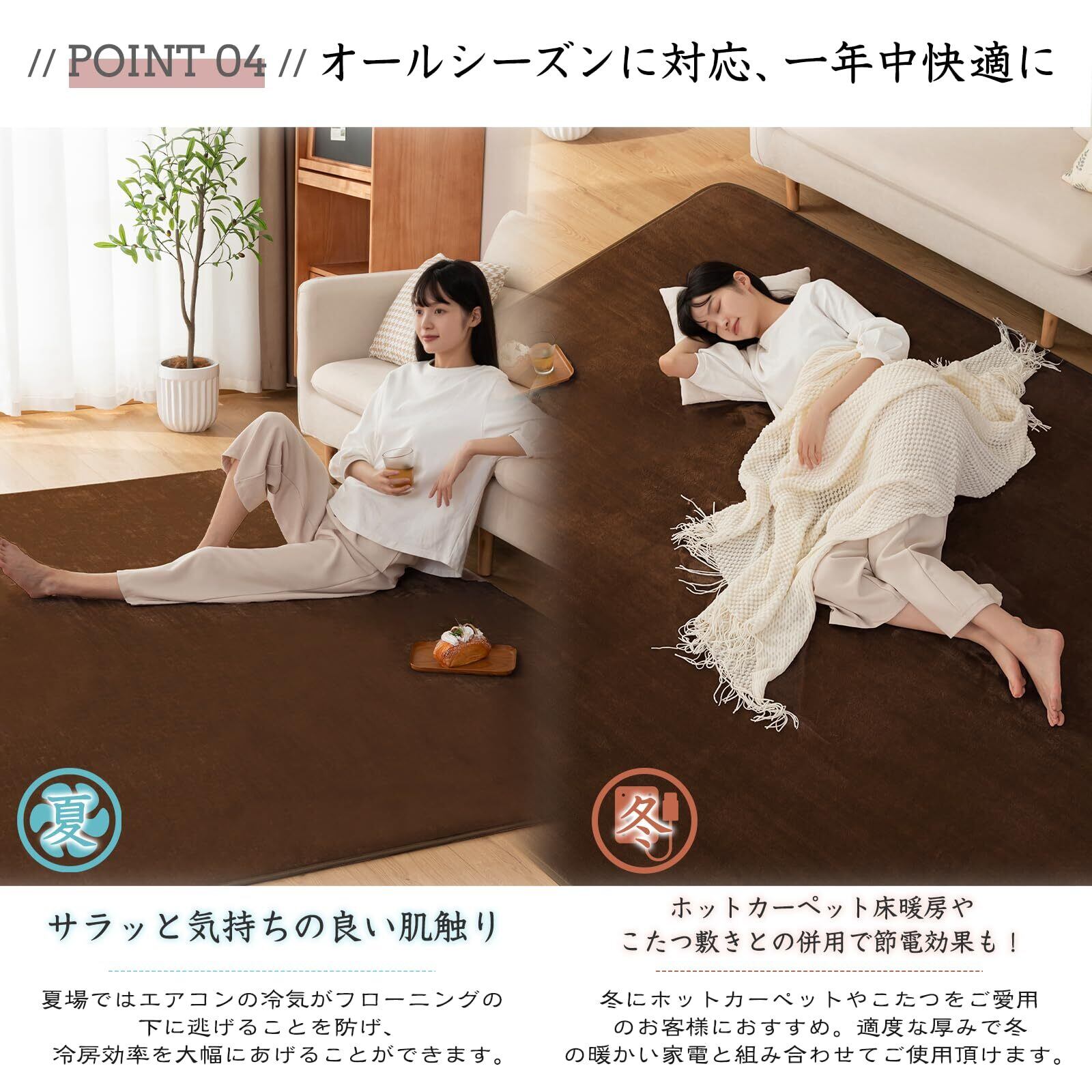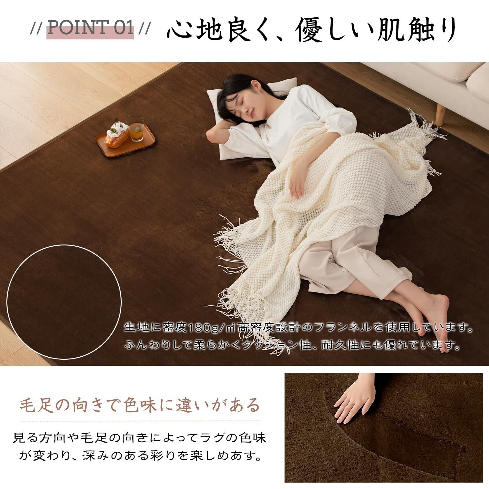 【フランネル素材・オールシーズン対応】 きめが細かく柔らかいマイクロファイバーを高密度で織り込みました。ふんわりと心地いい肌ざわりが特徴です。オールシーズン使えるフランネル素材絨毯が、光の加減や毛並みで色合いが変化します。
