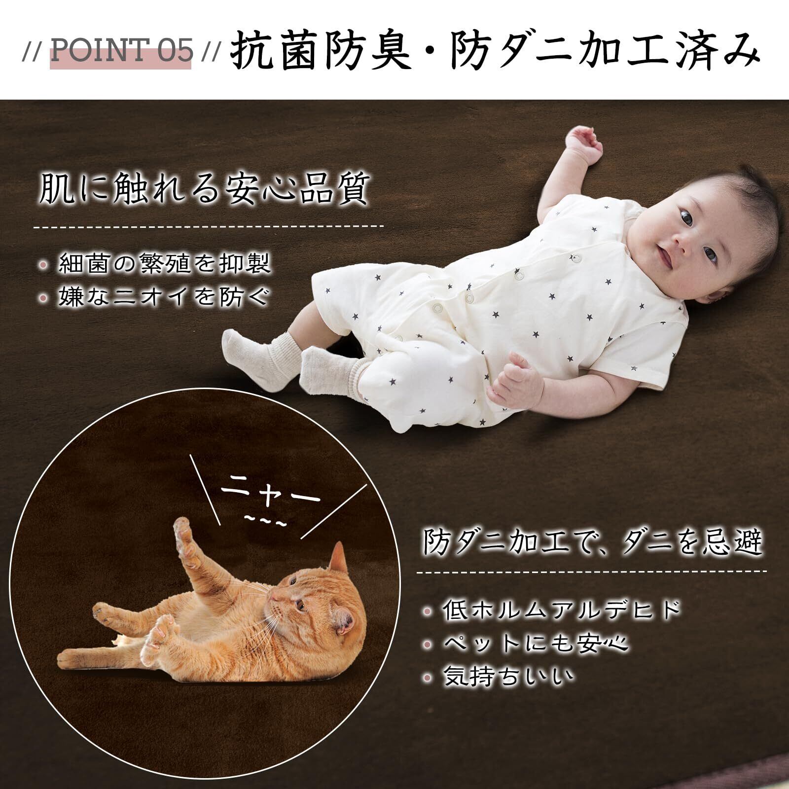 【抗菌防臭・安全安心】肌が直接触れるラグだからこそ、安心してお使いいただけるように菌の繁殖や、臭いを抑制する抗菌·防臭加工とダニの繁殖を抑制する効果のある防ダニ加工を施しています。当社の製品は薬剤等を使用して様々な加工を施しておりますが、身体に害になるような過剰な加工は、一切しておりません。低ホルマリン基準をクリアした当社の製品はアレルギーが気になる方やお子さまがいる家庭でも安心してお使いいただけます。