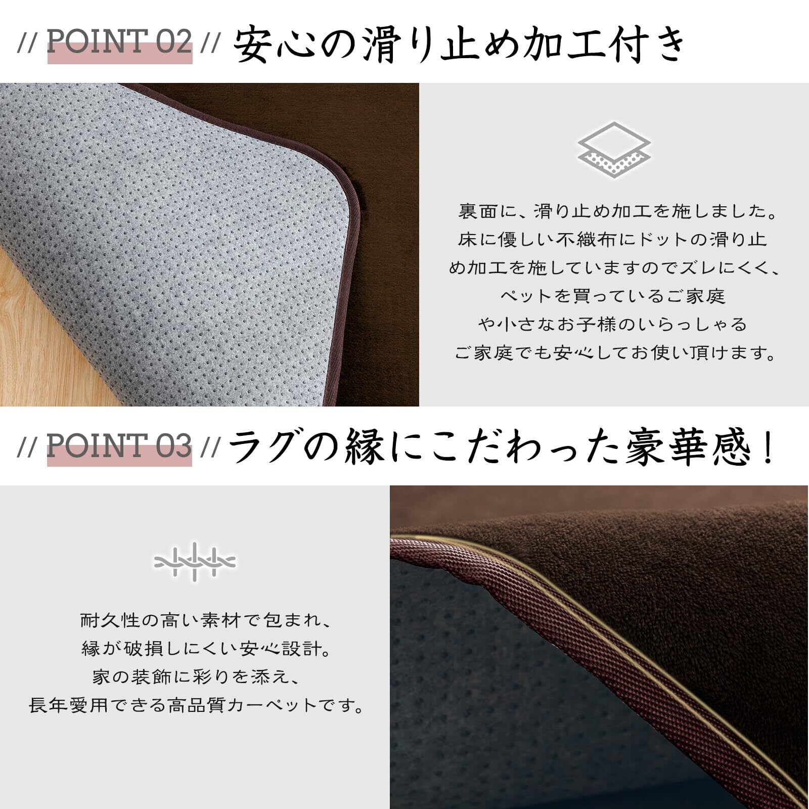 【滑り止め加工・耐熱加工】カーペットの裏面にはゴム製の滑り止め加工が施してあり、フローリングに敷いても滑りにくく、お子さまやお年寄りのいるご家庭でも安心です。裏面には不織布を使用しているので、フローリングを傷から守ります。耐熱加工を施してあるのでホットカーペットや床暖房にも対応しております。