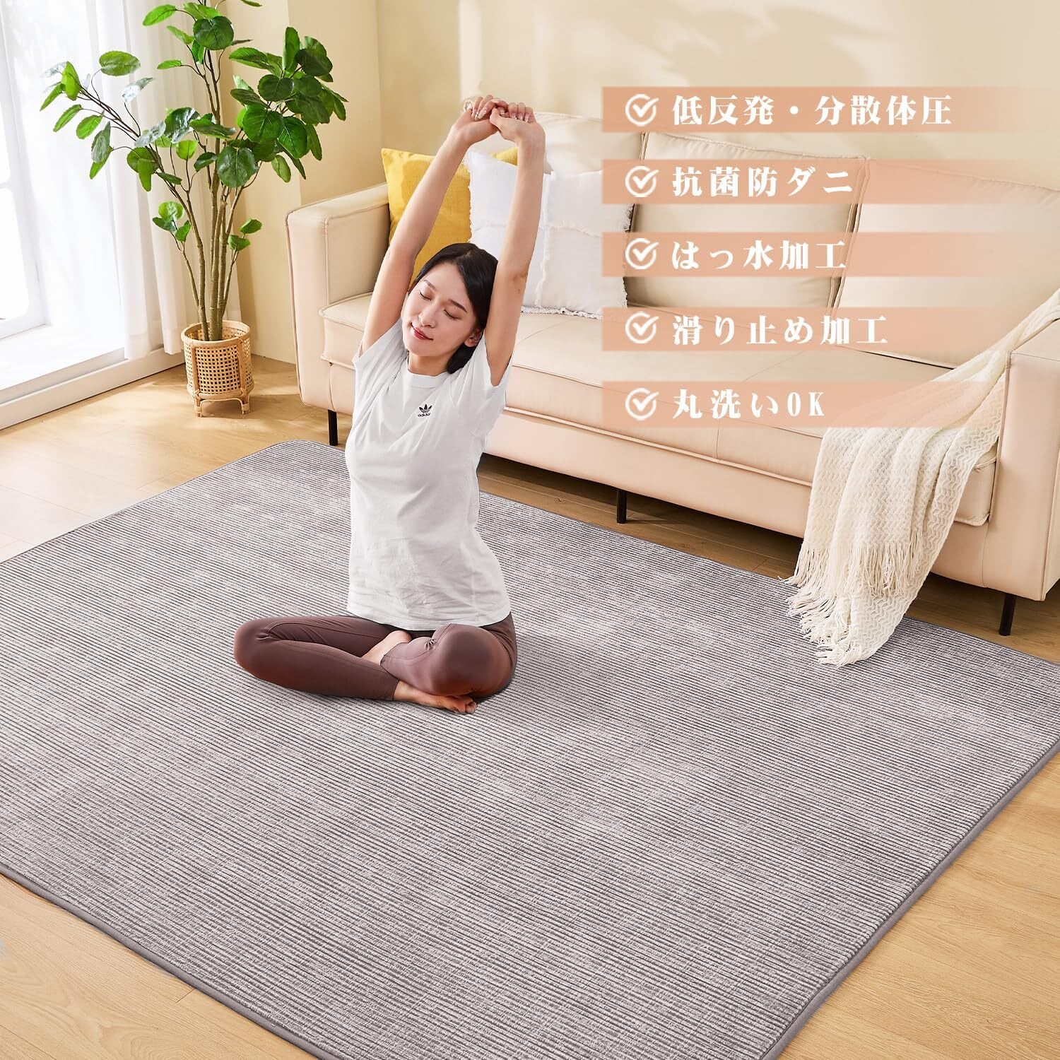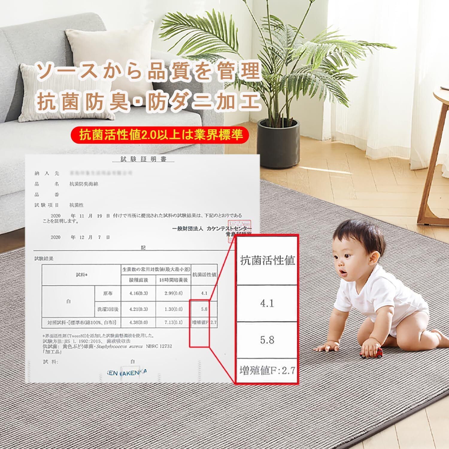 【防ダニ防臭】この厚手カーペットは肌に直接触れるため、カーペットの品質には細心の注意を払っています。1.5 畳カーペットの生地は非常に通気性が良く、防臭・防ダニ加工が施されており、細菌の繁殖を防ぎます。そのため、アレルギーが心配な方も使いいただけます