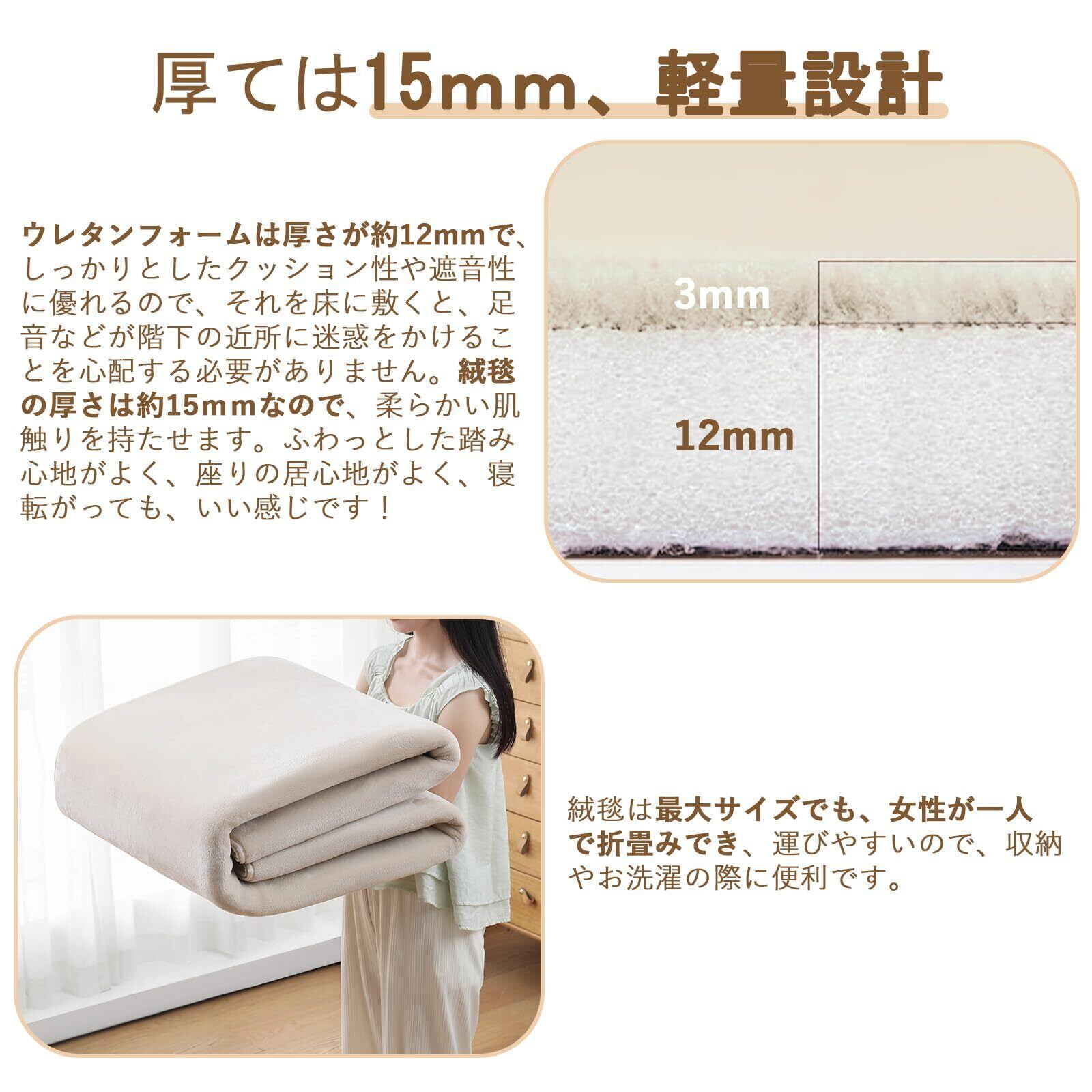 【15mm厚さの魅力】このカーペットのウレタンフォームの厚さは約12mmで、しっかりとしたクッション性を提供します。絨毯の総厚さは15mmにも達するため、柔らかい肌触りを実現します。ふわっとした踏み心地が心地よく、座り心地も快適です。寝転がっても快適な使用感を味わえます!