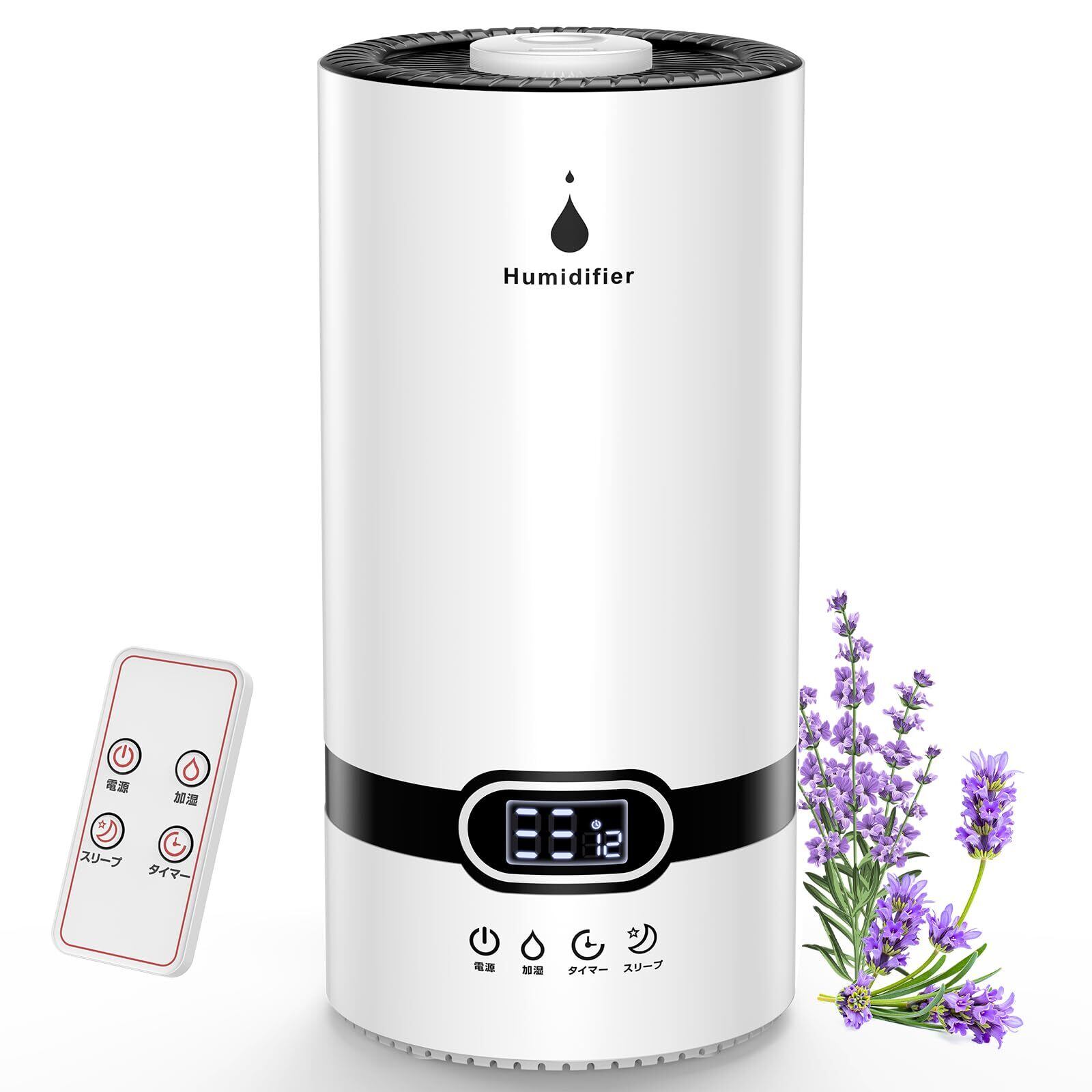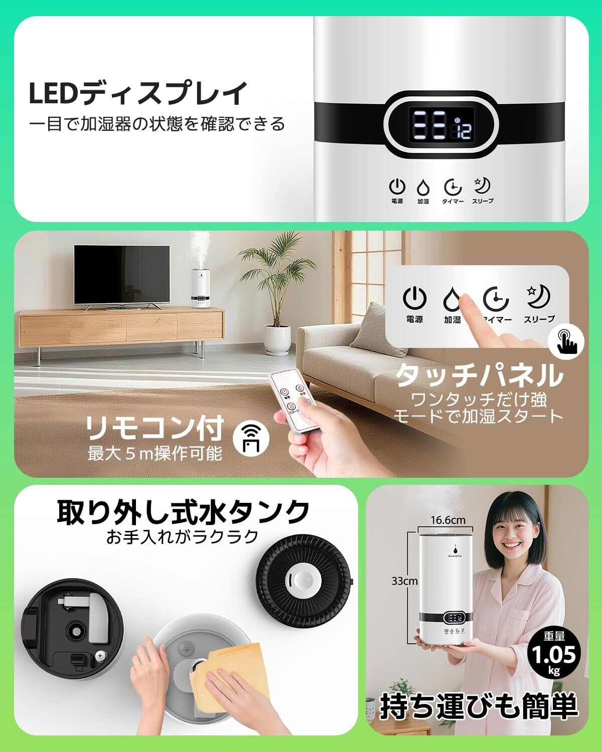 【一目でわかるLEDディスプレイ&タッチパネル・リモコン操作】加湿量段階、タイマー設定の状況はLEDディスプレイでわかりやすくて、初心者や年寄りでも簡単的に使用できます。夜の使用や省エネのために、睡眠モードも搭載、LEDディスプレイを消灯して加湿できます。タッチパネルでワンタッチだけ加湿スタート!リモコン付、最大5mまで操作でき、寝室のベッドやリビングのソファーに寝転んでも楽に遠距離操作できます。