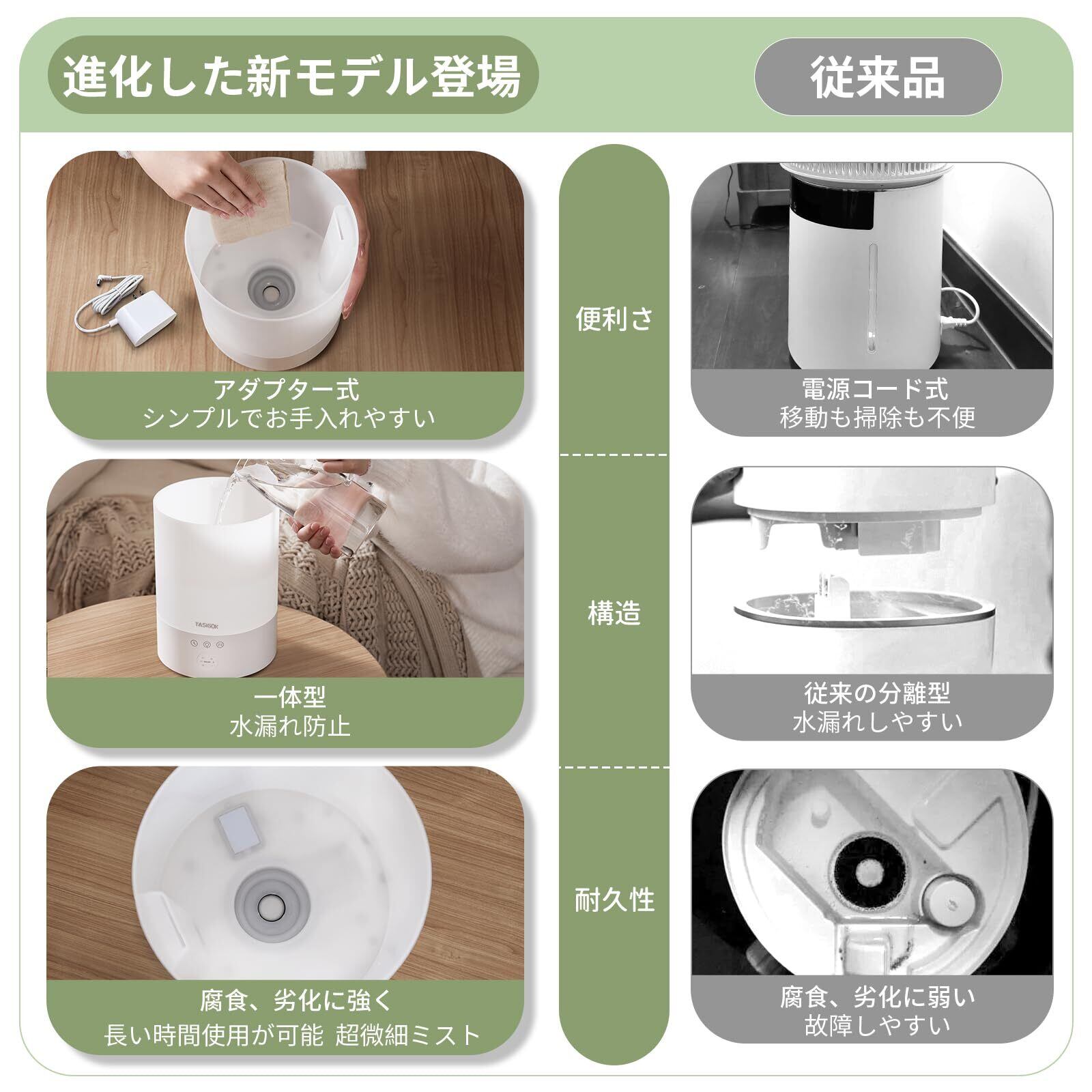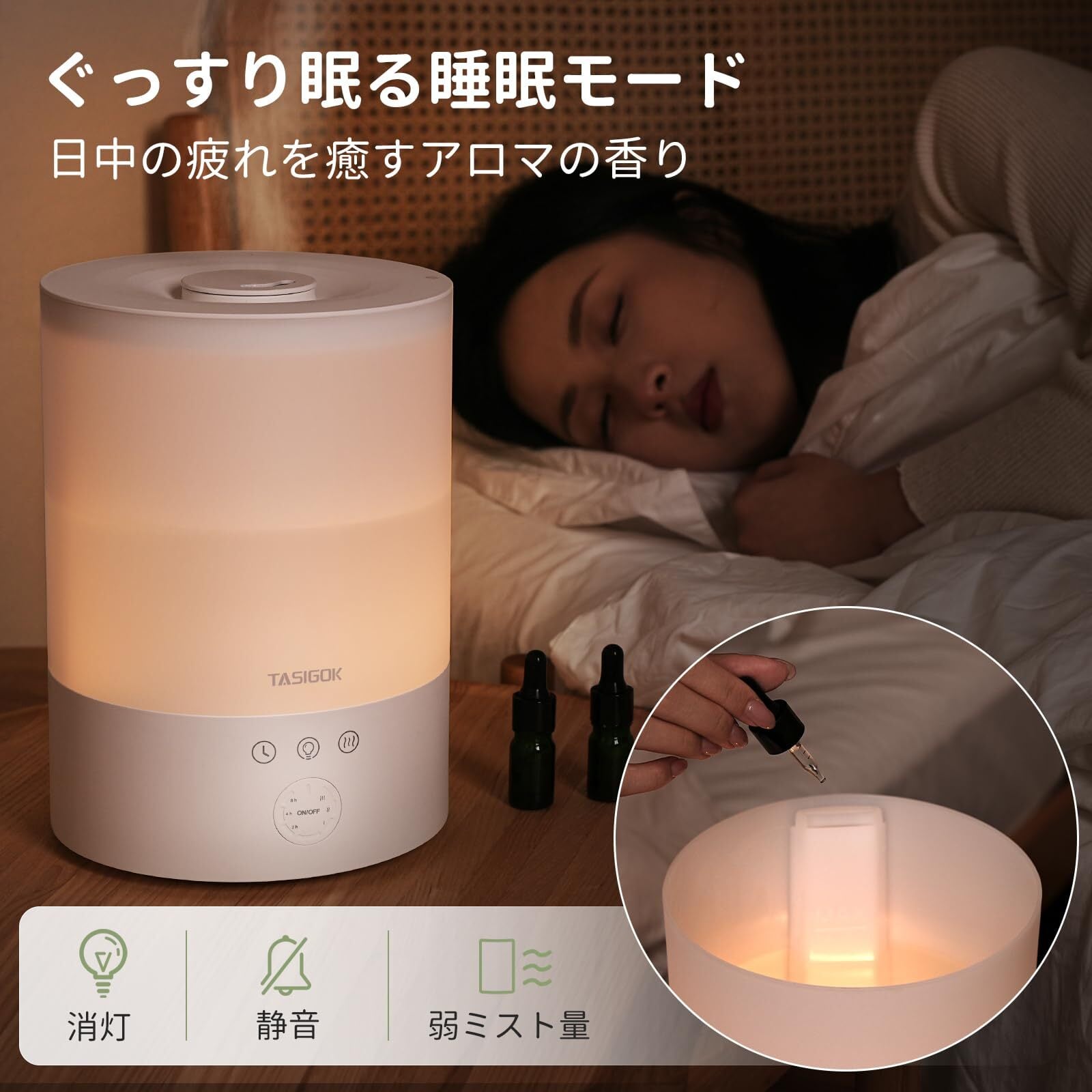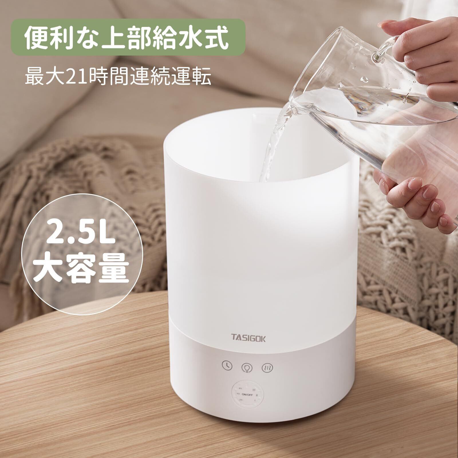 Tasigok 加湿器 小型 卓上 大容量 2.5L 上から給水 アロマ対応 LEDライト 睡眠モード タイマー 3段階ミスト量 おしゃれ お手入れ簡単 強力 超音波式 静音 28dB 省エネ 6畳 15畳 空焚き防止 水漏れ防止 寝室 オフィス リビング コンパクト 次亜塩素酸水 乾燥対策 カートリッジ付き