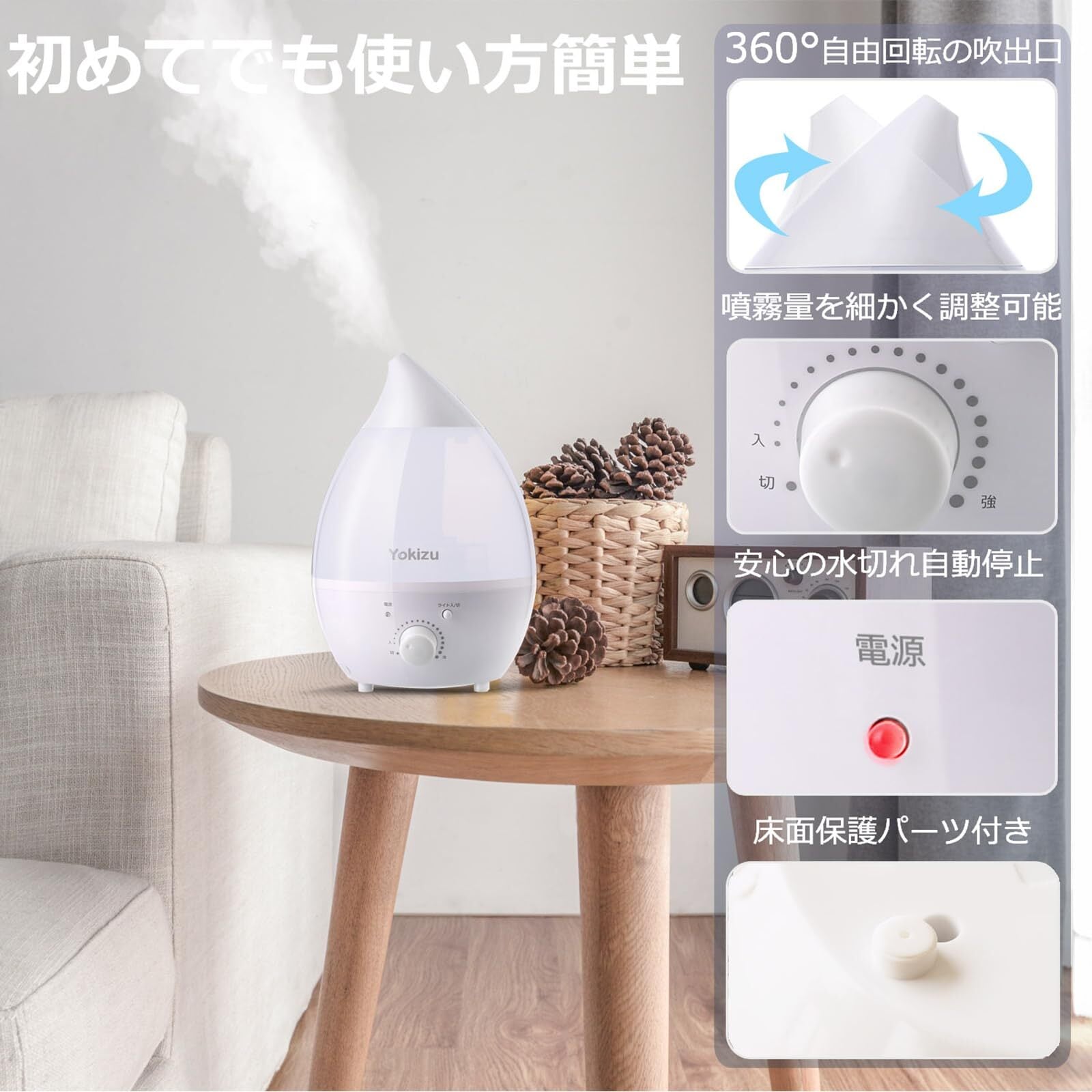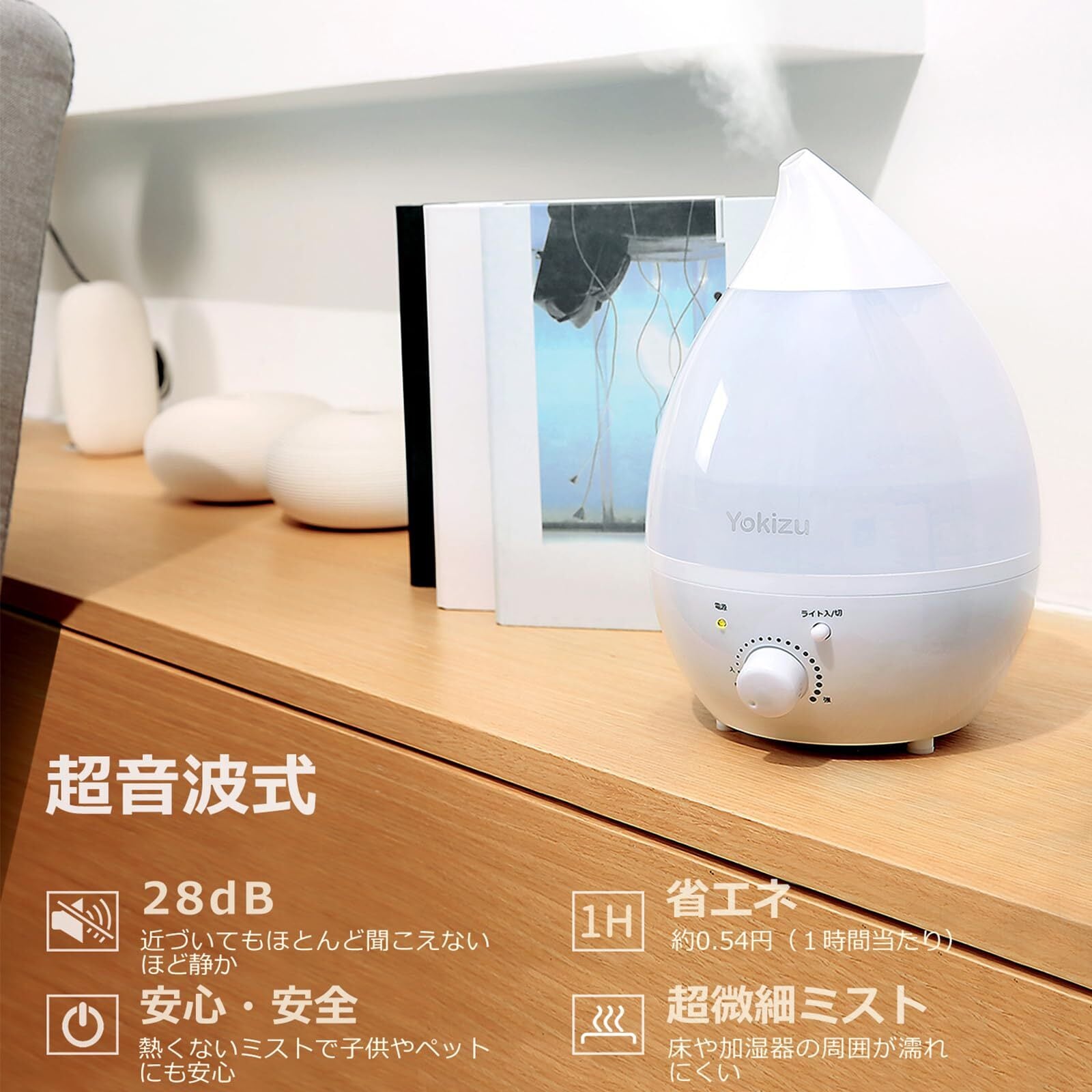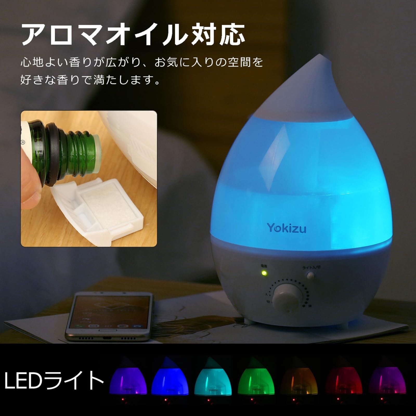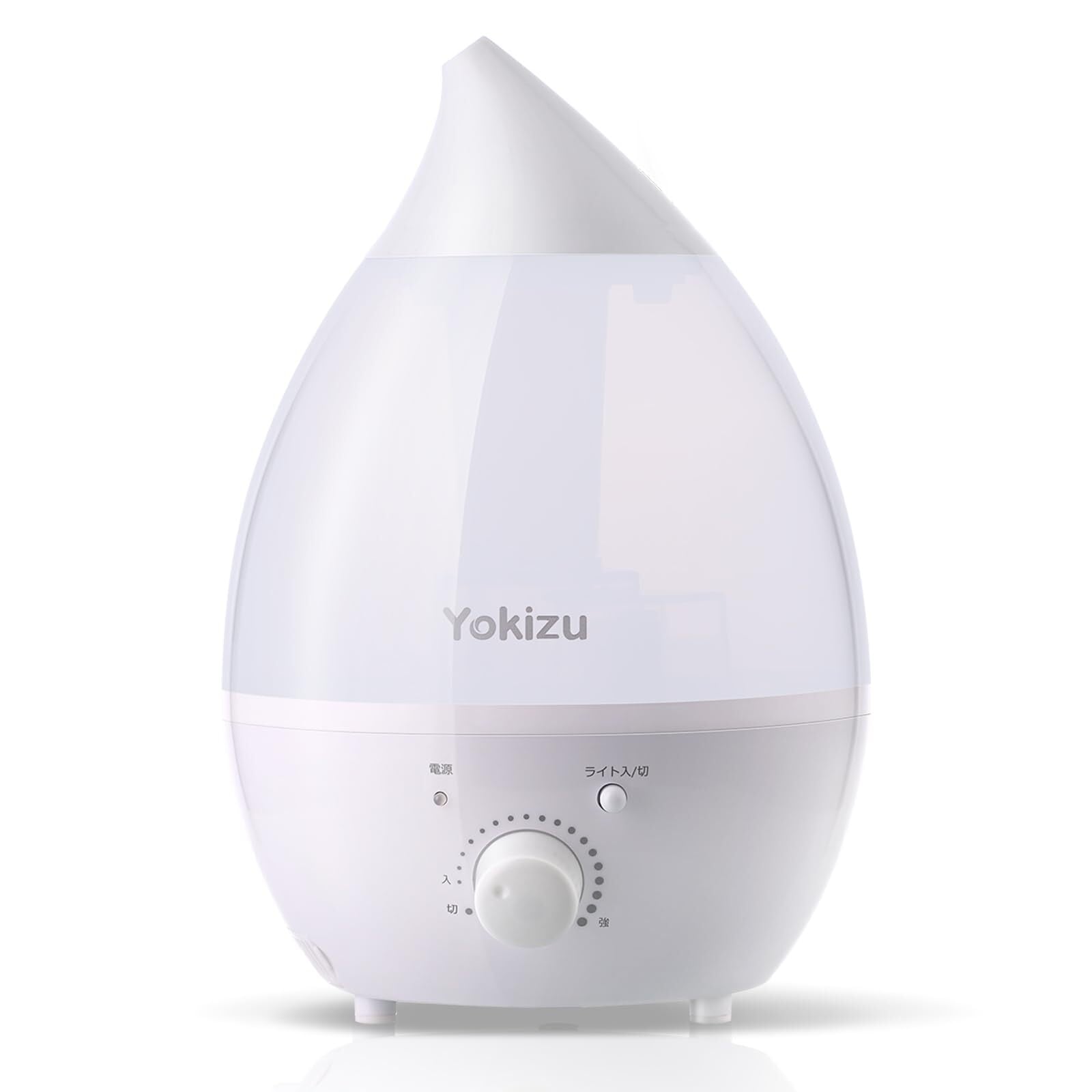 Yokizu 加湿器 小型 卓上 大容量 除菌 アロマ 超音波式 LEDライト しずく型 お手入れしやすい 静音 省エネ 加湿機 次亜塩素酸水対応 デスク オフィス 寝室 リビング 乾燥対策 焚き防止 おしゃれ コンパクト 6-10畳 ホワイト