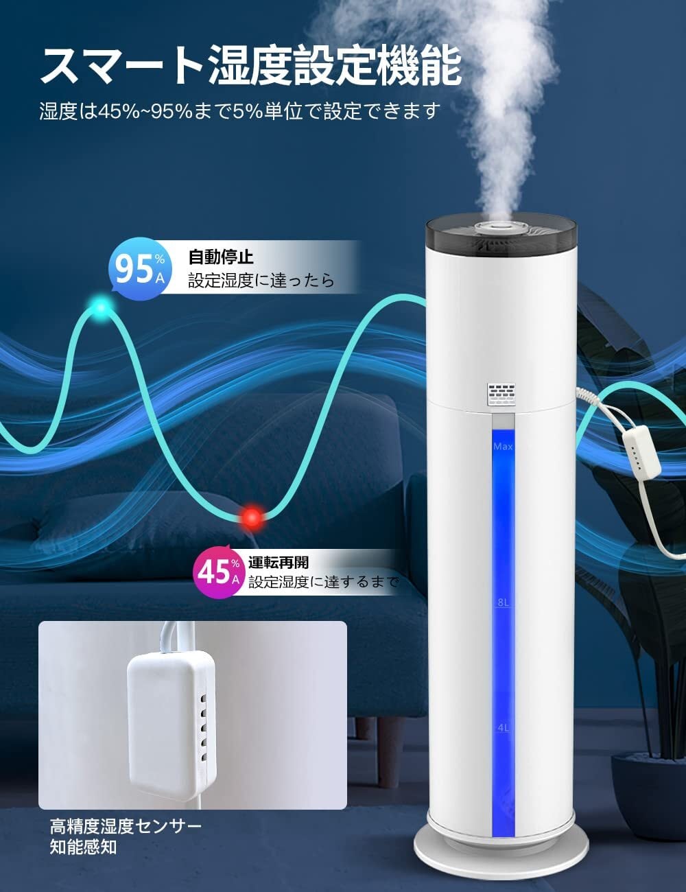【4段階霧量調節&適切な湿度を保って自動加湿&パワフルな加湿力】4段階ミスト調節機能が搭載し、空気状況に応じてミスト量を選択可能です。また「1分運転1分停止・1分運転3分停止・1分運転5分停止」の断続噴霧モードが選択でき、、環境湿度と温度を検知できる高精度湿度センサーを搭載し、設定された湿度に自動的に維持できます。湿度は45%から95%まで設定でき、設定湿度に達すると、製品は自動的に運転停止します。30Wの電力で、電気代は1時間あたりわずか約0.75円!超省エネ!加湿 器は1時間最大350mlのミストが噴出でき、適用面積は従来一層広く、60畳まで適用します。大家族の寝室やリビングはもちろん、オフィス、花屋、レストランなどの大スペースにもしっかり隅々まで潤ってくれます。