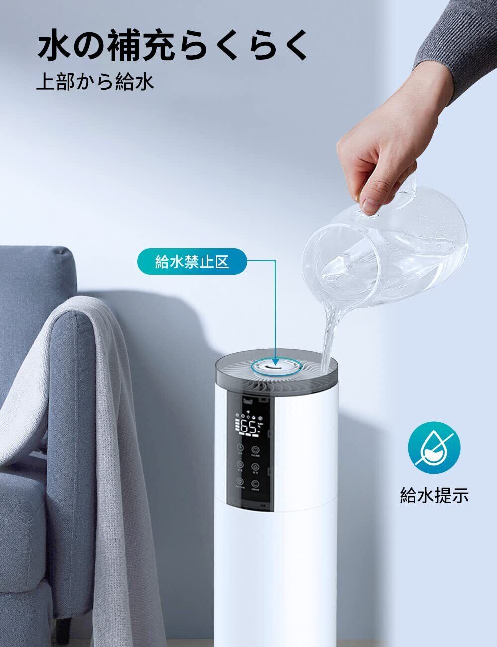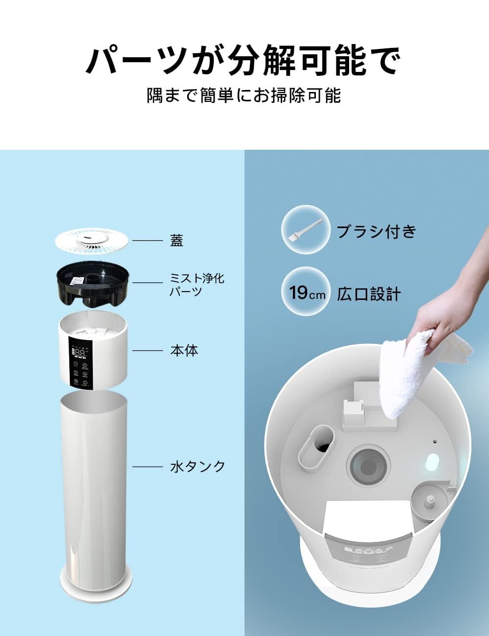 【上から給水&水漏れない&お手入れ簡単】加湿器は上から給水できるデザインなので、蓋を開けて給水することができ、給水が非常に楽です。水タンクには水位窓とMAX水位線があり、水位窓により水の残りが分かりやすいです。また、タワー式加湿器なので、超音波振動により水を超微細ミストにして、通常より高い位置からミストを吹き出すことができ、もっと広い範囲にミストが拡散され、加湿空間を広げながらも、床を濡らしません。広口設計にパーツ分解可能、隅々まできれいに掃除でき、お手入れもしやすい。