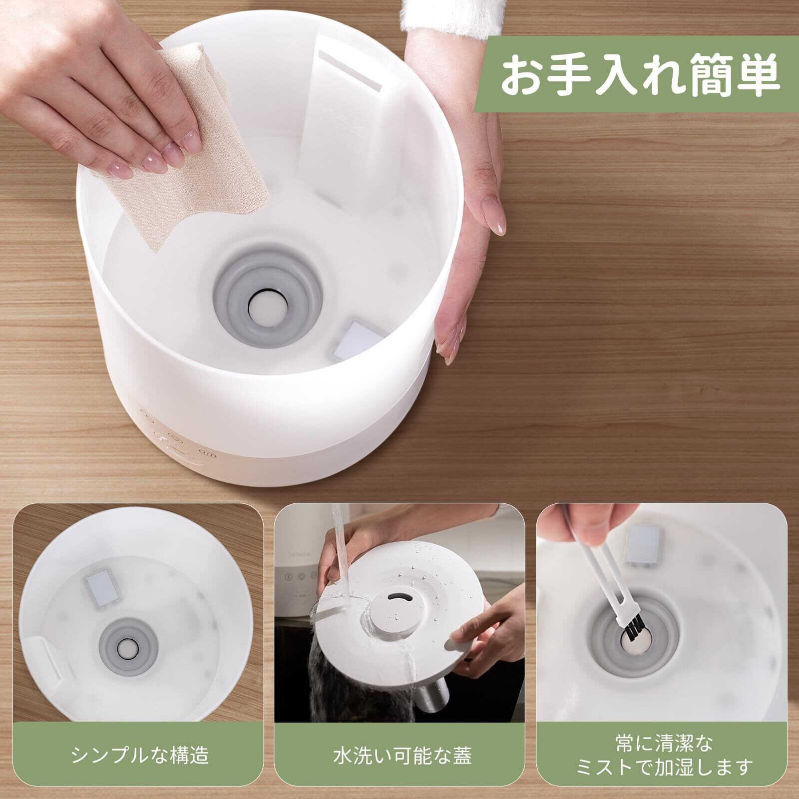 【2025年改良モデル登場&便利な上部給水&お手入れ簡単】電源コードを本体から取り外せるアダプター式なので、掃除がしやすく、給水や移動時にコードが邪魔になりません。給水口の直径は17.5cmと幅広く、上から注げるため、持ちやすいペットボトルやポットを使って簡単に水を補充することができます。水垂れも心配ありません。シンプルな構造なので、初心者やお年寄りの方でも使いやすく、タンクの中に凹凸がないので、簡単に丸洗いすることができます。清潔な水で加湿することができます。