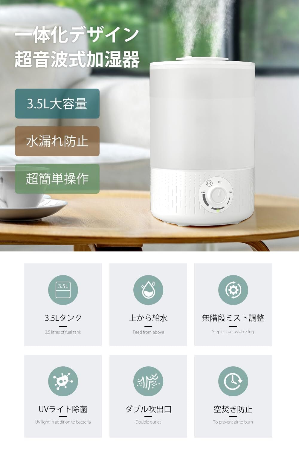 【2025新登場・ダブル吹出口・3.5L】 加湿器 大容量 UVライト除菌 超音波式 加湿器 卓上 アロマ対応 上から注水 かしつき 無階段ミスト調整 54時間連続作動 空焚き防止 水漏れ防止 吹出口360° 乾燥対策/花粉症対策 静音 寝室/オフィス/会社/家庭用 日本語取扱説明書付き PSE認証済み (ホワイト)