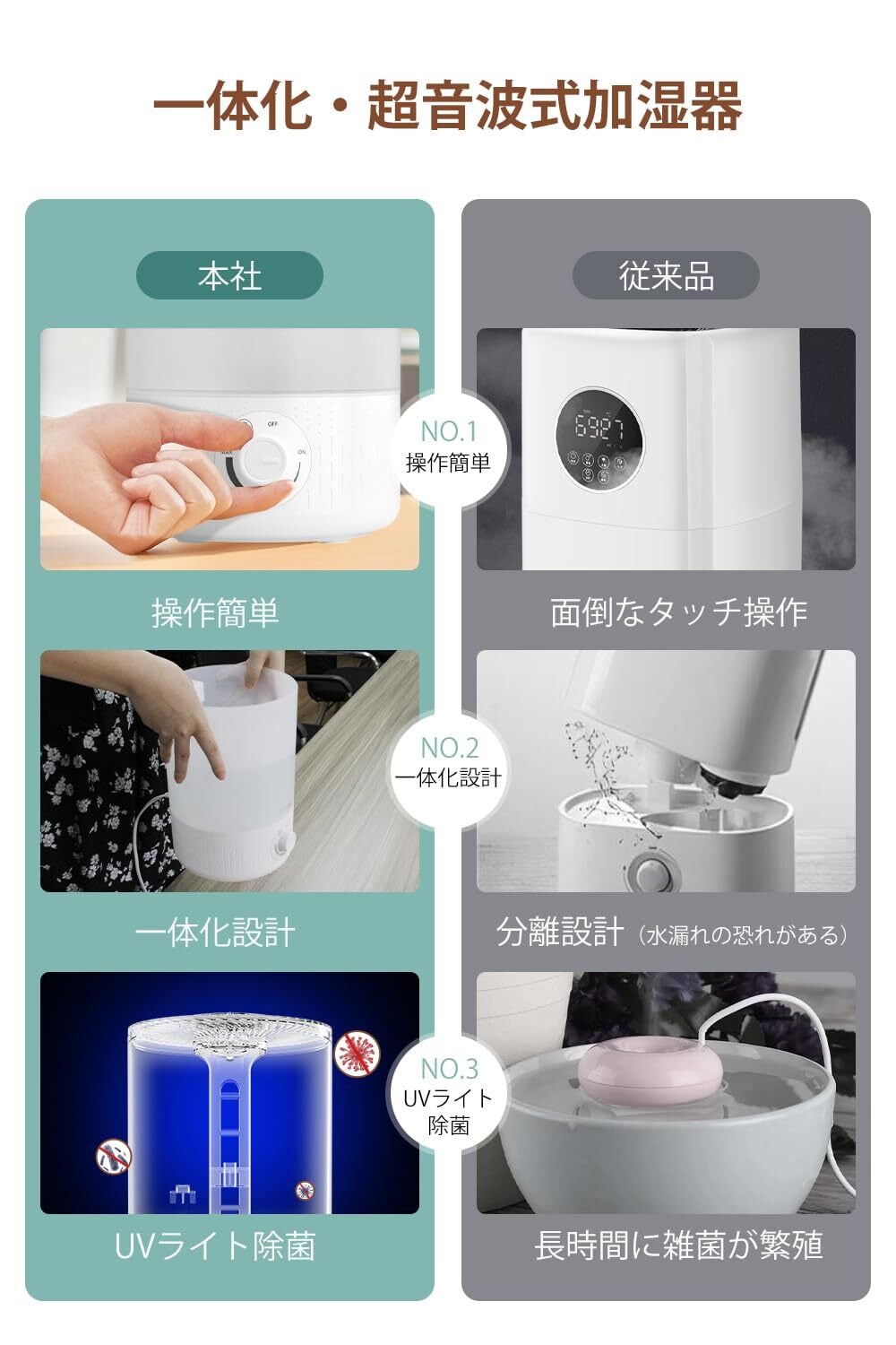 【UVライト除菌・アロマ対応加湿器】UVライトは抗菌機能があり、UVボタンを押すとライトが点灯し、水中の細菌を99%除去します。この加湿器は清潔なミストを放出できます。水溶性のアロマオイルにも対応しており、お好みのアロマオイルをタンクに入れることで部屋全体に心地よい香りが広がります。(注意:次亜塩素酸水を使用する場合は希釈してください。50ppm以下の濃度が推奨されています)