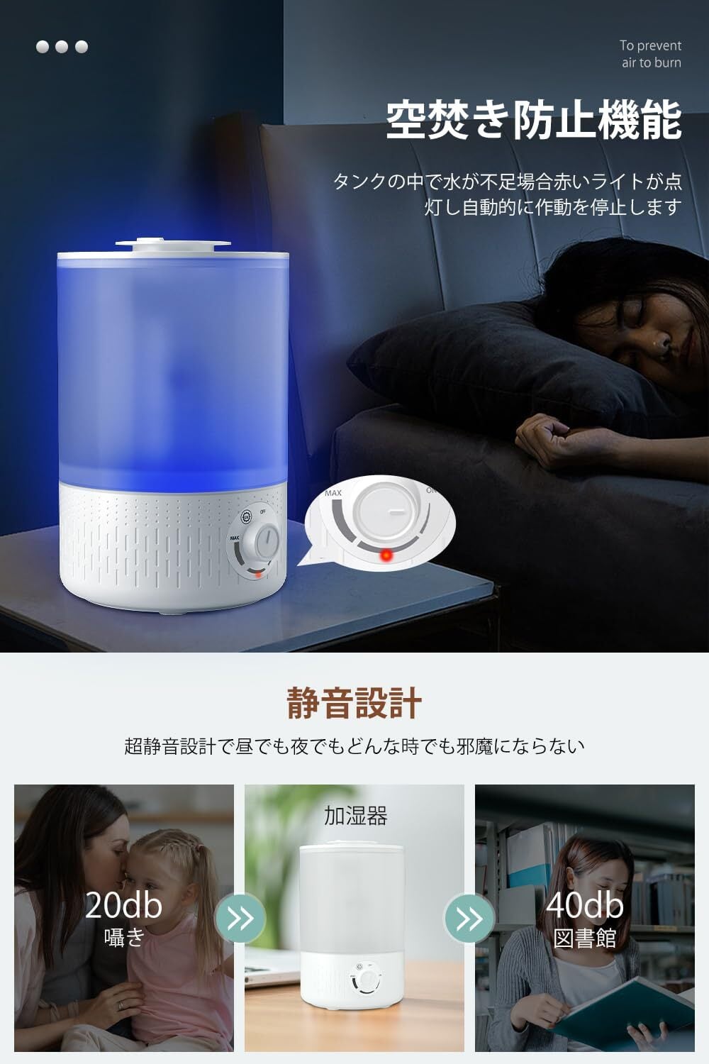 【水漏れ防止・空焚き防止・PSE認証取得】この加湿器には空焚きを防ぐ機能が備わっており、水不足時には自動的に加湿が停止し、赤色のランプが点灯します。就寝中でも水切れの心配はありません。PSE認証を取得しており、安全性と信頼性がされています。底部にPSEマークが付いており、安心してご利用いただけます。