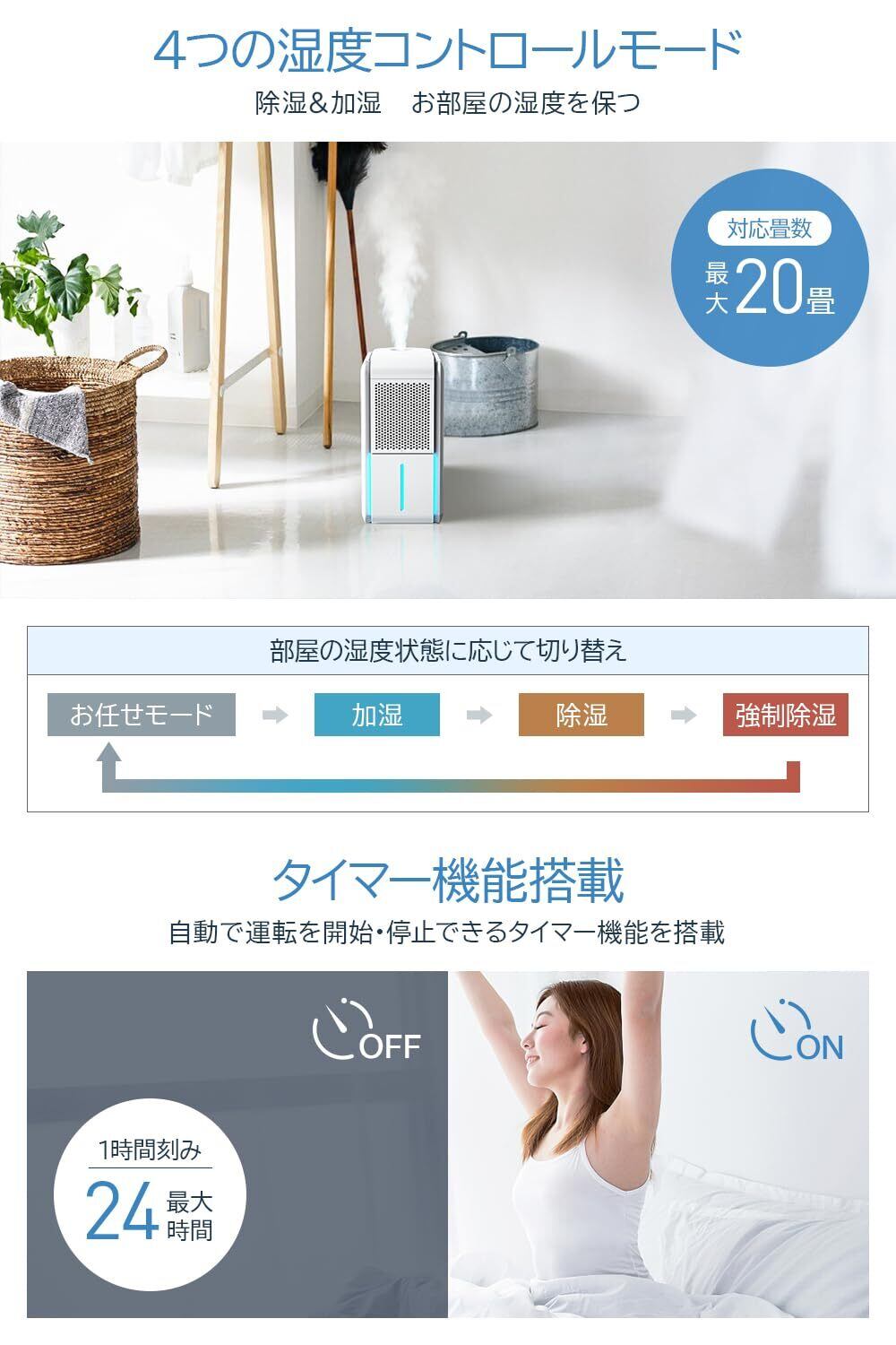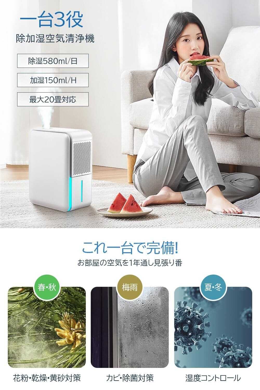 【3in1除加湿空気清浄機】除湿器、加湿器、空気清浄器など何台も置く空間がない家や一人暮らしに最適な一品です。除湿・加湿・空気清浄の3役を1台で果たし、季節や用途に合わせて、梅雨は除湿、冬は加湿、普段はイオン放出により空気清浄、一年活躍できる除加湿空気清浄機です。狭い部屋も場所をとらずに置ける小型軽量タイプ、より持ち運びやすいので、一人暮らしはもちろん、複数の部屋での使いまわしも便利です。