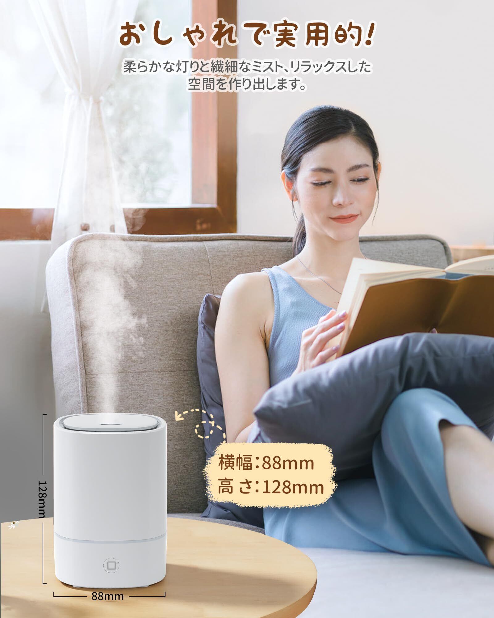 【オートオフ空焚き防止&使用上の注意点】水の量は容器の3分の2以下(上から2.5cmまで)にしてください。満水にするとミストが出にくくなります!使用時はまず最初に電源を設置してから、外蓋を外して内部容器に水およびアロマオイルを入れてください。水が電源に濡れるのを防ぐためです。アロマディフューザーアロマオイルを使用することで超音波スプレーにより香りをお部屋の中に広げ、アロマディフューザーとして機能します。また、エッセンシャルオイル未使用時では、水だけを使用してミニ加湿器としてあなたのそばに潤いをもたらします。