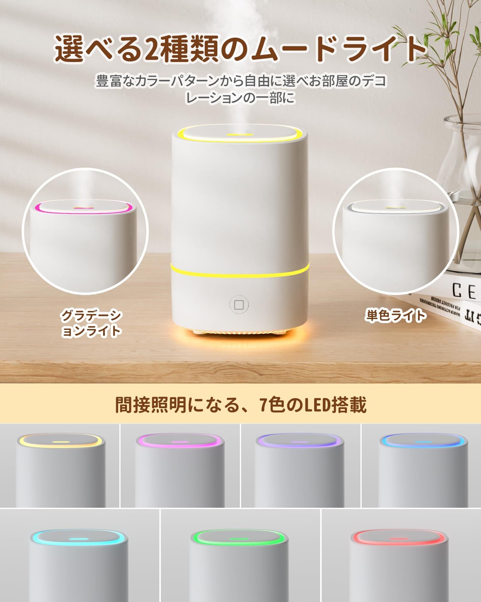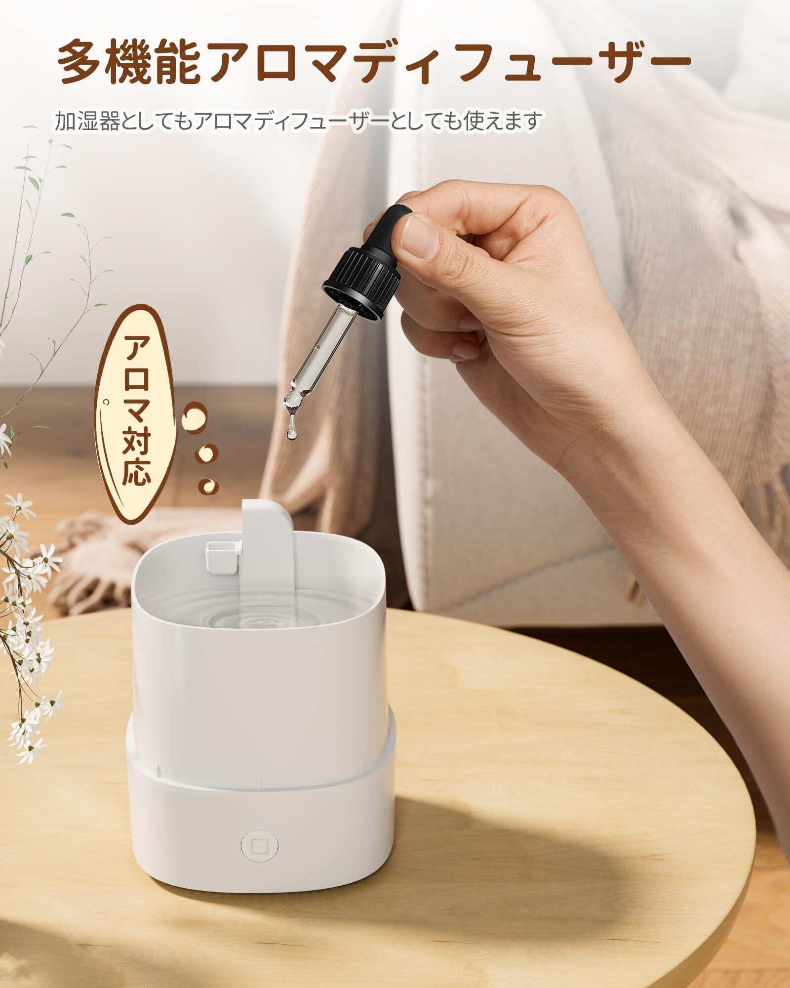 【2025発売新モデル・一台多役】加湿器 アロマディフューザー 小型 次亜塩素酸水対応 除菌 超音波式 卓上 アロマ対応 LEDライト7色 お手入れ簡単 静音 省エネ 空焚き防止 加湿器 小型 コンパクト お手入れ簡単 6-9畳対応 乾燥対策 寝室 部屋用(ホワイト)