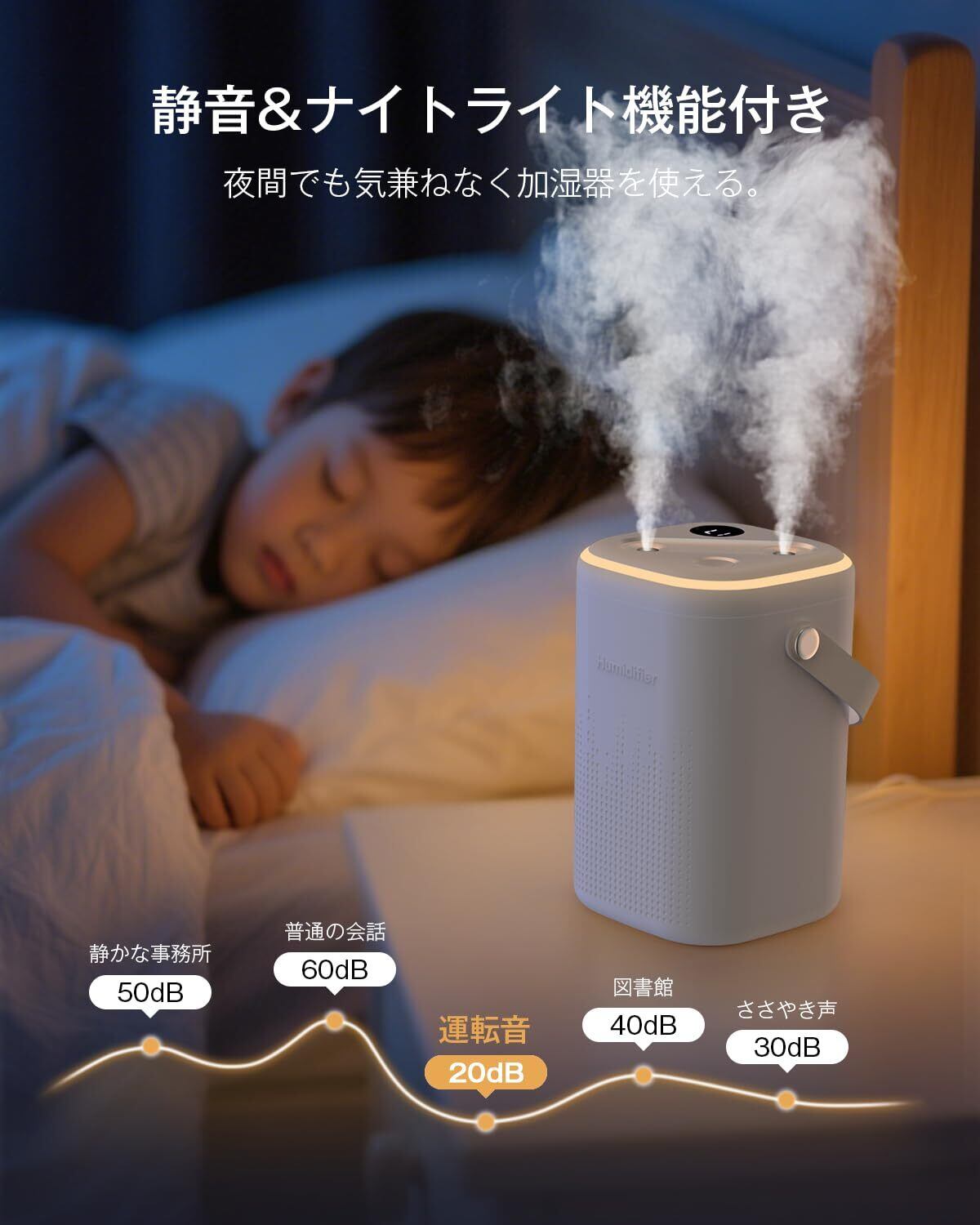【LEDナイトライトで快適に加湿】Zykifyの静音加湿器だ20dBの静音設計は図書館並みの静けさを実現し、夜間の運転音が眠りを妨げません。やわらかなLEDライトが暗闇をやさしく照らすため、入眠がスムーズになるだけでなく、夜中に目が覚めた時も水量や運転状況をすぐに確認できます。わざわざ明かりをつける必要もなく、加湿を続けながら深い眠りをサポートします。本製品は、消灯運転においても加湿機能を使用できます。