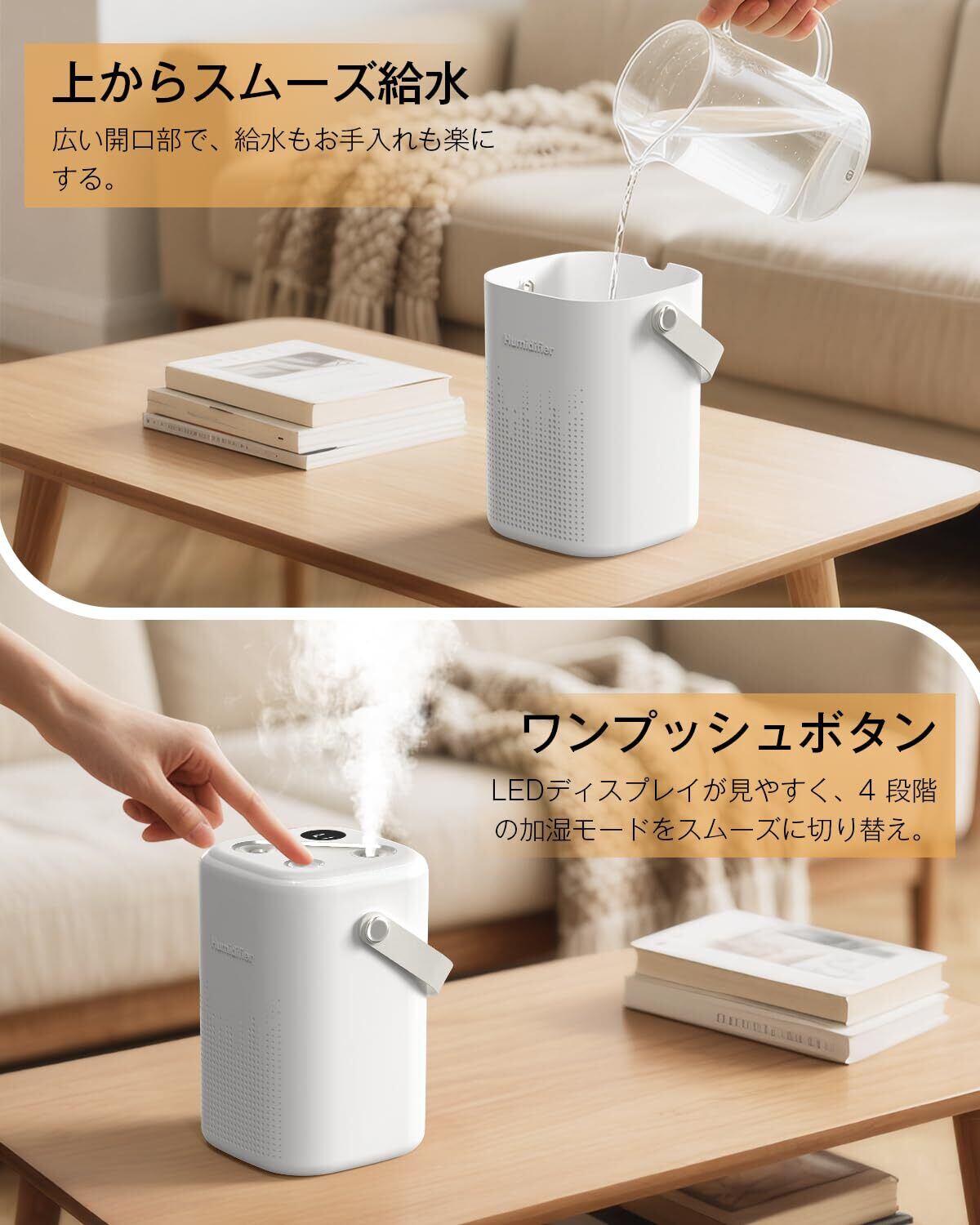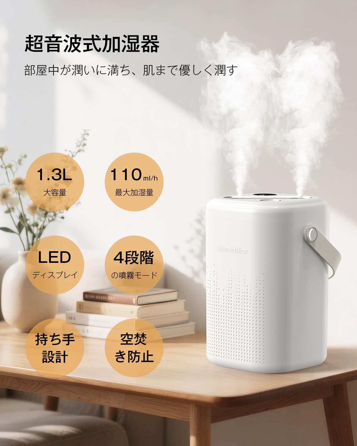 【2025発売新モデル・一台多役】加湿器 小型 1.3L大容量 USB給電式 卓上加湿器 超音波式 4段階加湿モード LEDディスプレイ搭載 静音加湿 自動停止機能 除菌 LEDライト 取っ手デザイン 省エネ 乾燥対策 寝室 子供部屋 車内 家庭用 ギフト