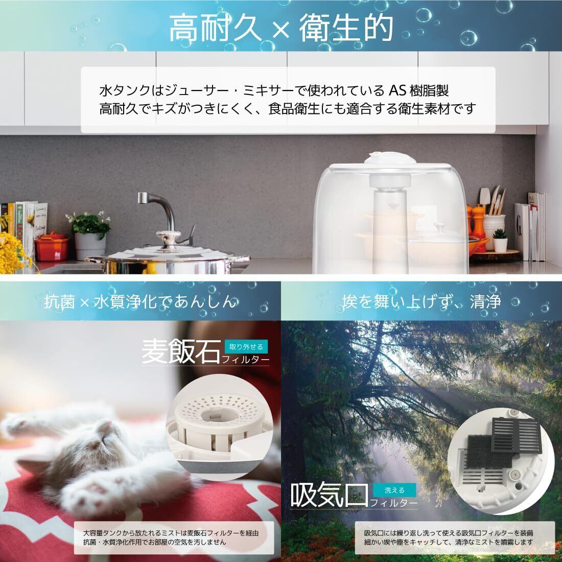 手に触れても安全な、非加熱による常温ミストは空気も汚しません。熱を加えない常温ミストなので手に触れても濡れるだけ、安全設計なので火傷の心配もありません。さらに 、麦飯石フィルターを経由。抗菌・水質浄化作用でお部屋の空気を汚しません。