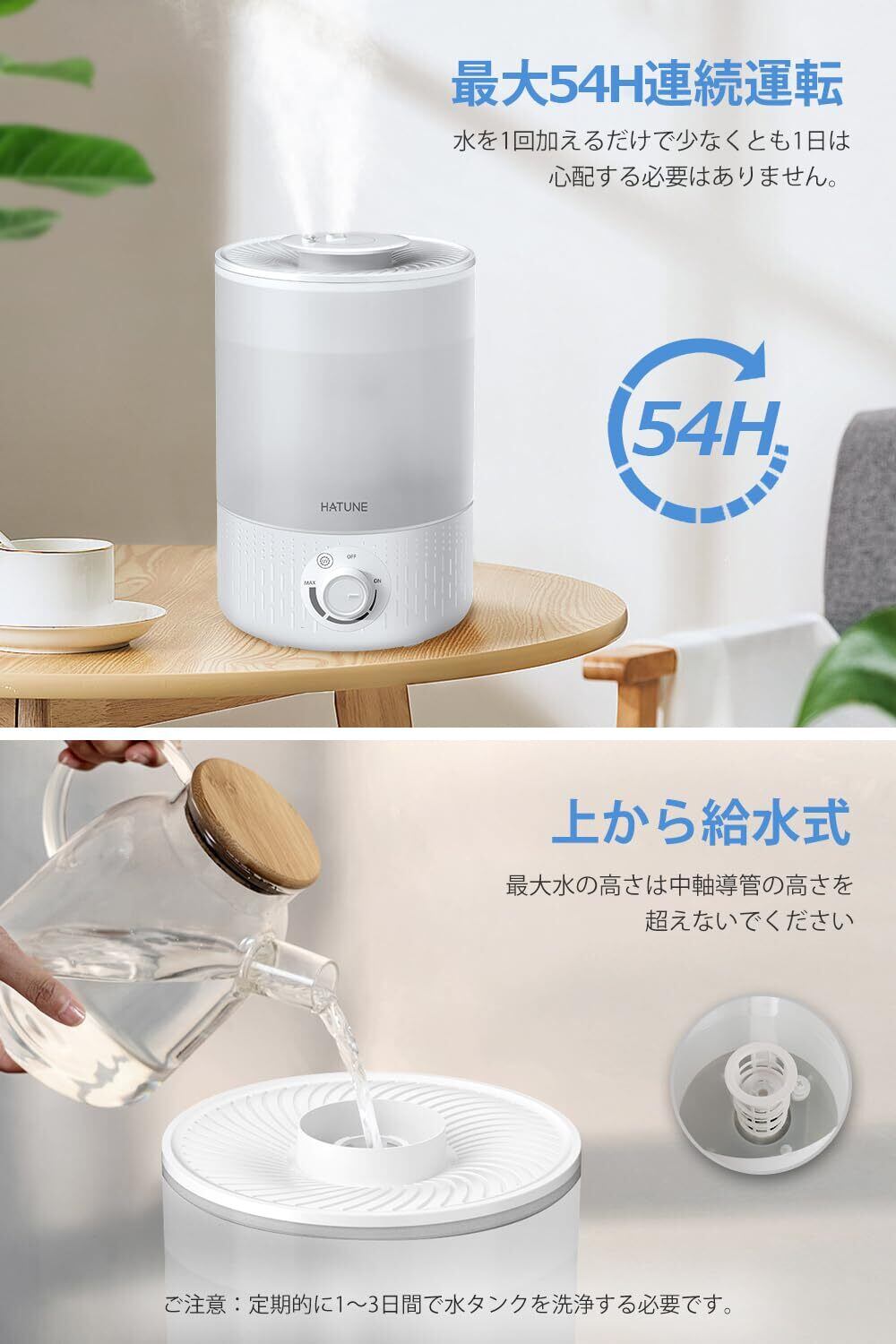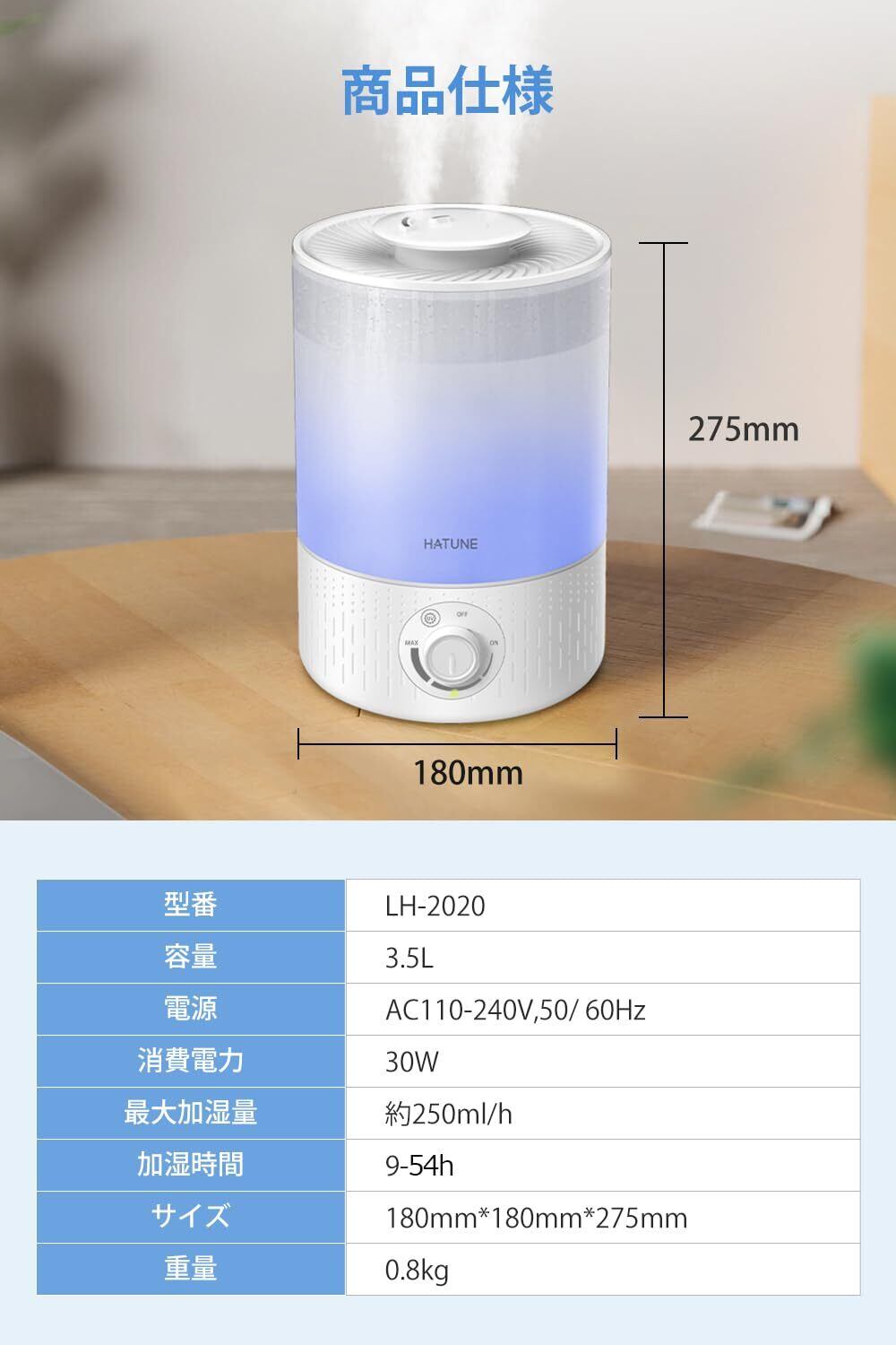 【3.5L大容量加湿器 ✚ 48時間連続作動 】小型の加湿器は、1日に何度も水を追加する必要がありますし、夜寝ている間は水を入れることができません。霧の出方も少なく、欠点が多いです。しかし、3.5リットルの大容量ならば、仕事帰りにしか使わないサラリーマンにとっては便利です。1日に1回だけ水を追加すれば済みます。最大250ml/hの霧出し量で乾燥した部屋を一瞬で快適にしてくれるため、大型のリビングでも使用することができます。また0-250ml/hの無段階霧量調節機能もありますから、小さな寝室やホール、オフィスなど異なる場所でもニーズに合わせて使うことができます。