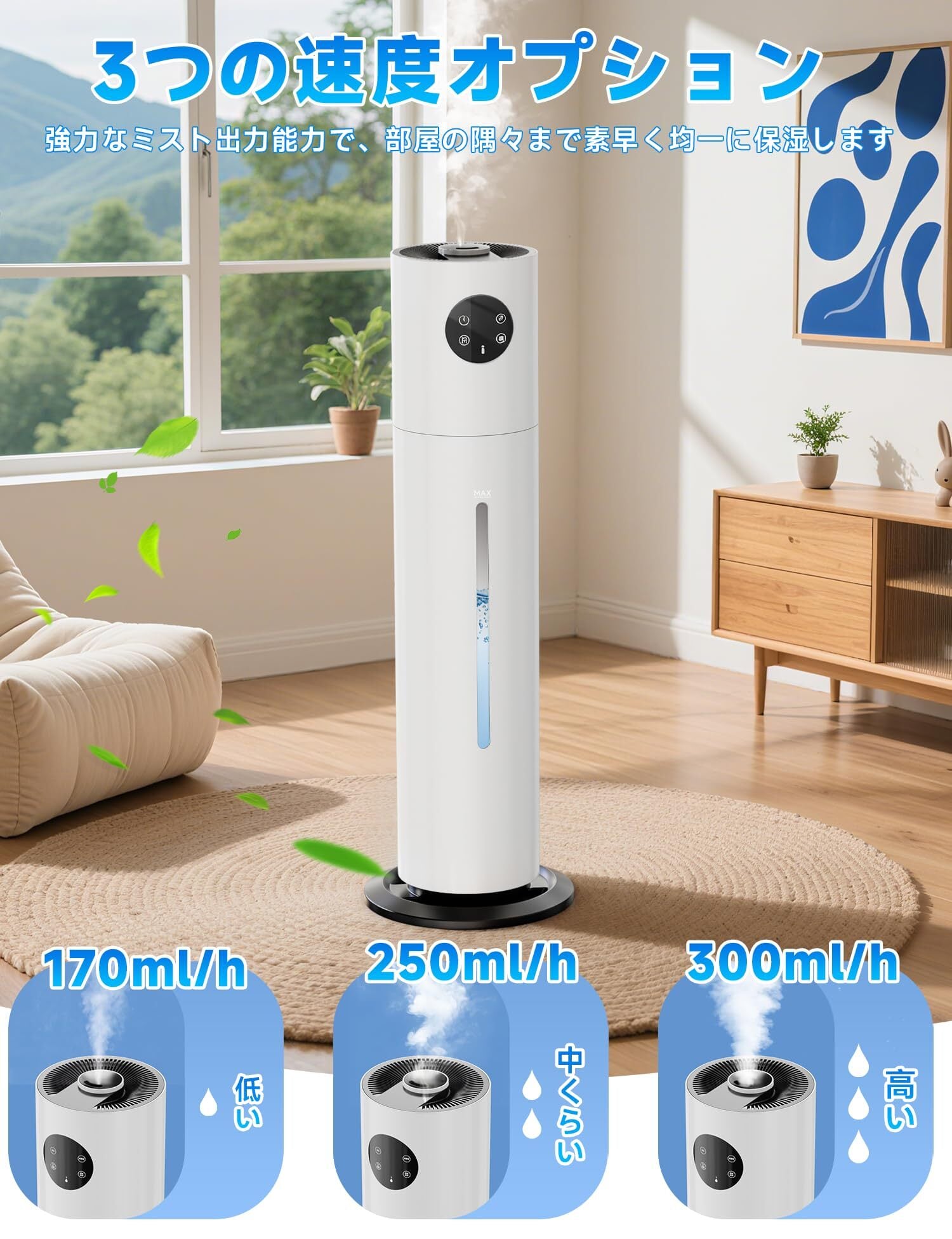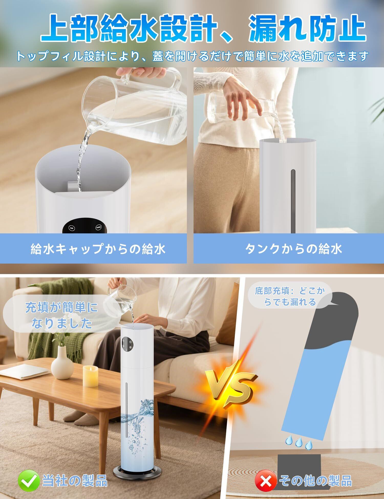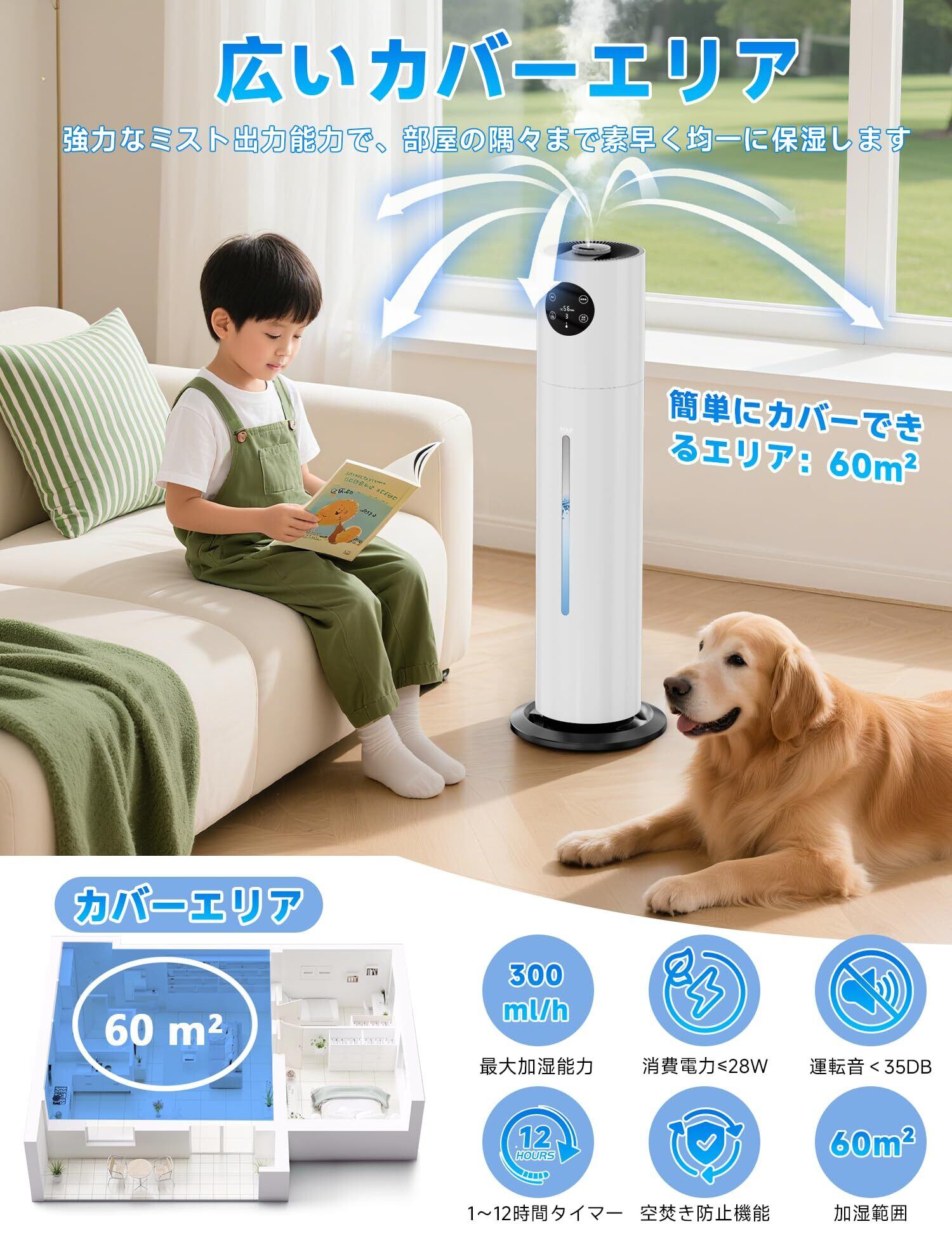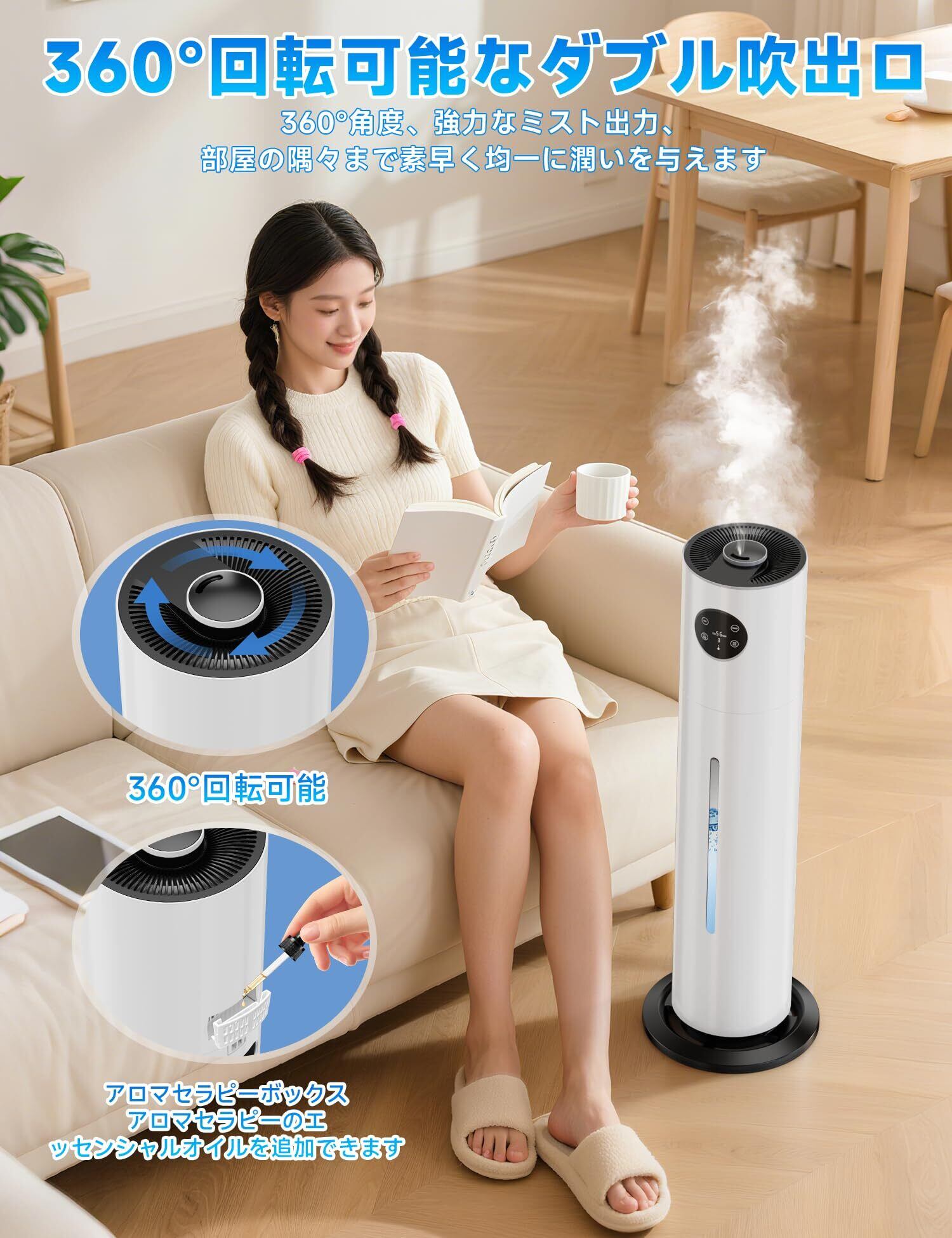 【2025新登場・大容量・8L】強化版の 8 リットル超大容量加湿器は縦型デザインを採用し、超音波振動の原理を利用して、風動装置を通じて高所から霧を噴出するため、加湿の有効範囲がより広く、均一になります。瞬時に乾燥問題を解決し、家族全員に快適な空間と健康的な生活を提供します!フル水補充で驚きの60時間連続稼働(弱モード)が可能、頻繁な水補充を解消し、家族全員が心地よく過ごせる空間を実現します。超音波技術で超微細なミストを放出し、湿度を最適に保つことで風邪やインフルエンザ予防に貢献します。極細の水雲はすぐに蒸発し、床が濡れません。冬の乾燥対策に効果的で、さらに、空焚き防止装置を搭載し、水量が不足すると自動的に電源を切るため、高齢者や子供が使用しても安心できます。