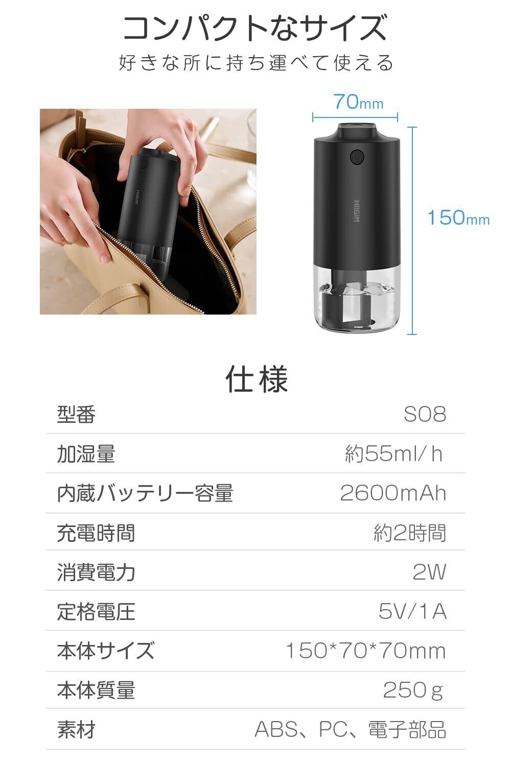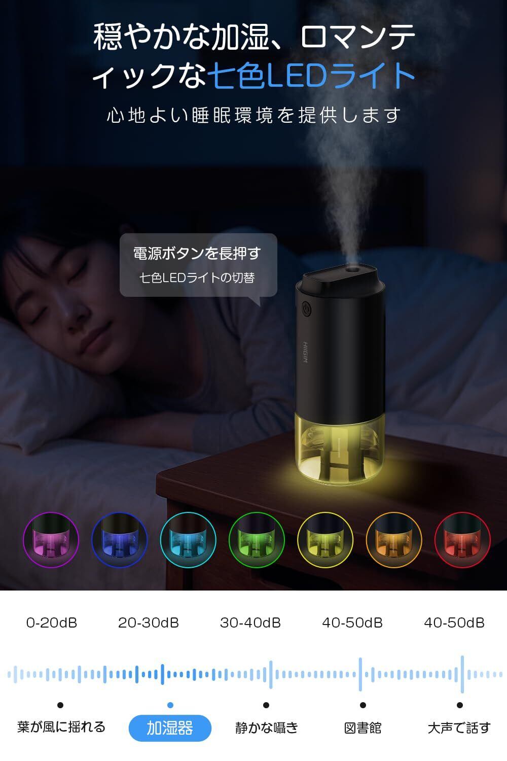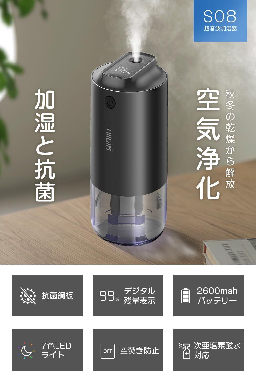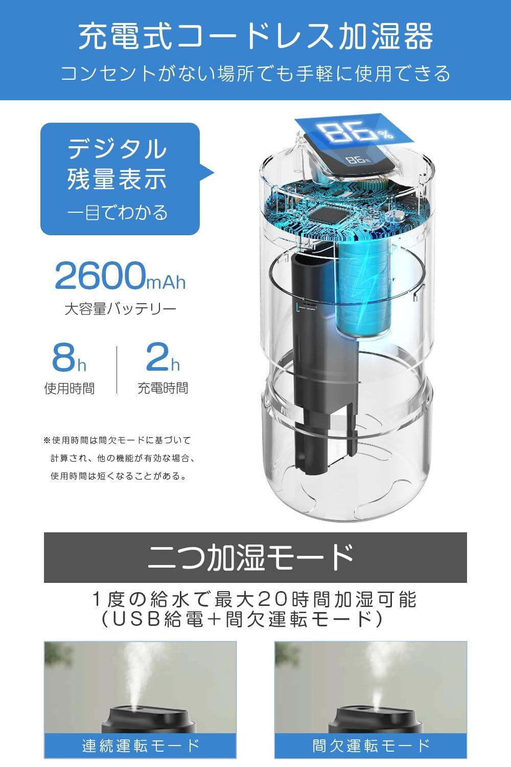 加湿器 小型 卓上 超音波加湿器 【2025新登場&抗菌鋼板&デジタル残量表示】 20時間加湿 コードレス Type-C充電式 55ml/hパワフル加湿 2600mah大容量バッテリー 除菌 次亜塩素酸水対応 アロマ対応 空気清浄機 コンパクト 静音 7色LEDライト 水漏れ防止 乾燥/花粉対策 寝室/オフィス/車用/プレゼント