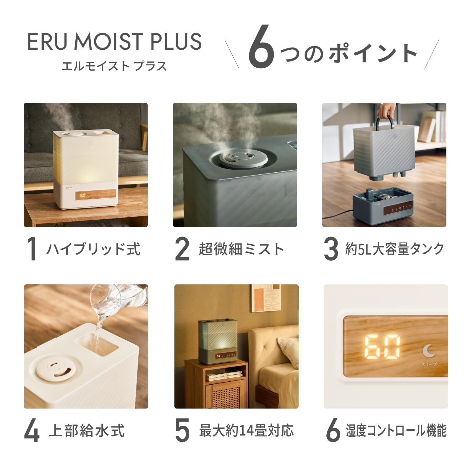 QUADS(クワッズ) 大容量 5L ハイブリット加湿器 14畳対応 最大加湿500ml/h 湿度設定 上部給水 アロマ対応 超音波 ヒーター ウォーム運転 タイマー 抗菌カートリッジ LEDライト ERU MOIST PLUS エルモイストプラス (グレー)
