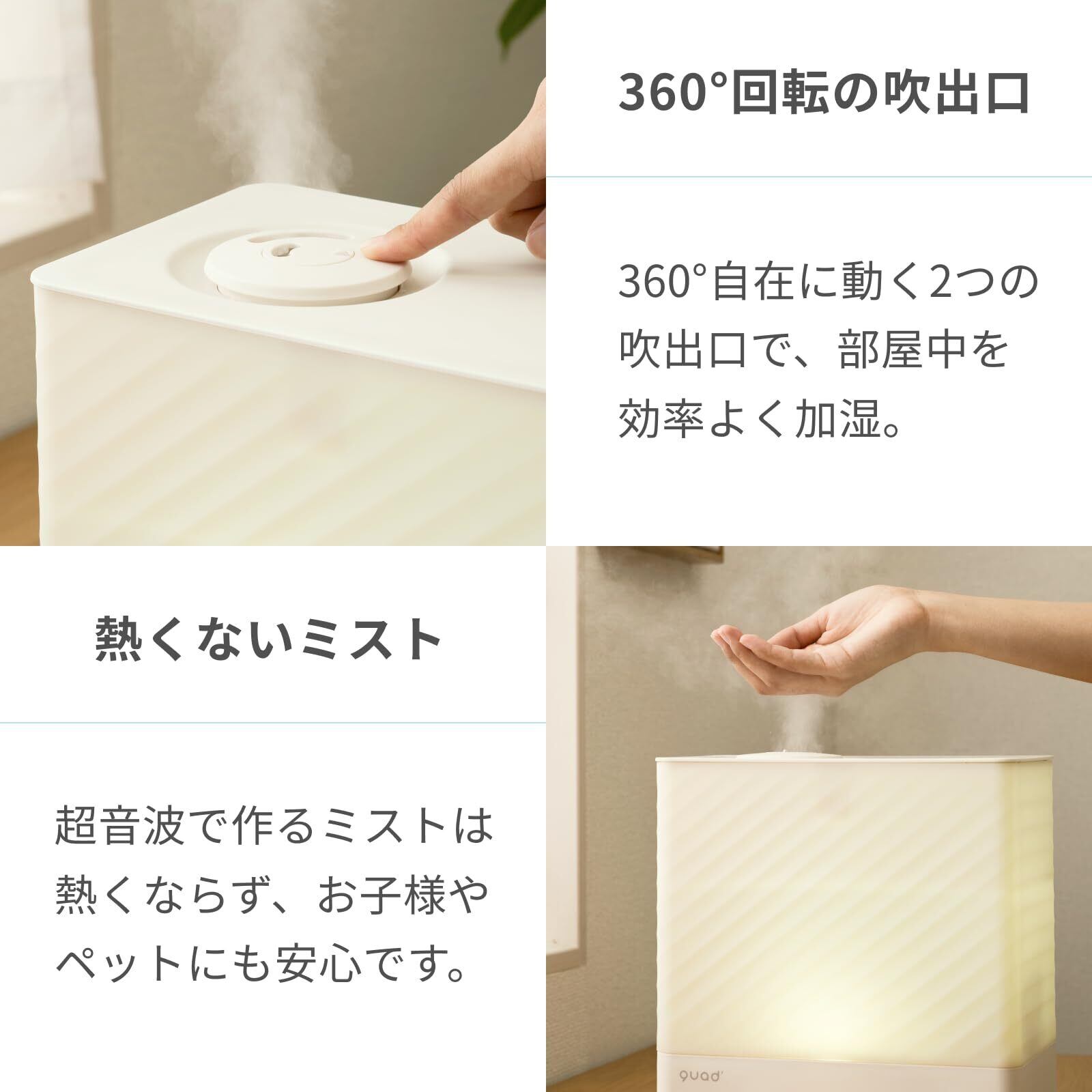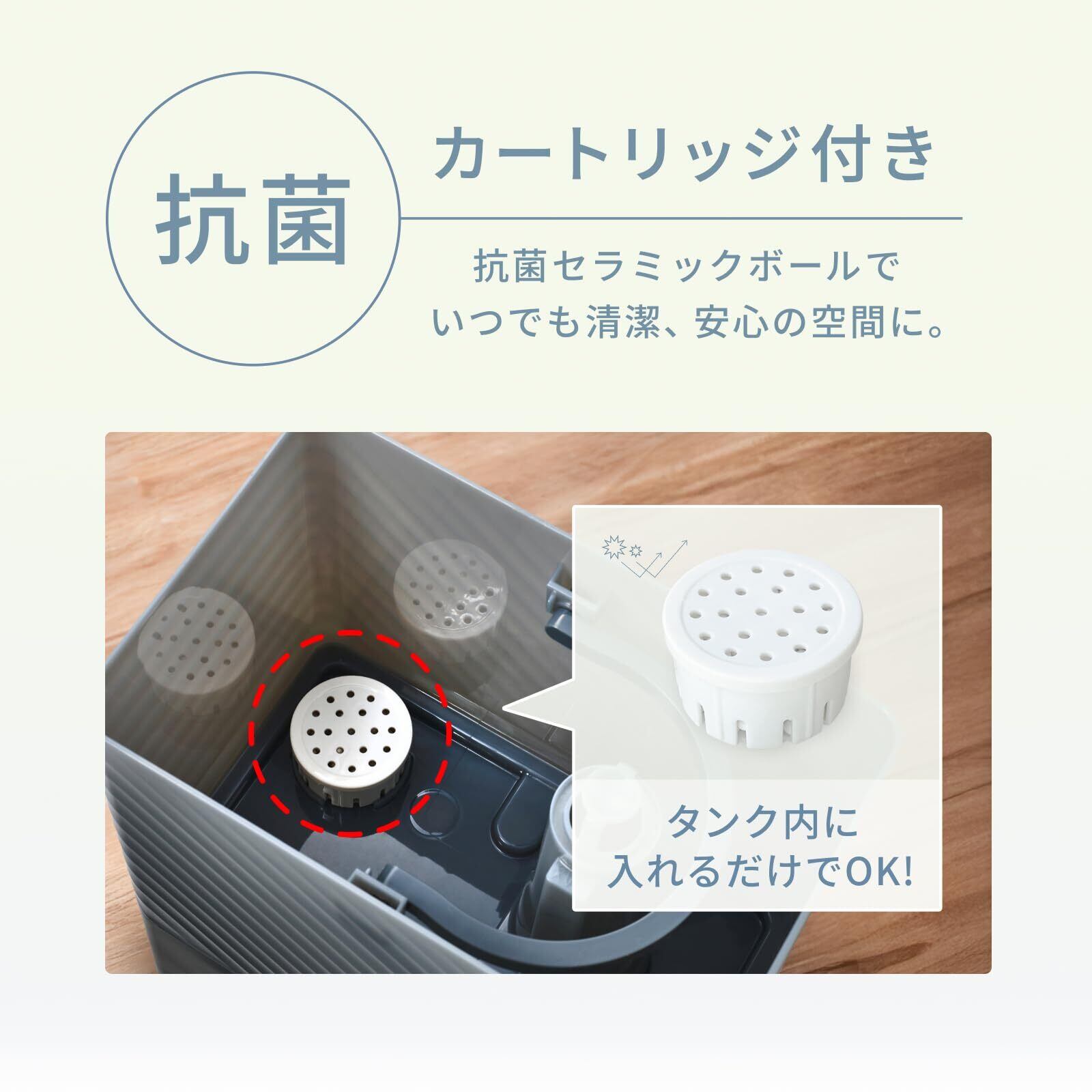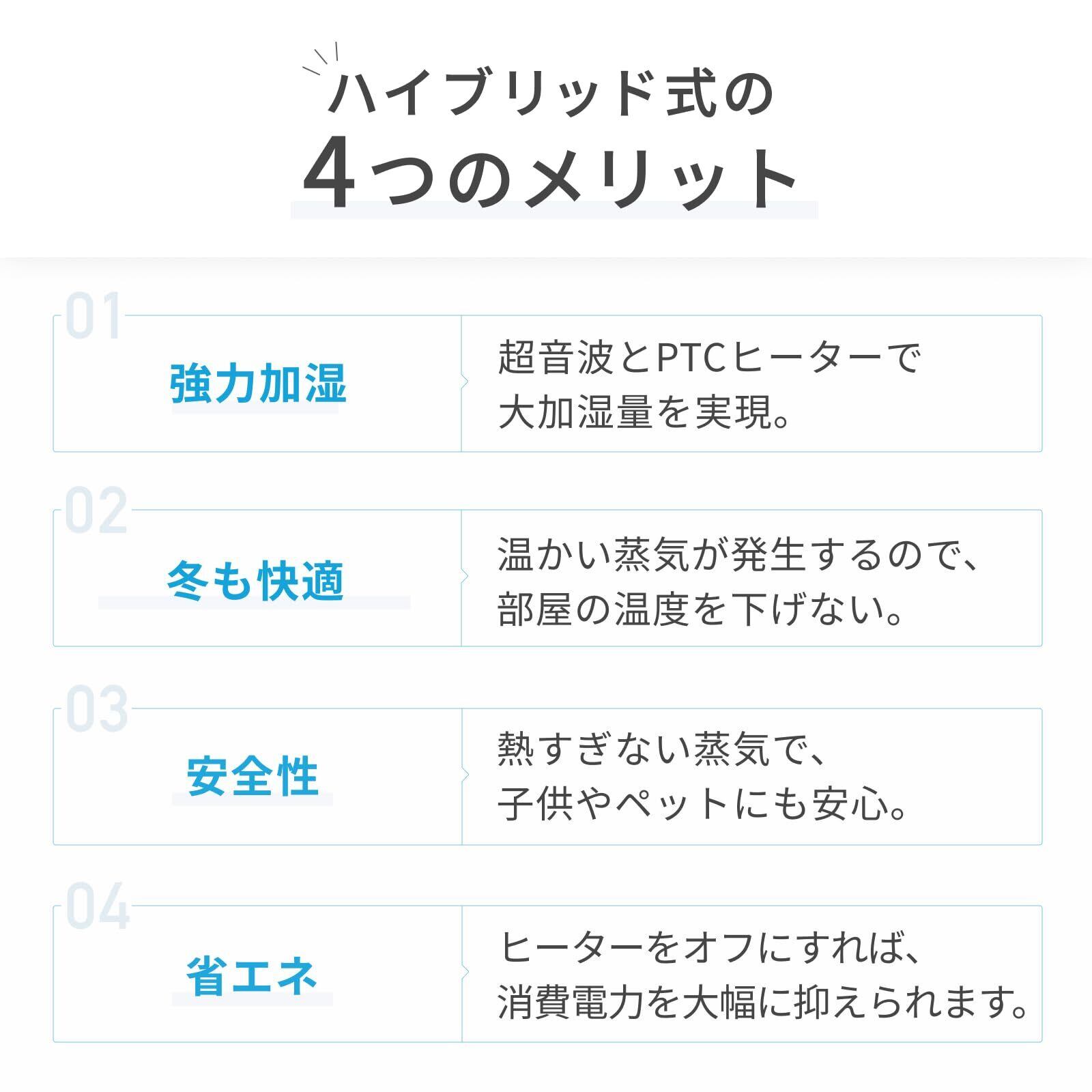 ■超音波式加湿、省エネでスピード加湿を実現! 超音波振動板とPTCヒーターを組み合わせたハイブリッド式を採用。 本体内部の温められた超微細ミストを噴霧することで、加湿中もお部屋の温度が下がりにくく、快適な室温を保てます。