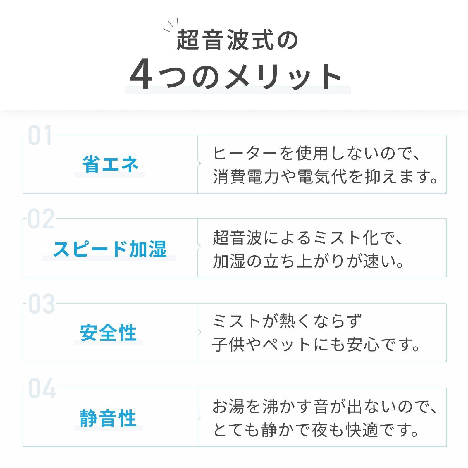 ■超音波式加湿、省エネでスピード加湿を実現! 本体内部の超音波振動板により、水を振動させることで、非常に細かいミストを噴霧します。 ミストが熱くならず、静音なので小さなお子様がいるご家庭でも安心してお使いいただけます。