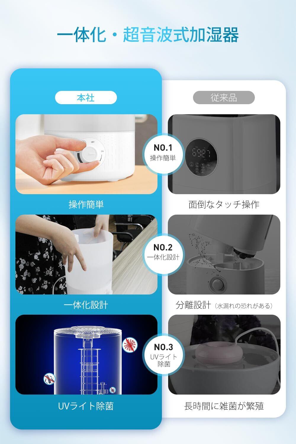 【3.5L大容量加湿器 ✜ UVライト除菌】3.5Lの大容量タンクを搭載し、タンクと台座が一体化した設計で、しっかりと水漏れを防止しています。UVライトは抗菌機能があり、UVボタンを触れるとライトが点灯し、水中の細菌を99%取り除きます。この加湿器は清潔なミストを噴出することができます