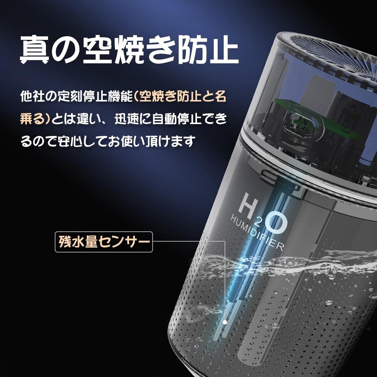 【真の空焼き防止機能】 市販の多くの小型加湿器が空焼き防止と名乗りますが、実は定刻停止機能(4時間運転後自動停止)です。 水が残っても時間になると勝手に運転停止になるストレス、再起動すると水がなくなっても何時間空焼き運転する不安はあるでしょう。 それに対して、KMJの小型加湿器は水量センサーを搭載し、水がなくなったら直ちに運転を自動停止する仕様なので、子供のいるご家庭や寝室用/車用の場合にも安心してお使いいただけます。 本当の意味の空焼き防止機能のおかげで、電子部品への損傷が少なく製品の耐久性も高くなります。