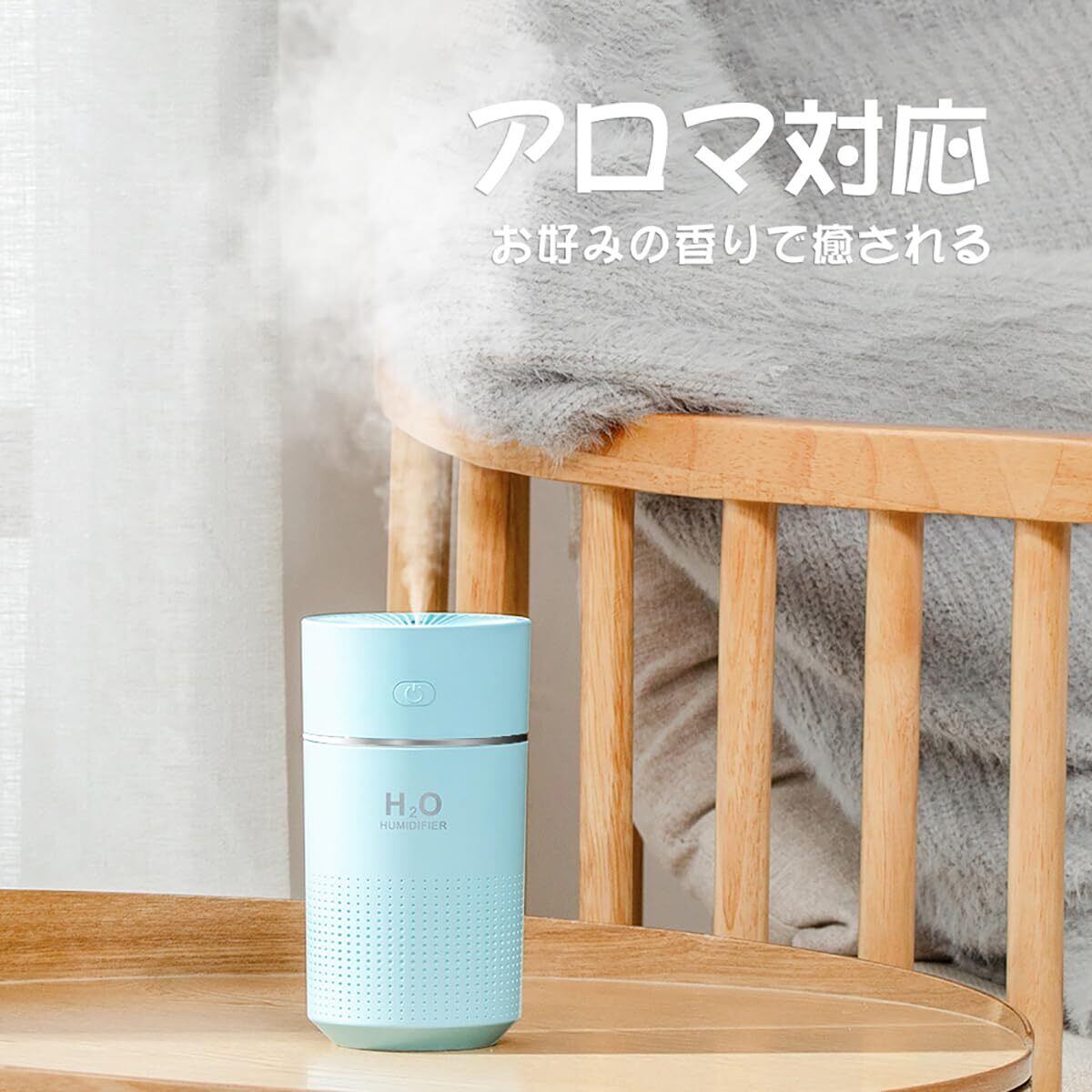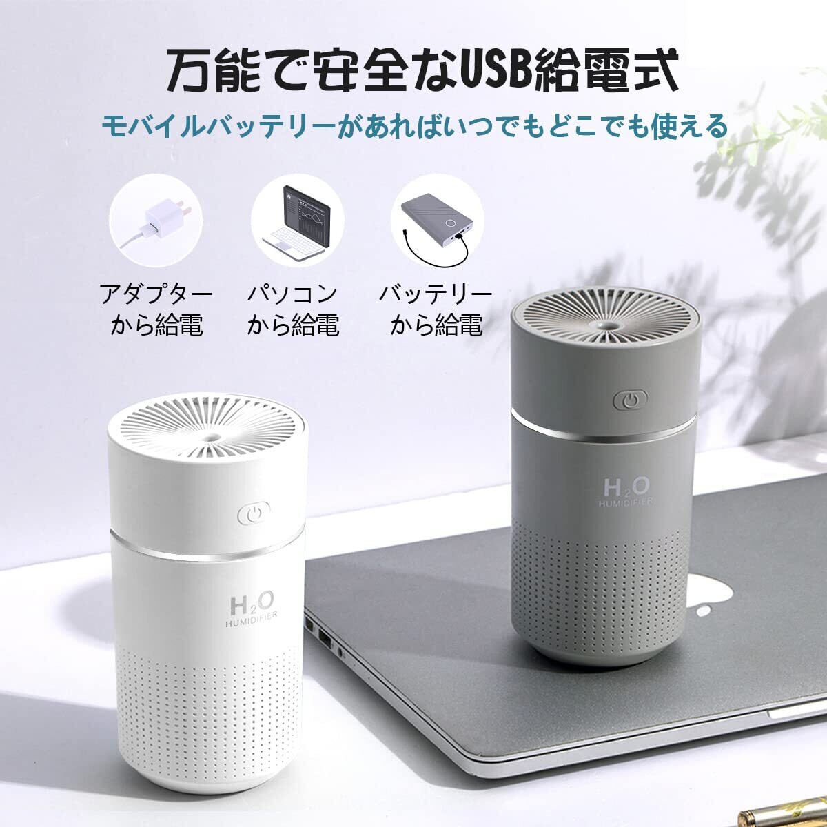 【便利で安全なUSB給電式】 本品はUSB給電式を採用しており、アダプターだけでなく、パソコンやモバイルバッテリーからも電源がとれるからどこでも使いやすいです。 さらに、充電式加湿器(運転時間が2、3時間だけなのに充電時間はそれ以上、電源を繋ぎっぱなしに使用するのも過充電が気になる)とは違い、 こちらの給電式加湿器は過充電がないので安全性が高く、大容量モバイルバッテリーと併用すれば運転時間を20時間以上大幅に延ばせるので便利性も高くなります。