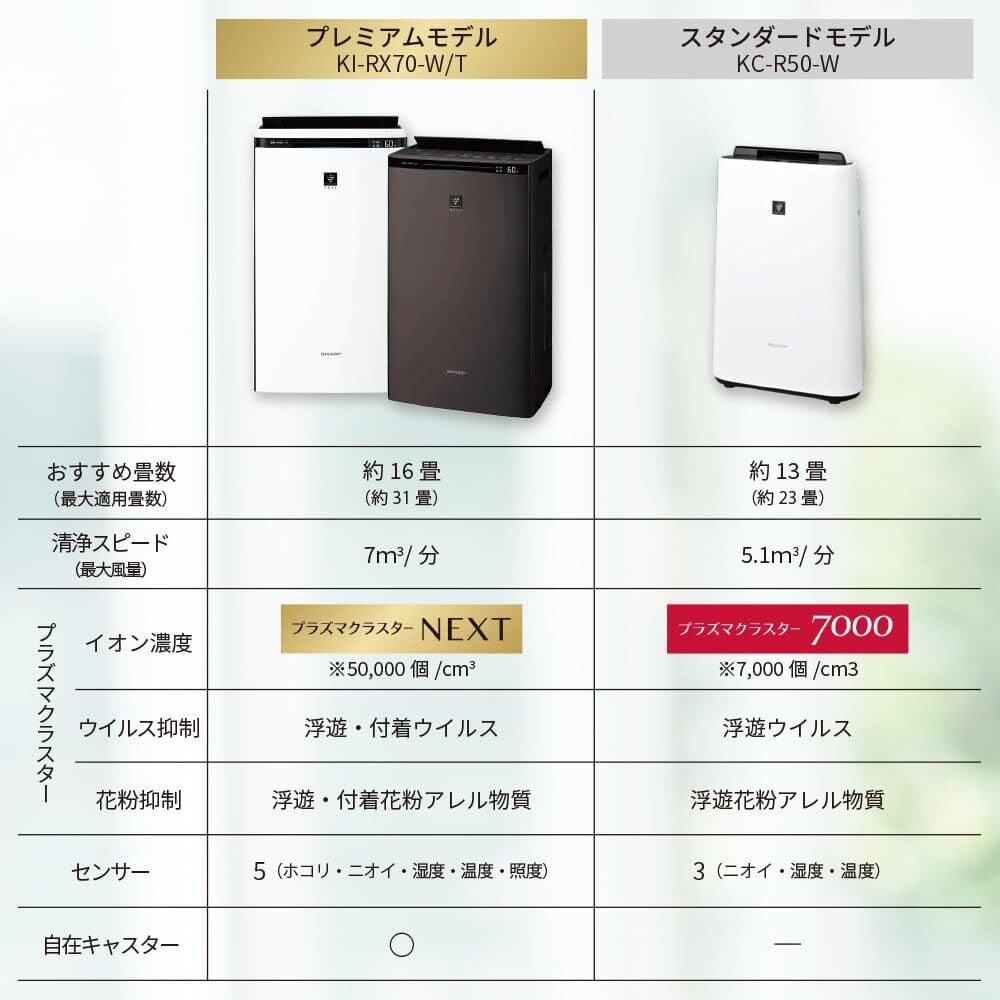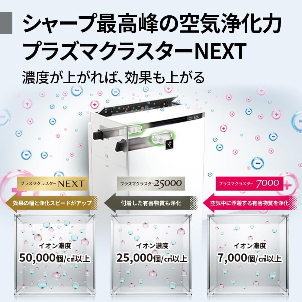 プラズマクラスターNEXT。これがシャープ最高峰の空気浄化力。プラズマクラスターNEXTは自然界をはるかに上回る1cm³あたり50,000個以上の高濃度のイオンで、空気リスクに立ち向かいます。浮遊、付着ウイルスの作用を抑える、浮遊、付着花粉アレル物質の作用を抑える、浮遊カビ菌を除菌、付着カビ菌の増殖を抑制、ダニのふん・死がいの浮遊アレル物質の作用を抑える、静電気を抑える、タバコの付着臭を分解・除去、浮遊菌の作用を抑える。遠くのホコリも引きよせるスピード循環気流。方向気流制御ルーバーにより、広いリビングにもイオンを効率よく届けながら、コアンダ効果を応用した気流で遠くのホコリもしっかり引き寄せ、背面全体でパワフルに吸引します。大面積でパワフルに集めて吸い込む背面ワイド吸引:背面全体の大きな吸い込み口で、汚れた空気をパワフルに吸引します。汚れに合わせて自動で気流を切り換える「おまかせ運転」:センサーで検知した空気の汚れに合わせて、自動で気流を切り換えて効率的に浄化します。効率よくイオンを届ける3方向気流制御ルーバー:3方向制御ルーバーにより、空気の汚れに応じて自動で気流を切り替えます。「ウイルス飛沫粒子」の捕集における有効性を確認した「飛沫粒子モード」を搭載:ウイルス飛沫粒子がよどみやすい天井面を直接狙って、循環気流に乗せて吸じんする「飛沫粒子気流」により、効率よく捕集できることがシミュレーションにより確認できました。業界初シャープ製のエアコンと連携し、さらに快適空間「空気清浄連動」:空気清浄機の設置位置に応じて、エアコンの風向、風量を自動で調節。お部屋の空気が効率よく循環するので、ウイルス飛沫粒子を効果的に捕集します。他にも、便利な連携がお使いいただけます。大容量加湿を実現する独自構造:独自の加湿構造で、高い加湿性能を実現。これまで以上に快適なうるおい空間を作ります。二層構造の加湿フィルター:集めた風を2枚の加湿フィルターで加湿。風を2回通すことでより多くの水を気化して放出します。キレイにうるおう、清潔加湿。タンクのキャップに簡単装着できる「Ag⁺イオンカートリッジ」で、タンクやトレーのぬめりやニオイの原因となる水中の菌を抑制。1年に1回の交換でキレイが続きます。加湿をしていない時は加湿フィルターが水につからない位置で停止し、送風で乾燥されるため清潔です。給水回数 最大1/2削減:クラウドに接続することで、センサー情報をもとに在室/不在を判別します。お部屋に人がいない時はムダな加湿を抑制し、給水の手間を低減します。汚れたらはがして捨てるだけ「使い捨て加湿プレフィルター」対応:ニオイの原因となる汚れが、加湿フィルターへ付着するのを軽減。清潔にお使いいただけます。ハンドル付き給水タンク:ハンドル付きで持ちやすく、自立するので給水やお手入れがラクラク。広口キャップで洗いやすい。COCORO AIR搭載でもっと便利に快適に:スマートフォンと空気清浄機を無線LAN接続すると、クラウドのAIにつながり運転状況や空気情報を蓄積して分析。ご家庭の使用状況に合わせて、賢く成長します。「おやすみ運転」のセットや風量の調整などは、AIにおまかせ。自動で快適な空気環境をお届けします。