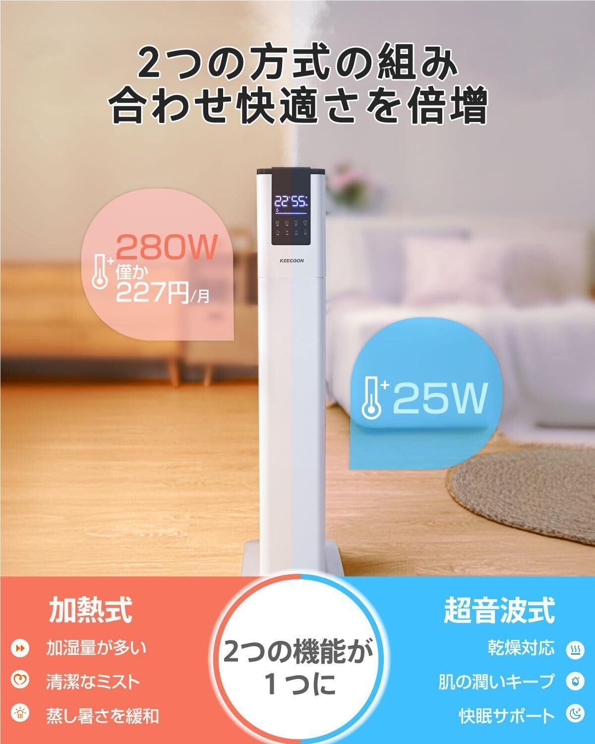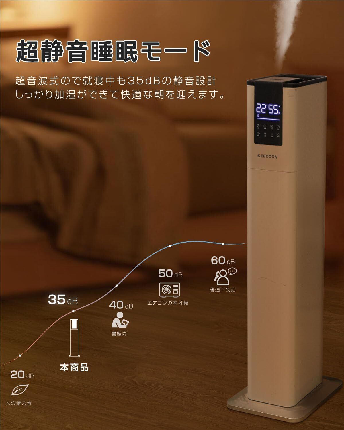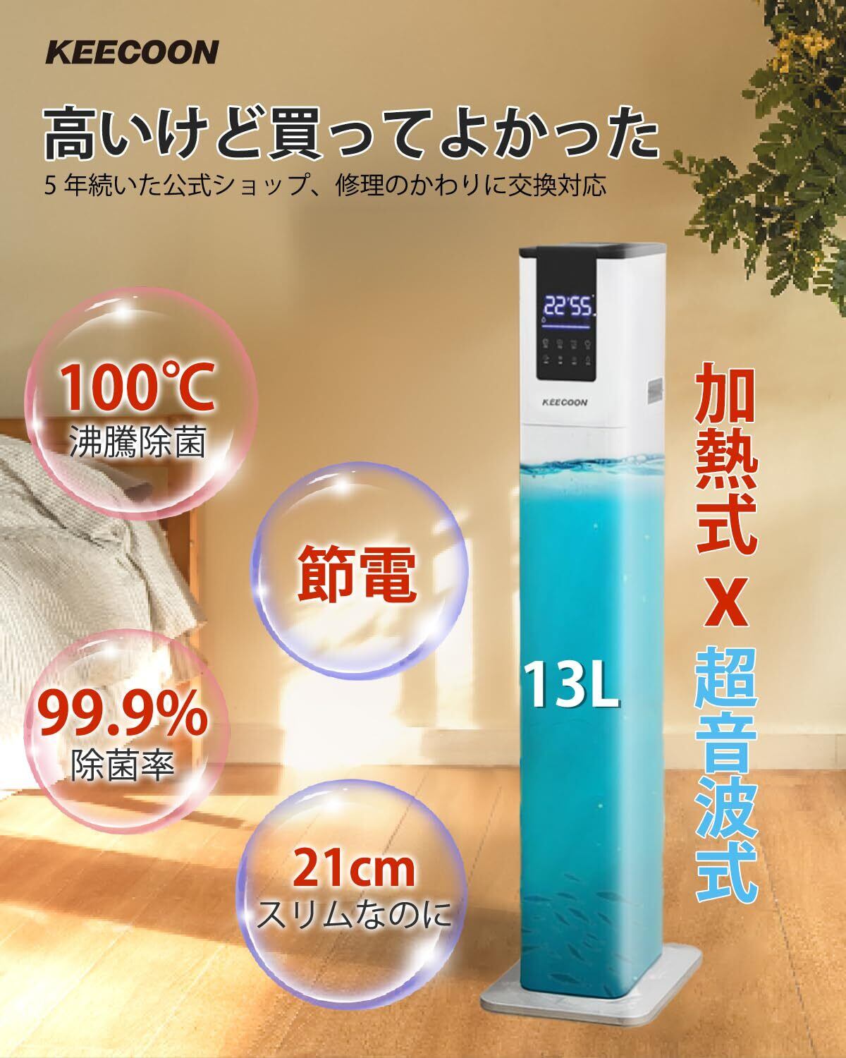 【対応&安全装置】スラッとしたデザインの割には安定感があり倒れる心配もなく、細長い形で置き場所も取らない(寸法:82×21×28cm)、白くてスリムで見た目もスタイリッシュで高級感あり、どこに置きてもピッタリ。KEECOON スマート加湿器 はPSE認証が取得し、発送前に厳しい品質検査を実施しています。ご購入いただいた12ヶ月、30日間以内に無料交換のご対応が提供いたします。何か不具合・ご不明な点がございましたら、お気軽に弊店までご連絡ください。ぜひ誠心誠意に対応させていただきます。