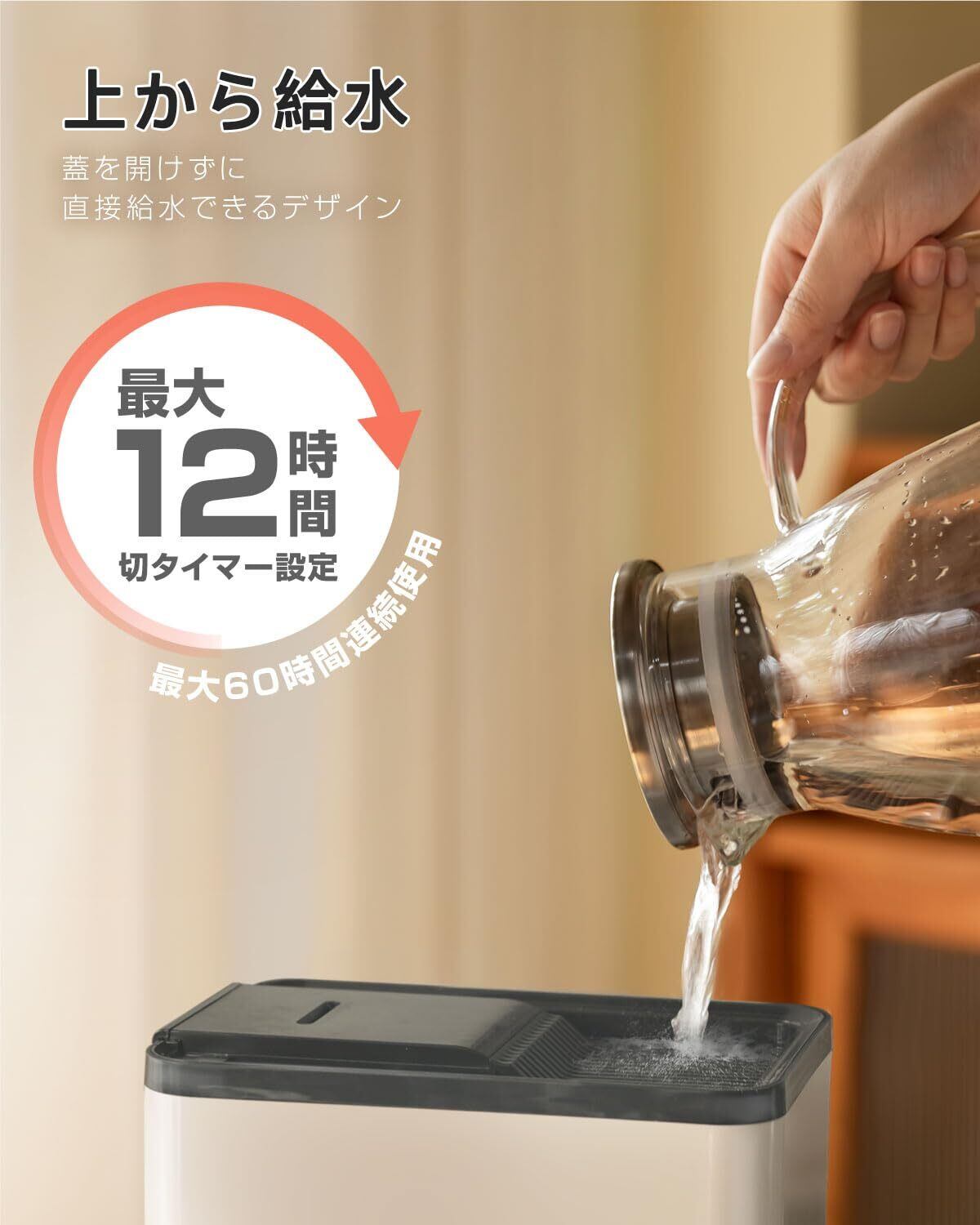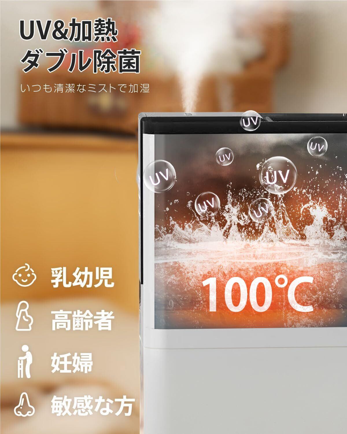 【切タイマー機能 & 自己清潔】12時間の切タイマーが付き、1時間を単位に12時間までが設定できます。就寝や外出の際、切タイマーを設定すれば、安心して使用いただけます。また、おやすみモードを使うと、表示パネルが消灯したままで運転しますので、光が気になる方でもぐっすり眠れます。さらに、UVライトと能により水を浄化し、噴出されるミストが清潔です。赤ちゃんや高齢者、女性の潤いケアに最適です。