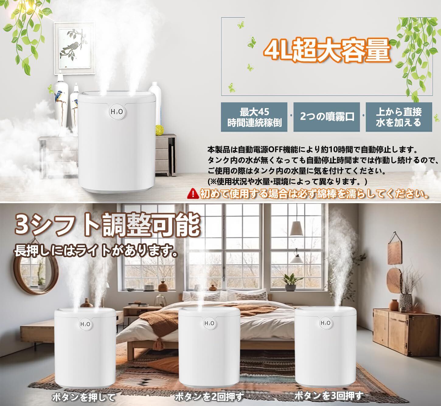 加湿器 大容量 4L【2024年新登場& 45H連続運転&省エネ& マイナスイオン】加湿器卓上 かしつき 上から給水 空焚き 水漏れ 防止 乾燥対策Type-C插電式 3段階ミスト量 静音設計 乾燥対策 省エネ 寝室/リビング/オフィス ホワイト PSE認証済み日本語説明書(白)