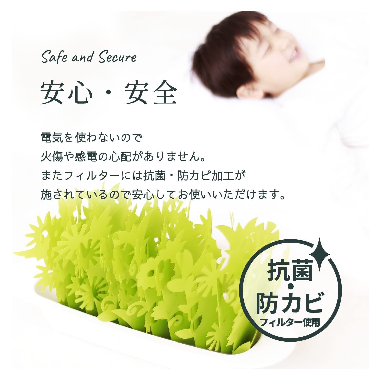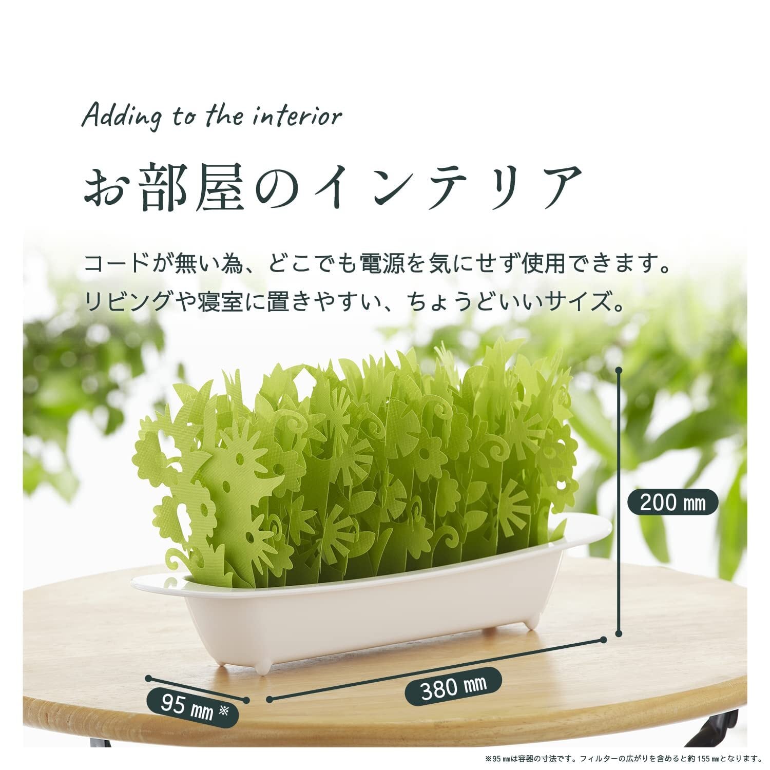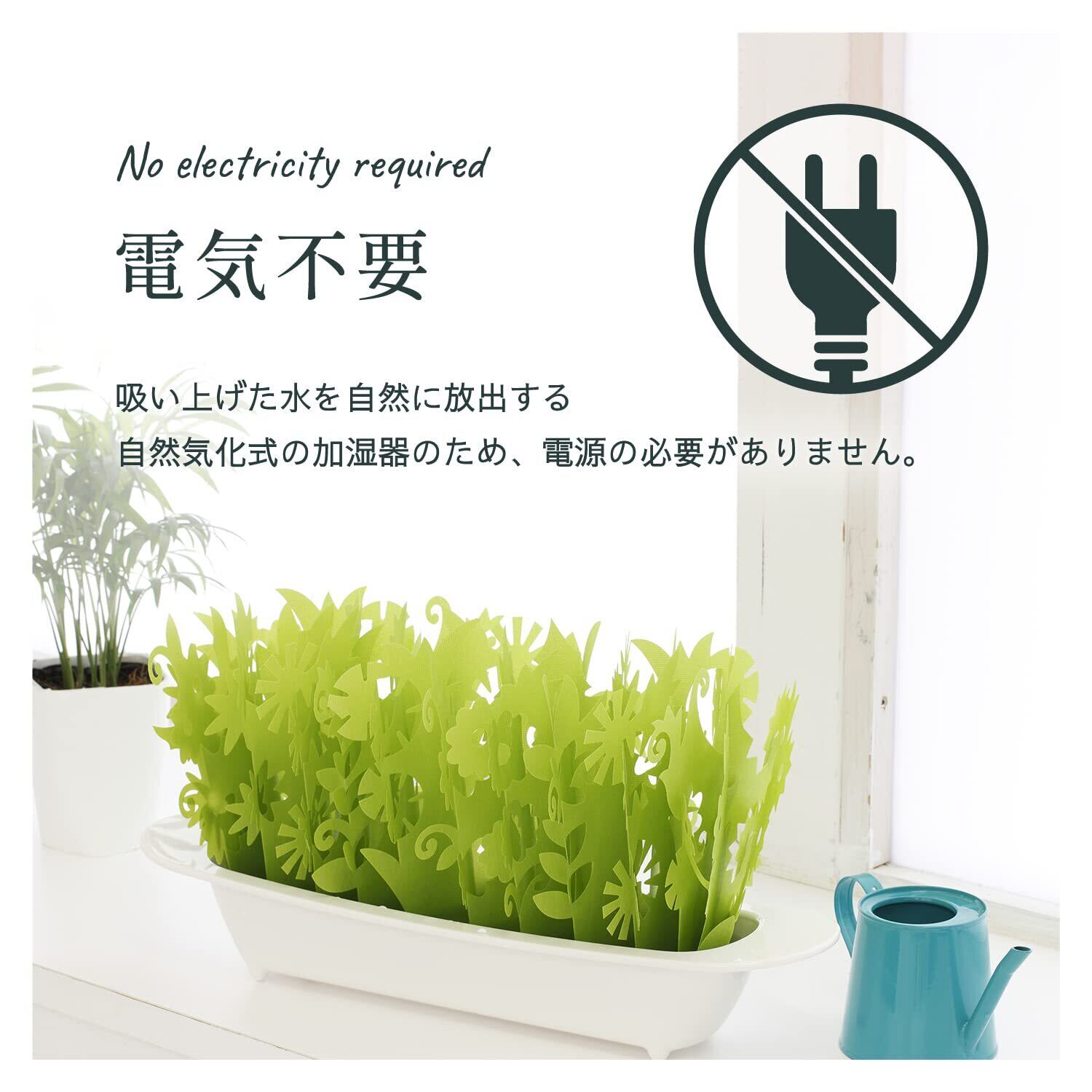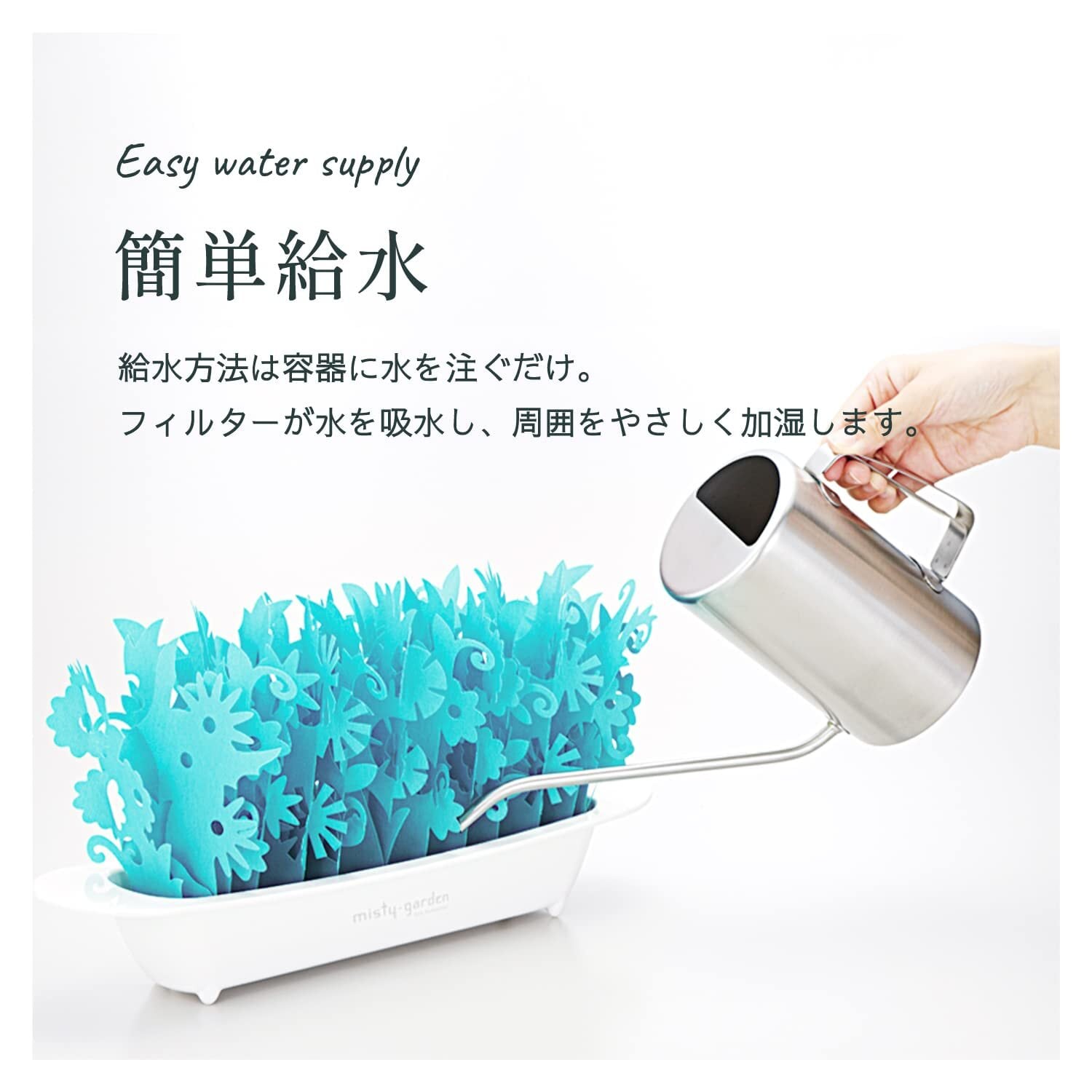 容器が400ccから500ccへ加湿量も30倍から40倍にミスティガーデンが2ndとしてリニューアルしました。容器に水を注ぐだけの電気を使用しない自然気化式のエコ加湿器。オフィスやリビング、寝室などで専用のアロマウォーターを使用すれば、香りも楽しめリラックス・消臭(アンモニア・酢酸)の効果もあります。抗菌・防カビのフィルターを使用。加湿量(=自然蒸発量)はコップ1杯の自然蒸発量の40倍以上!※室温20度湿度30%の条件下でコップ1杯(52mm)との比較。フィルター交換は1シーズン(3~6ヵ月)が目安となります。交換フィルターは が適合します