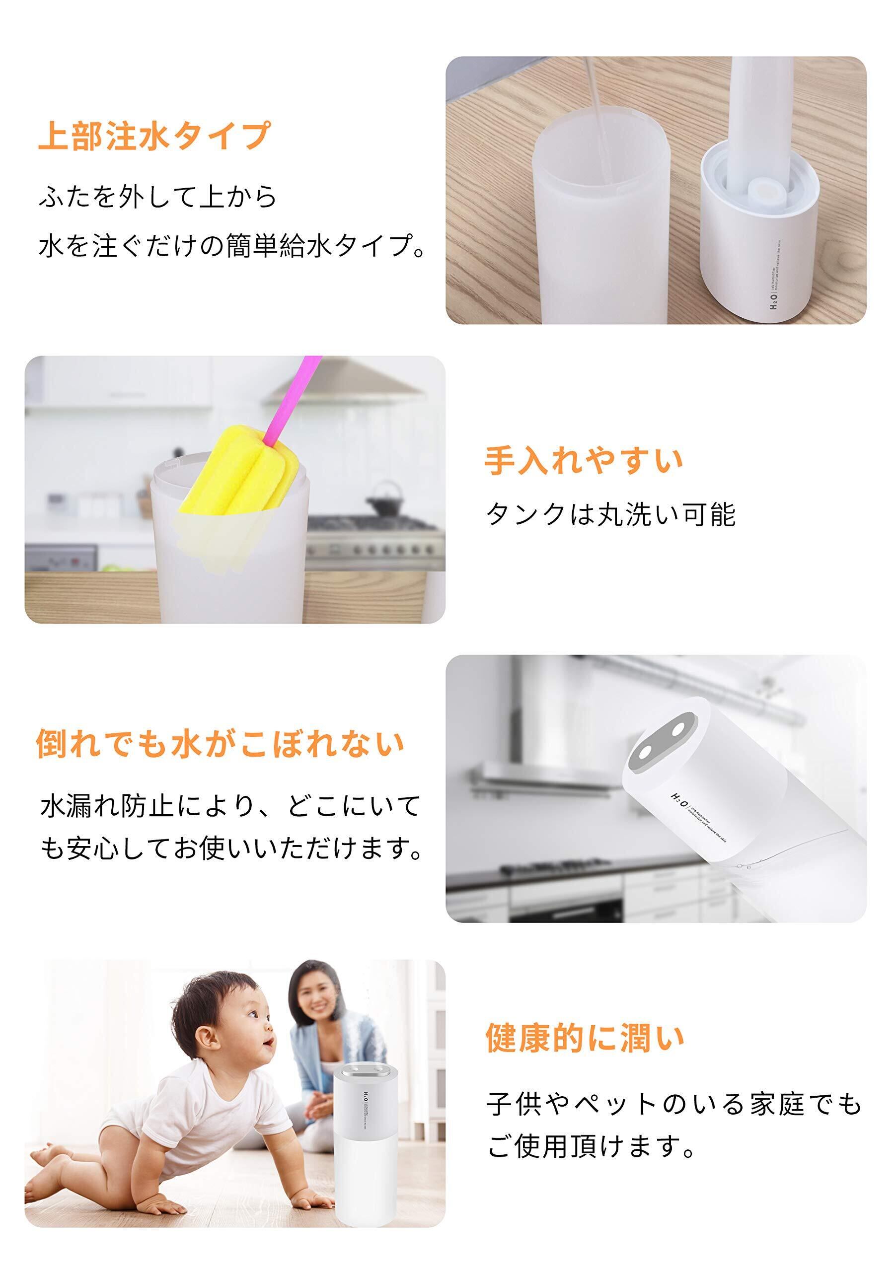 【快適な生活空間を作る】 部屋の湿度を保つだけでなく、ウィルスや花粉症の対策にも効果が期待できる加湿器。部屋の空気を清浄し、埃の飛散、鼻や喉の乾燥を防ぎにも効果的です。テーブルやデスクの上に置ける卓上加湿器は、コンパクトでおしゃれです。とても便利、気軽に生活に導入できます。自宅、寝室、子供部屋、リビング、事務所、オフィス、車内など場所に使えます。お買上げ日より1年間の期限があり、万の一の場合に、遠慮なくご連絡ください。再発送、交換商品などの手数料は全て弊店が負担いたします。