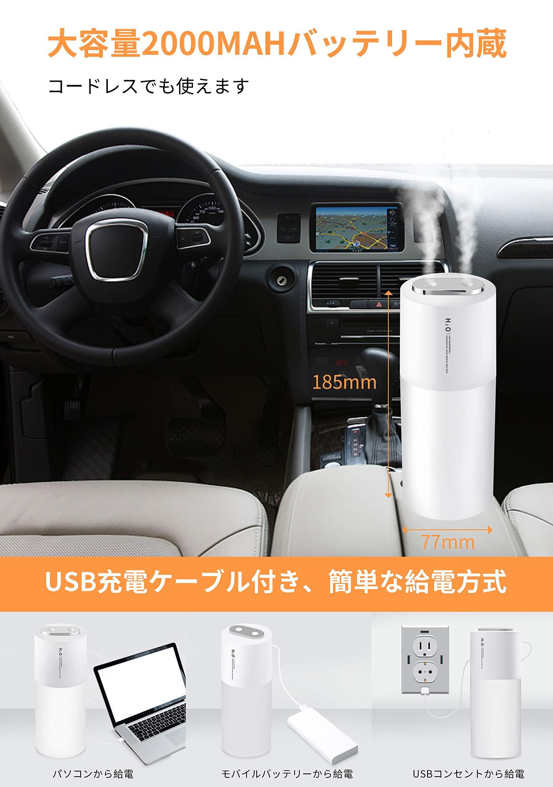【コードレス、2000mAh大容量電池】 USB加湿器は多機能で使い勝手のよいので、出張や旅行などにも最適です。電源はUSBタイプなので、コンセントがない場所でもパソコンやモバイルバッテリーがあれば使えます。USBから直接給電する場合で10時間連続加湿使えます。エコなだけでなく、デザインもかわいくておしゃれなので、インテリアとしても人気があります。