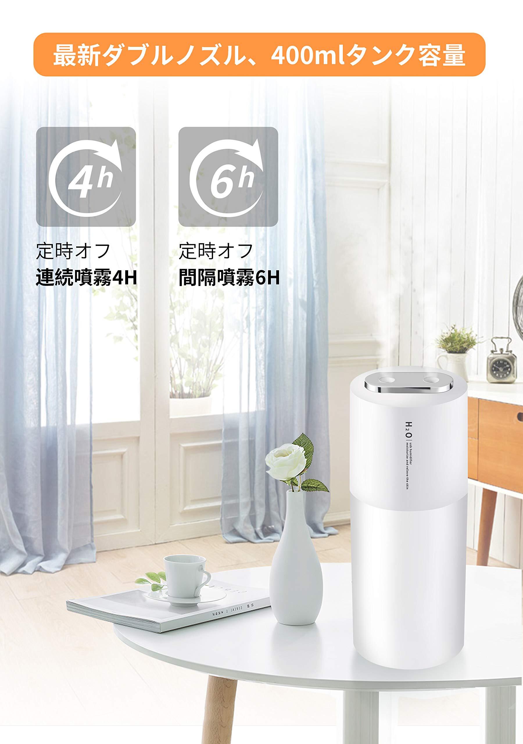 Sugarman 加湿器 卓上 ダブルノズル 400ml大容量 小型加湿器 車用加湿器 超音波式 USB充電式 2000mAh大容量電池 10時間連続加湿 LEDライト 2つ加湿モード 空焚き防止 オフィス 部屋 車載 乾燥/花粉症対策 日本語説明書 | kki