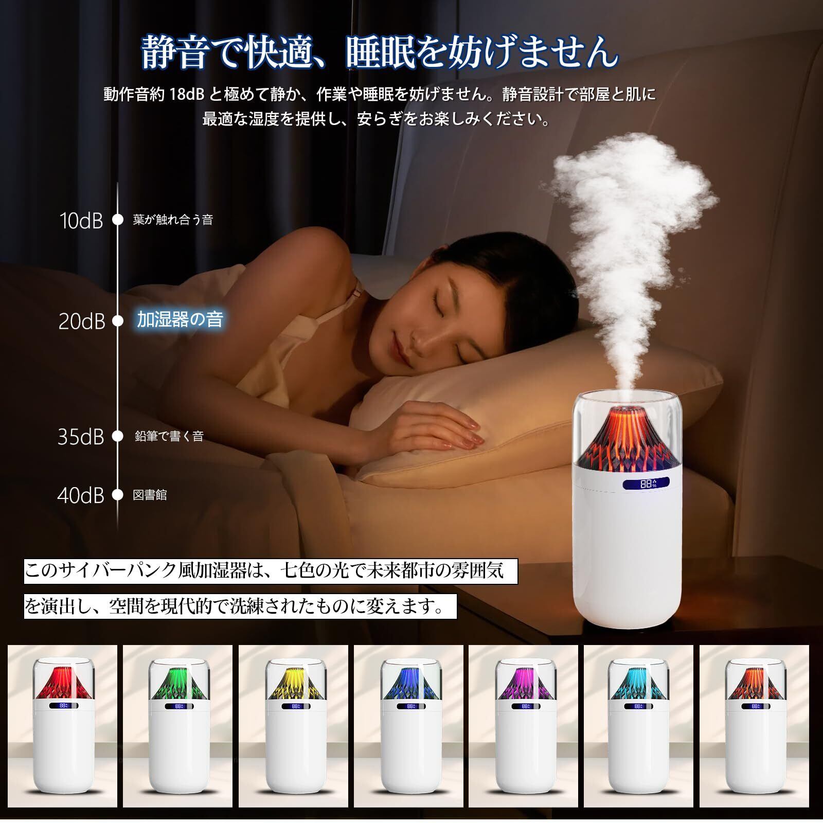 【3 段階調節モード&静音設計&7 色 LED ナイトライト】このサイバーパンク風デザインの加湿器は、外観がコンパクトなだけでなく、3 段階調節モードを搭載。短押しするだけで好みのモードに切り替えられます。1 段階は連続噴霧モードで昼間のオフィス使用に、2 段階は間欠噴霧モードで夜間の休息時にそれぞれ最適。3 段階のアロマモードでは、水溶性のアロマを入れると、心地よく静かな雰囲気を作り出して睡眠を促進してくれます。さらに静音設計を採用し、運転音は 25dB 以下。図書館よりも静かで、周囲の湿度を保ちながらも、仕事や睡眠を邪魔することがありません。加えて 7 色の LED ライトを搭載しており、点灯すると未来的な都市の雰囲気を演出し、あなたの空間を現代的で洗練された場所に変えてくれます。