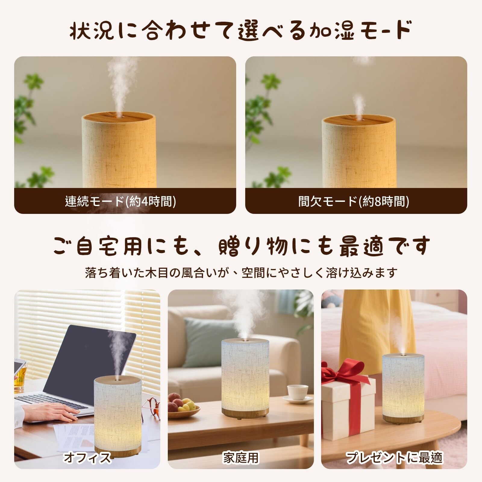 加湿器 新モデル アロマディフューザー 小型 除菌 超音波式 卓上型 省エネ 静音 空焚き防止 LED暖白ライト お手入れ簡単 寝室・部屋・オフィス用 乾燥対策 ギフトにも最適 (布調デザイン)