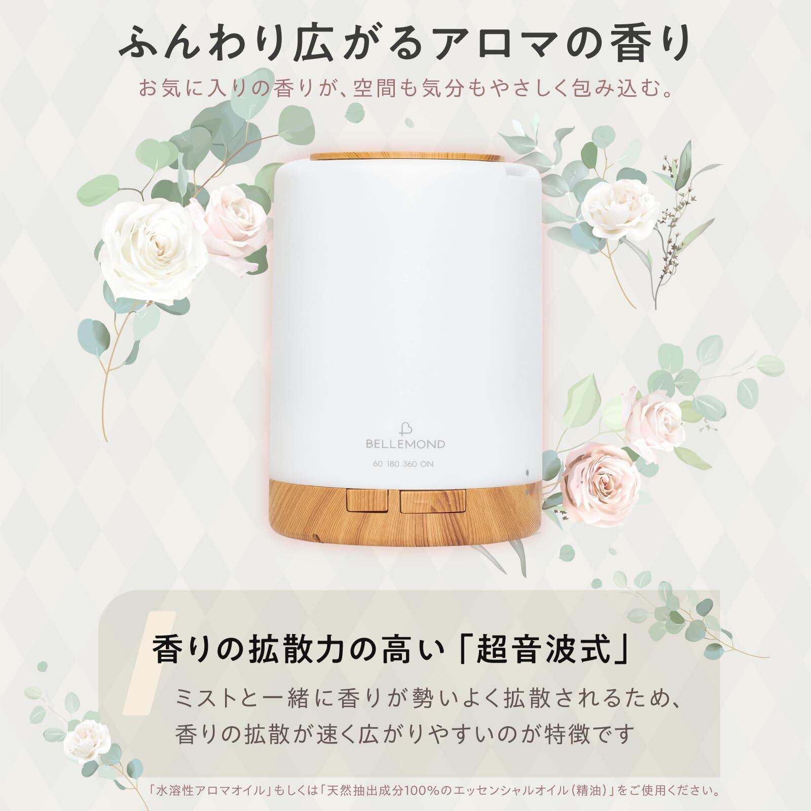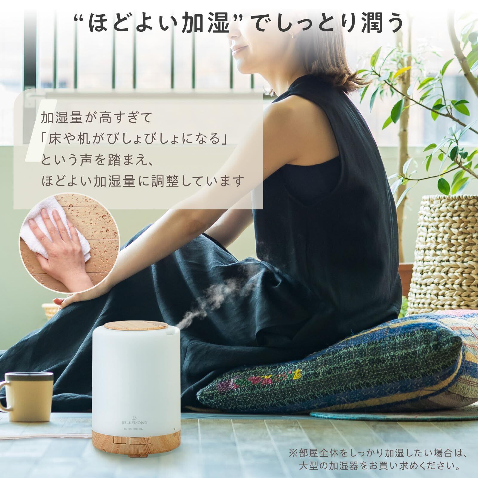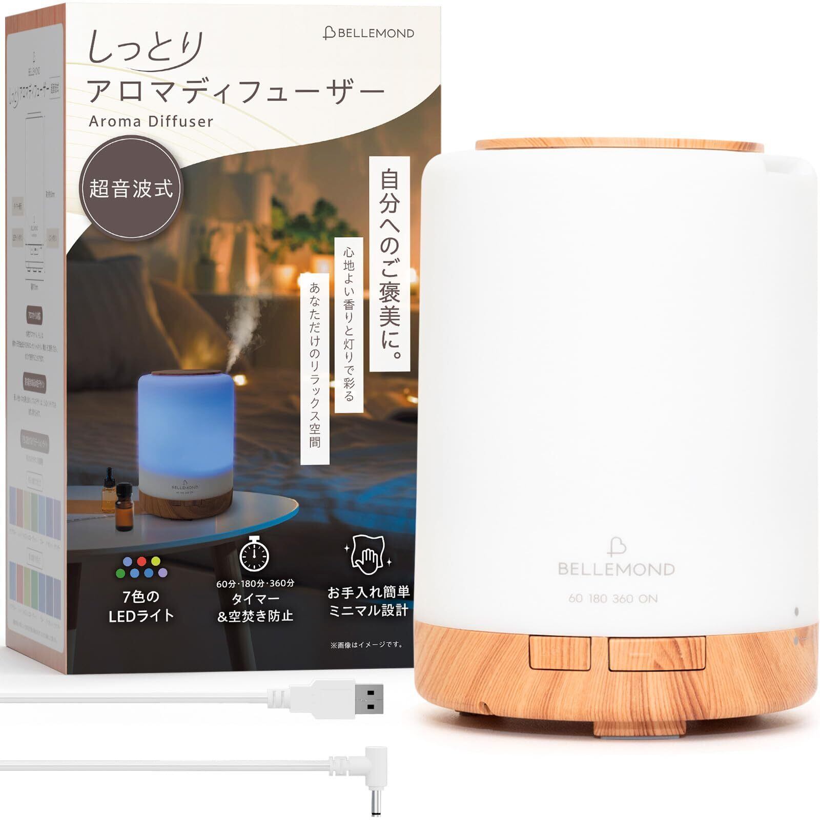 ベルモンド 加湿器 小型 卓上 代わりにも アロマディフューザー 超音波式 ワンルーム おしゃれ 木目調 7色LEDライト 3段階タイマー付き 静音 空焚き防止 お手入れ簡単 アロマ対応 300ml しっとりアロマディフューザー B1382