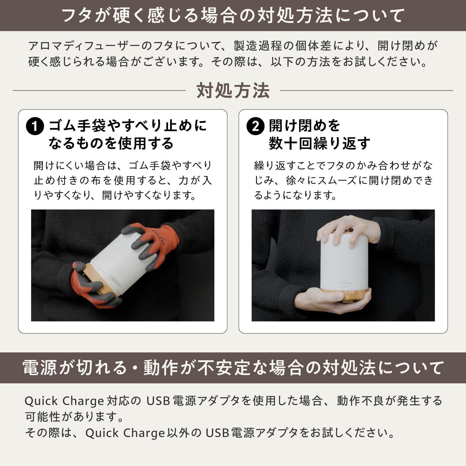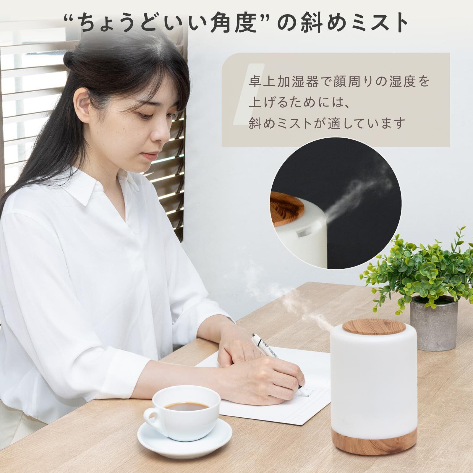【ほどよい加湿量】しっとりアロマディフューザーでは、「アロマディフューザーの使用で床や机が濡れてしまう」とのお声を受け、アロマがしっかり香る、適度なミスト量に調整しています。個人差はありますが、小型の卓上加湿器のように湿度を感じる方もいらっしゃいます。【加湿機能について】※本製品はアロマディフューザーであり、部屋全体を加湿するほどの加湿量はありません。【斜めミスト】ミストは真上ではなく斜めに噴出されるため、香りを特定の方向に向けたい場合など、角度の調整がしやすい仕様となっています。【USB電源】モバイルバッテリーなどでも使用可能です。