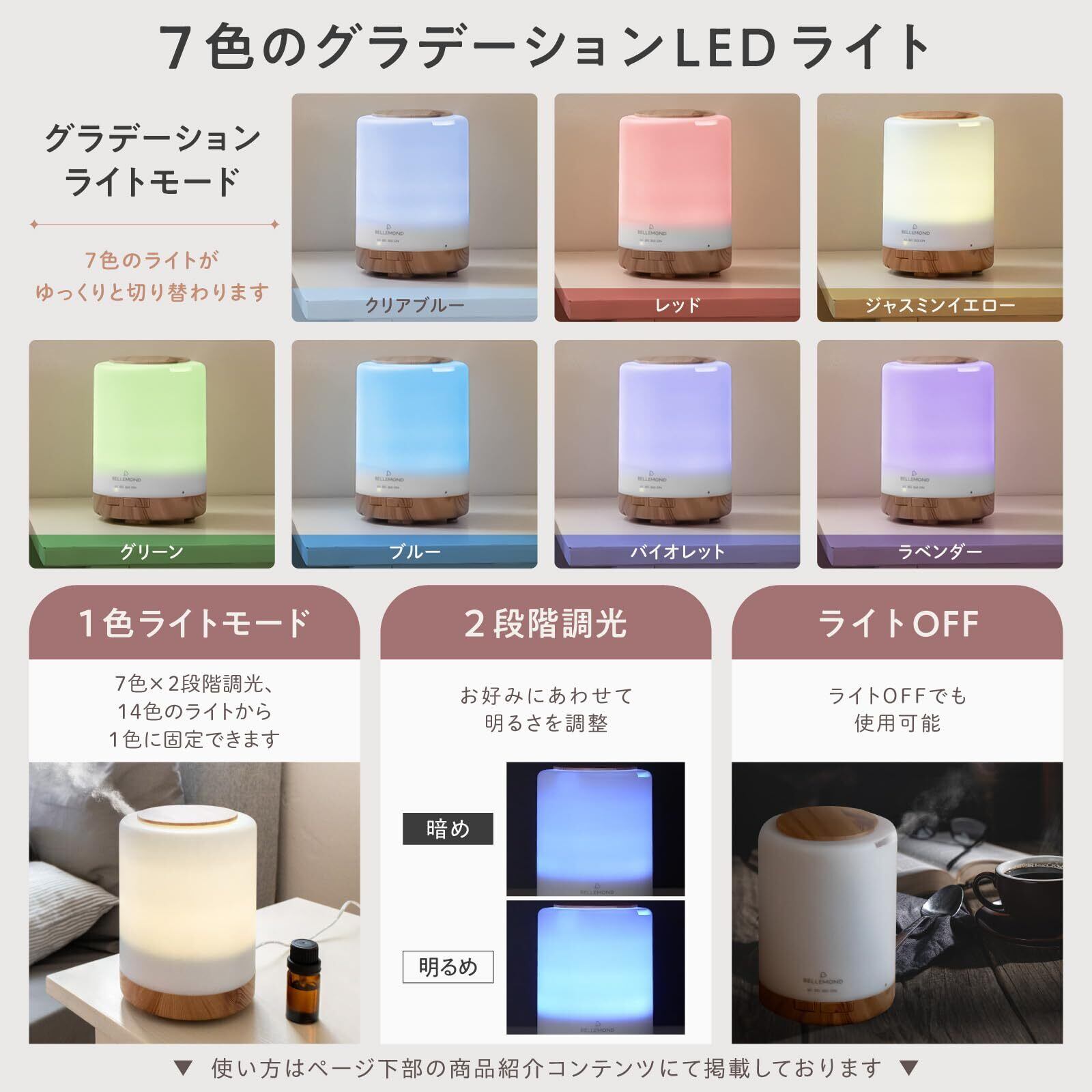 【7色のLEDライト】7色のグラデーションLEDライトを採用。各色は2段階の明るさ調整が可能で、特定のカラーに固定することもできます。ライトをOFFにして使用することも可能です。間接照明代わりにも。【タイマー機能】常時作動に加え、60分・180分・360分のタイマー設定が可能です。【空焚き防止機能】タイマー非使用時でも、水がなくなると自動的に電源がOFFになります。【簡単お手入れ】3日に1回のお手入れで、清潔に保てます。お手入れ方法はページ下部の動画、またはマニュアルページにてご確認ください。